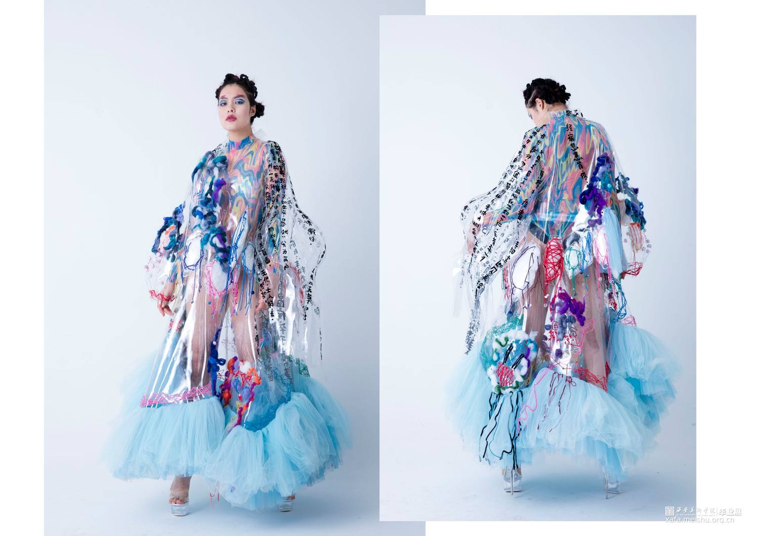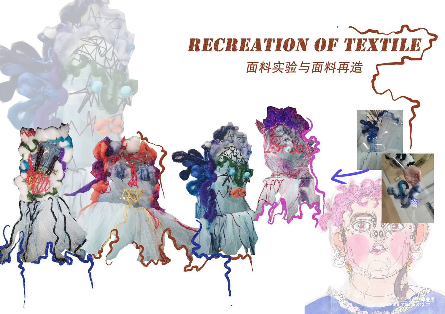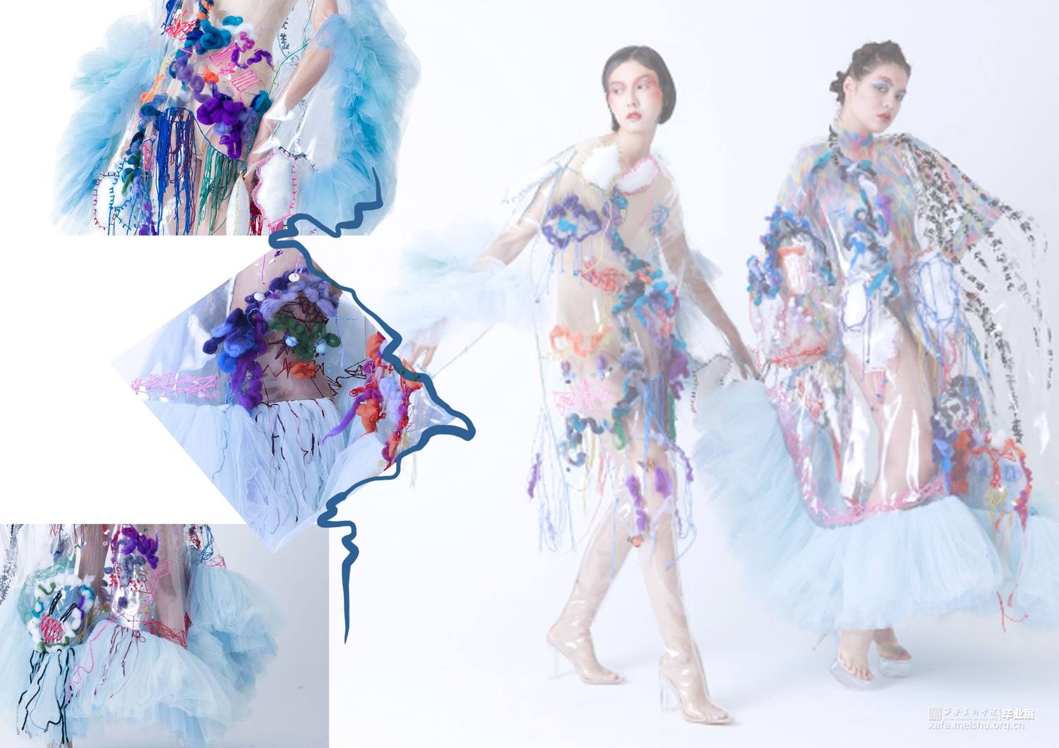 设计作品将夸张硬朗的外造型,搭配柔软的针织再造,整体设计采用透明PVC、可塑性针织再造以及刺绣工艺混搭于现代趣味运动时尚设计当中,给人以新鲜的视觉感受。设计作品的面料采用富有现代科技感的PVC与大网眼纱的结合,与上衣下摆的硬挺轮廓的牙齿形成对比;色彩选取透明点缀彩色使整天更富有层次感,使之与色彩丰富的鬼怪形象形成对比。衣身上的鬼怪形象以及下摆的牙齿是我对鬼怪元素进行解构、提取后与趣味运动时尚设计结合运用的综合体现,使其适合于衣袖造型,传达出传统与时尚科技的相互冲撞、融合的设计理念,给人以“有思想、有特点、有灵性”的冲击视角,具有强烈的当代女性的时尚与个性特征。。