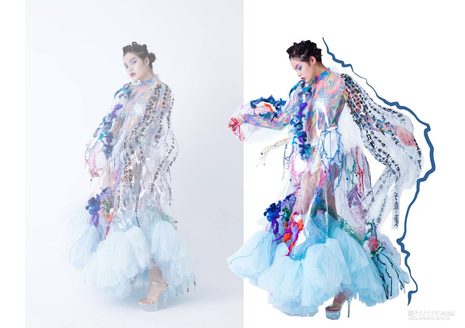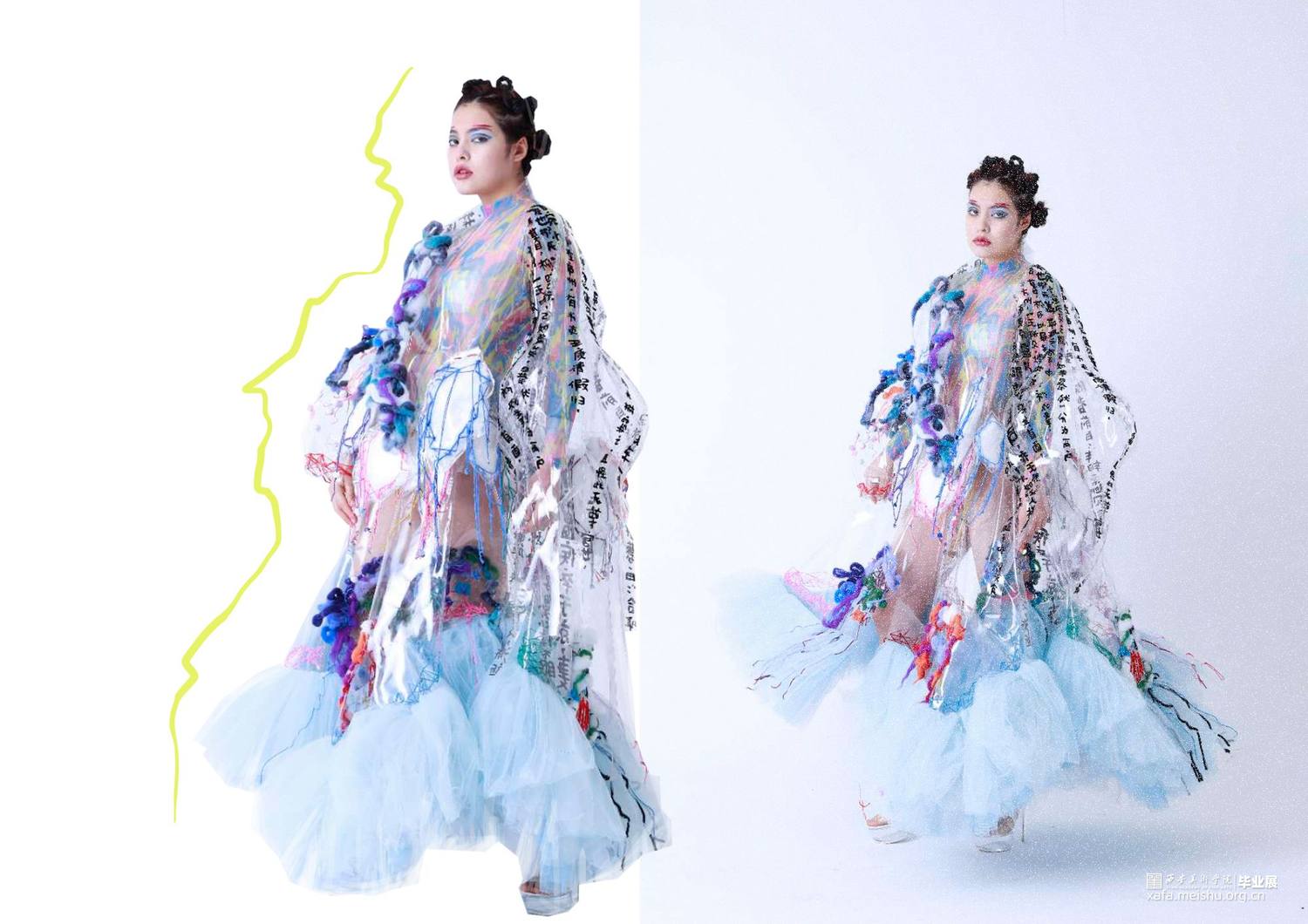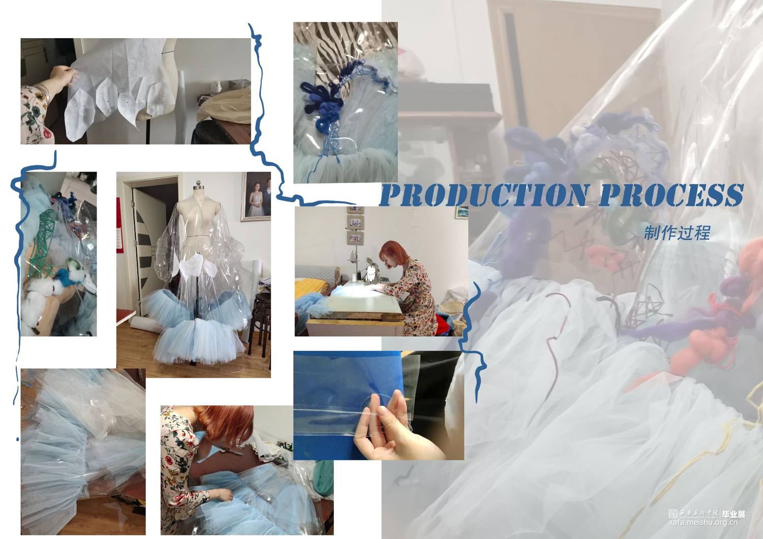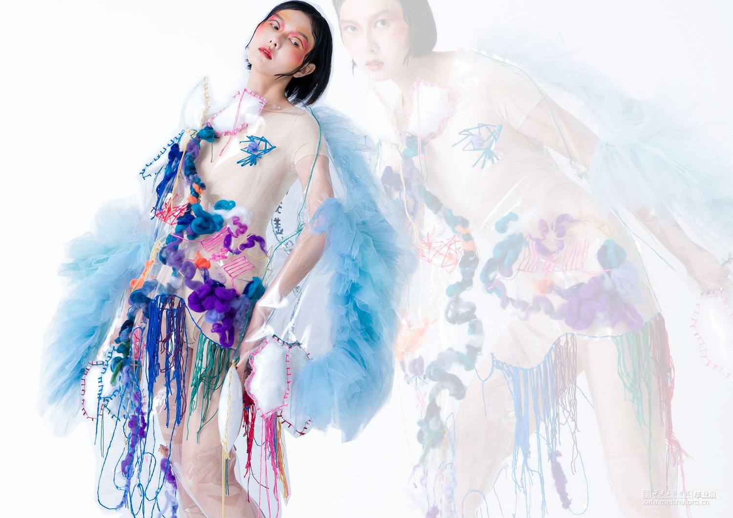 设计作品将夸张硬朗的外造型,搭配柔软的针织再造,整体设计采用透明PVC、可塑性针织再造以及刺绣工艺混搭于现代趣味运动时尚设计当中,给人以新鲜的视觉感受。设计作品的面料采用富有现代科技感的PVC与大网眼纱的结合,与上衣下摆的硬挺轮廓的牙齿形成对比;色彩选取透明点缀彩色使整天更富有层次感,使之与色彩丰富的鬼怪形象形成对比。衣身上的鬼怪形象以及下摆的牙齿是我对鬼怪元素进行解构、提取后与趣味运动时尚设计结合运用的综合体现,使其适合于衣袖造型,传达出传统与时尚科技的相互冲撞、融合的设计理念,给人以“有思想、有特点、有灵性”的冲击视角,具有强烈的当代女性的时尚与个性特征。。