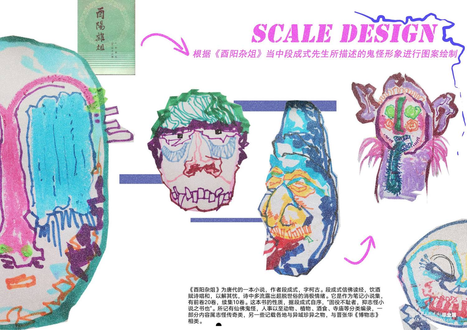 设计灵感来源于《酉阳杂俎》中鬼怪类故事,将其元素进行解构、提取融入趣味运动设计之中,适合于大胆创新的时尚外造型,作品传达出传统与时尚的相互碰撞、融合的设计理念,通过趣味运动时尚的造型和搭配来体现鬼怪类元素的精神内涵,对陕西唐代文学的传承和发扬以及现代趣味运动时尚设计的发展与创新有着重要的意义。