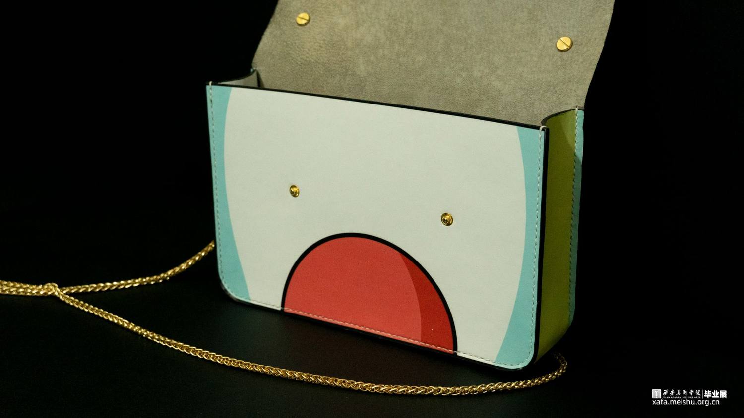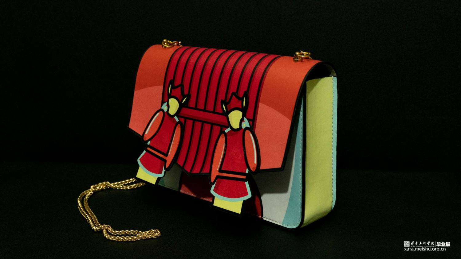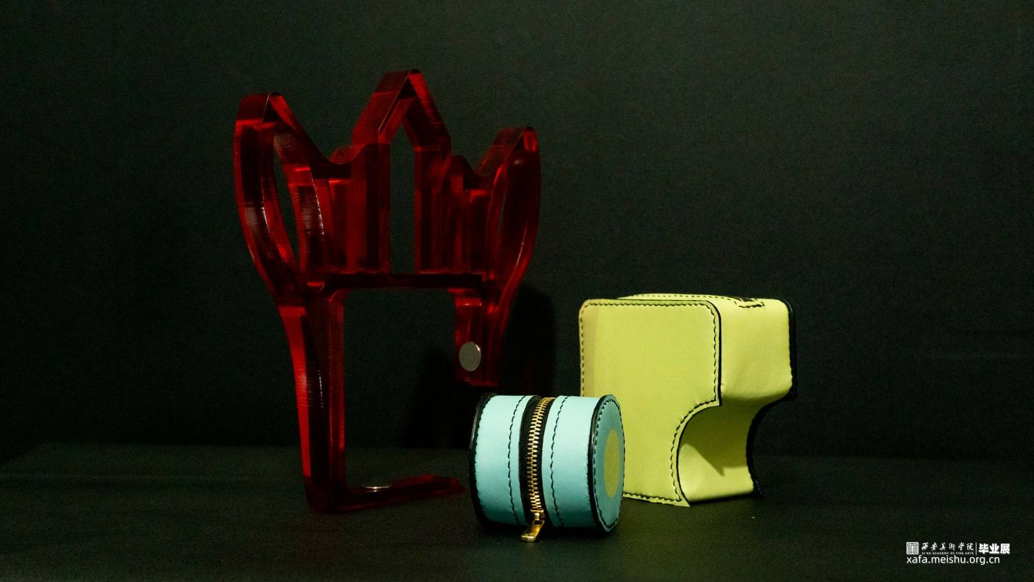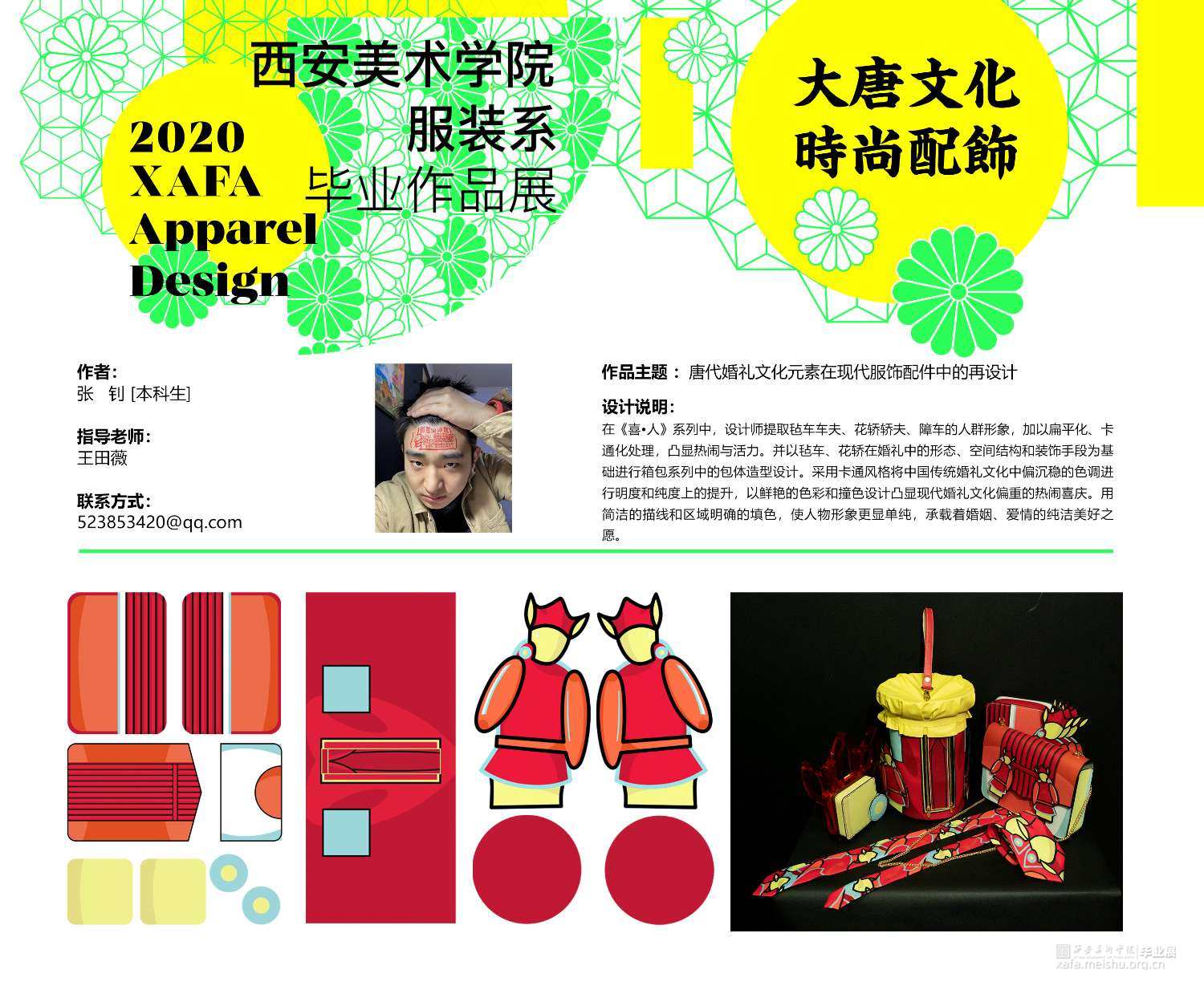 在《喜•人》系列中,设计师提取毡车车夫、花轿轿夫、障车的人群形象,加以扁平化、卡通化处理,凸显热闹与活力。并以毡车、花轿在婚礼中的形态、空间结构和装饰手段为基础进行箱包系列中的包体造型设计。采用卡通风格将中国传统婚礼文化中偏沉稳的色调进行明度和纯度上的提升,以鲜艳的色彩和撞色设计凸显现代婚礼文化偏重的热闹喜庆。用简洁的描线和区域明确的填色,使人物形象更显单纯,承载着婚姻、爱情的纯洁美好之愿。