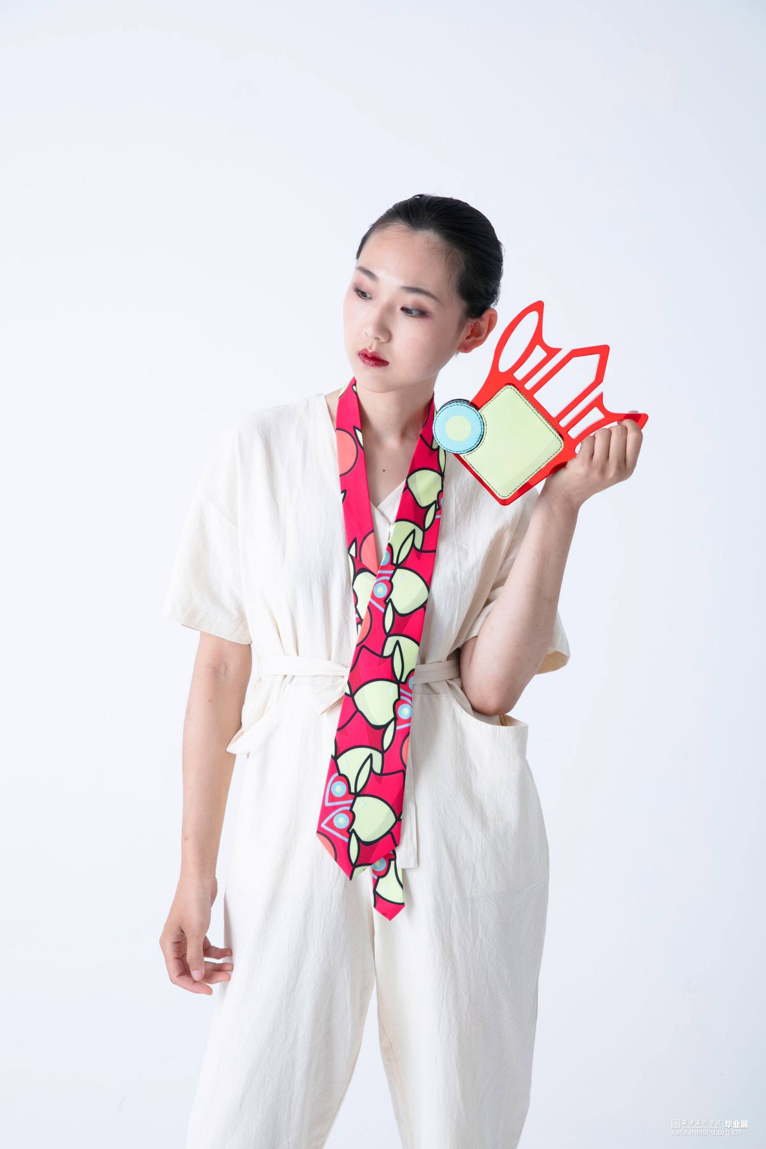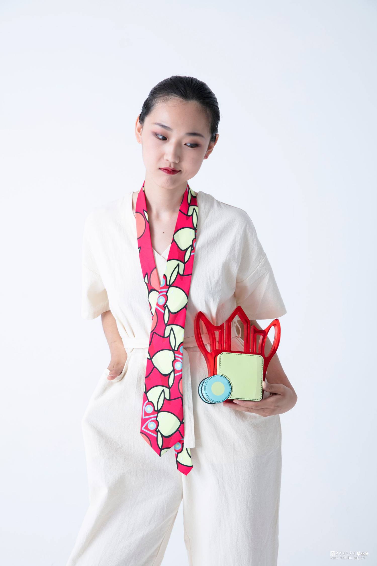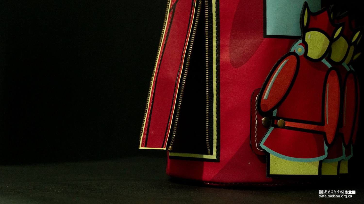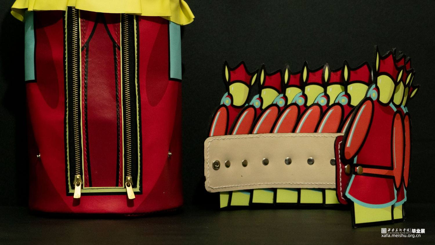 在《喜•人》系列中,设计师提取毡车车夫、花轿轿夫、障车的人群形象,加以扁平化、卡通化处理,凸显热闹与活力。并以毡车、花轿在婚礼中的形态、空间结构和装饰手段为基础进行箱包系列中的包体造型设计。采用卡通风格将中国传统婚礼文化中偏沉稳的色调进行明度和纯度上的提升,以鲜艳的色彩和撞色设计凸显现代婚礼文化偏重的热闹喜庆。用简洁的描线和区域明确的填色,使人物形象更显单纯,承载着婚姻、爱情的纯洁美好之愿。