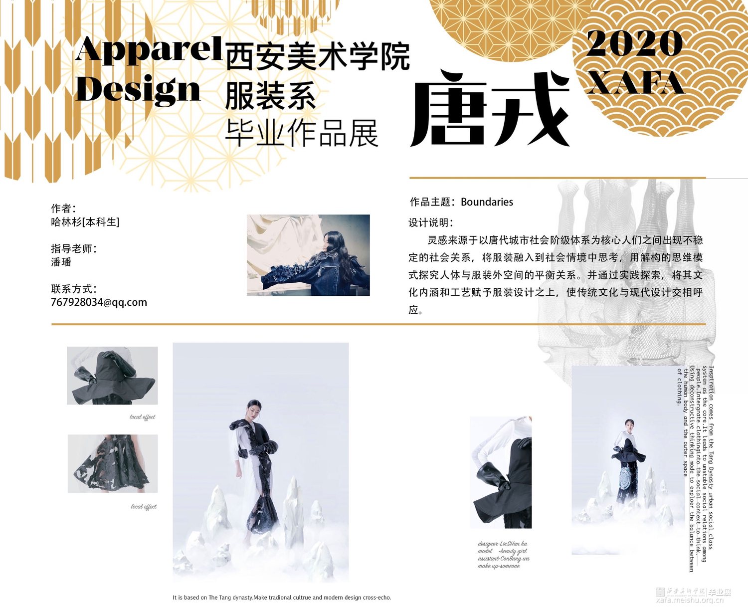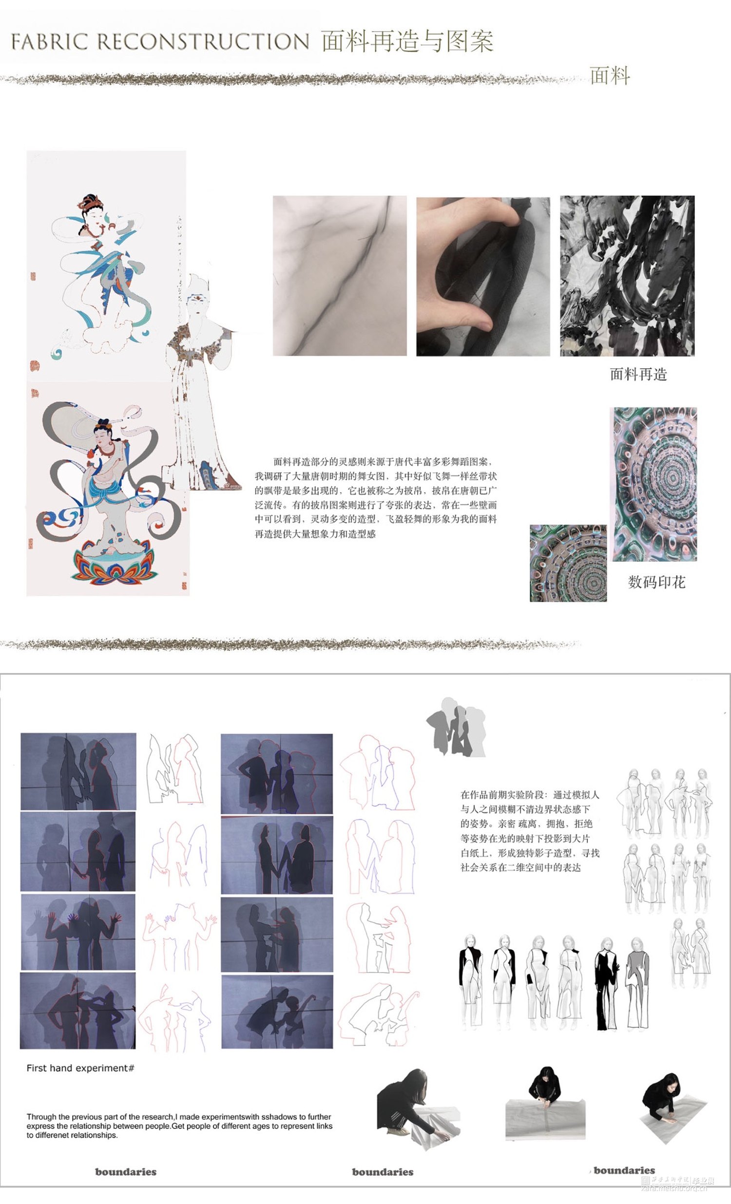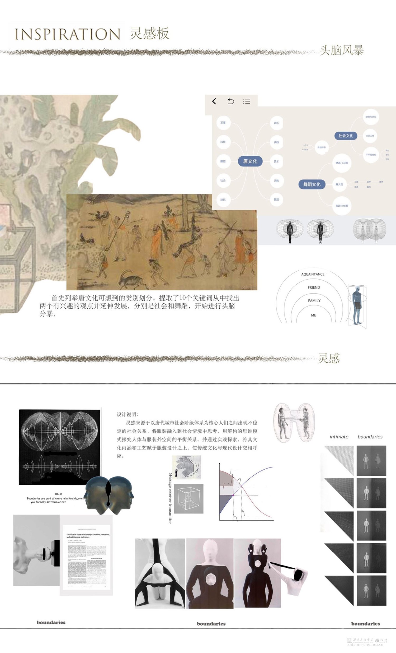 该作品灵感源于以唐代城市社会阶级体系为核心人们之间出现的不稳定的社会关系,将服装融入到社会情境中思考,用解构的思维模式探究人体与服装外空间的平衡关系。并通过实践探索,将其文化内涵和工艺赋予服装设计之上,使传统文化与现代设计交相呼应。