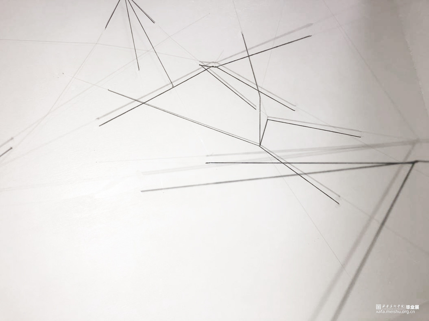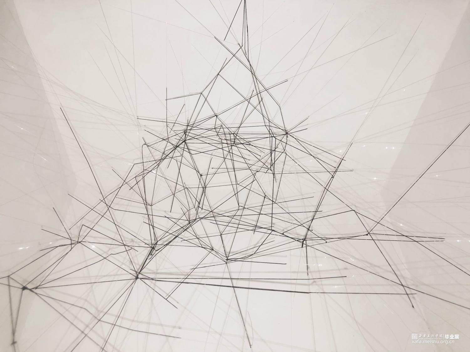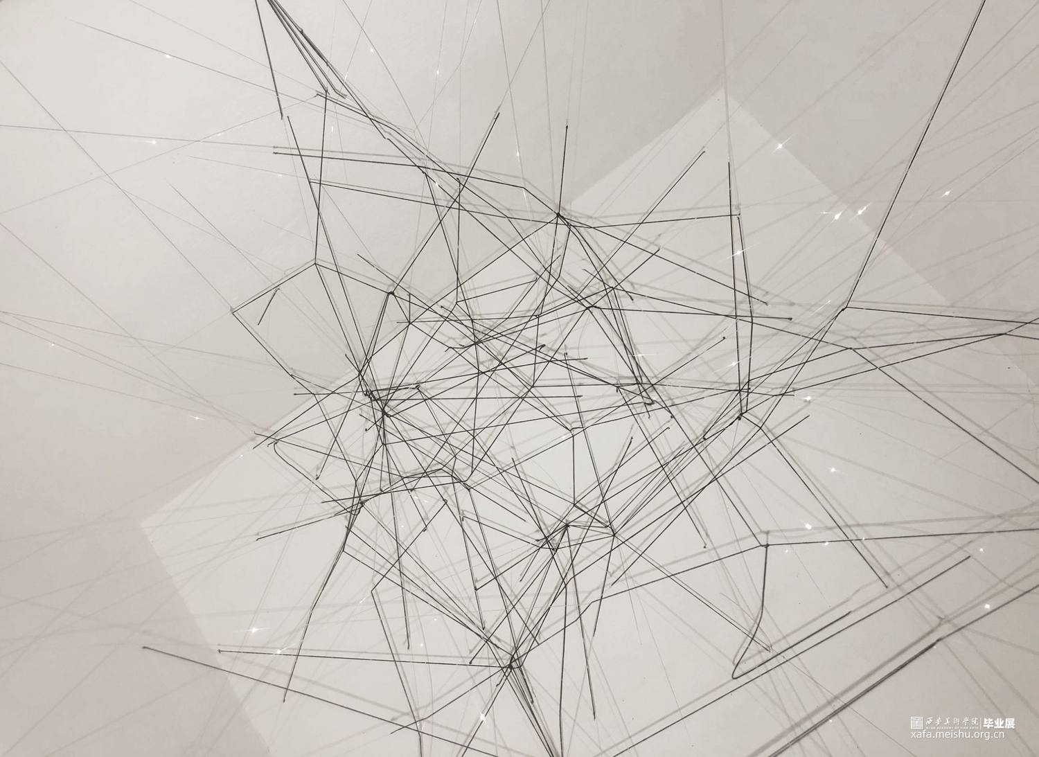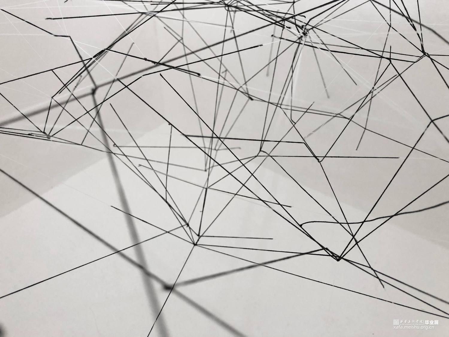 作品的制作过程是在定制好的方形空间内部均匀喷漆,再用0.5mm的打孔枪打洞。在绳子顶端绑上鱼线后穿过洞口,用绝缘胶固定洞口的另一端。 在固定的时候要时刻注意形体的感觉和变化,是感性与理性的交融,在视觉上呈现错乱但却有迹可循的观感。线与线之间互相拉扯影响,根根交错,疏密有致。作品通过皮筋拉扯的方式,将人紧绷的神经形象化,展现了面对未知的人类时刻无法放松的心态以及长期弥漫的焦虑。这些抽象的事物具象化为紧绷的线条,就像在脑海里紧绷的十二对神经,断裂则意识荒芜,精神颓废。