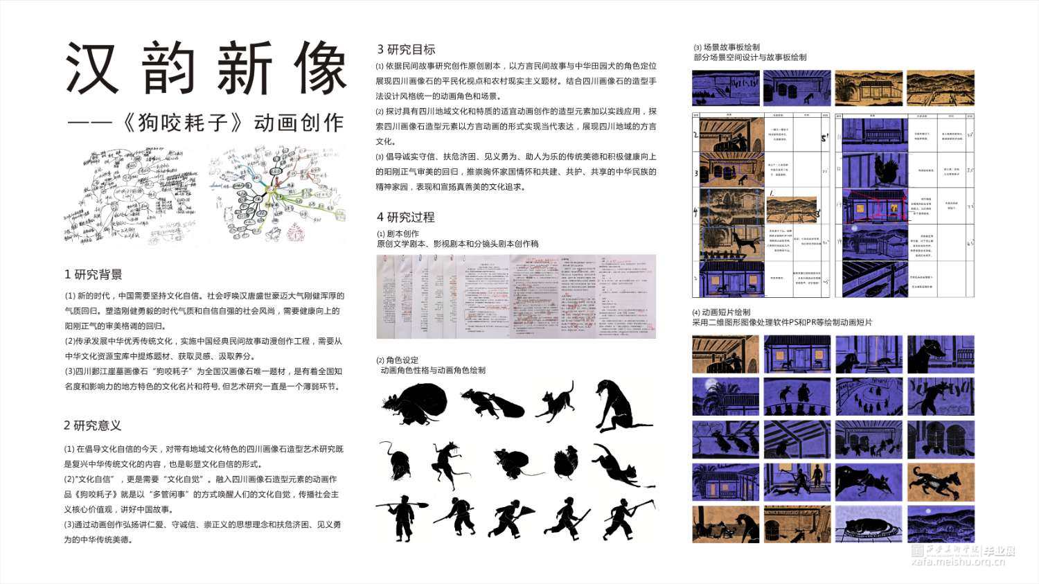 作品的选题基于传统文化复兴、地域文化多样性、动画造型语言民族化需要的时代背景。在收集整理四川汉画像石图片资料,充分开展项目调研和人物访谈的基础上,进行动画作品的原创文学剧本、影视剧本、分镜头剧本的多次修改、创作,完成动画角色设定、场景设计和动画故事版的绘制,后期原创配音配乐,音效现场实录。作品结合镜头的叙事特性,实现四川汉画像石造型手法在动画创作中的应用实践研究,探讨四川汉画像石传统民族元素在现代造型设计中的应用。