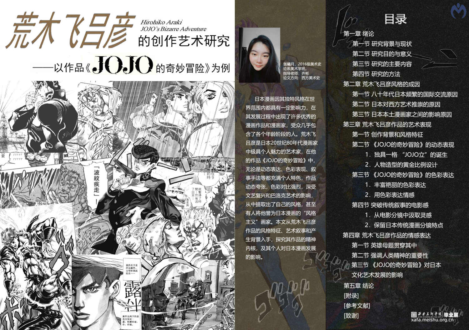 本文以荒木飞吕彦的作品漫画《JOJO的奇妙冒险》 为研究对象,通过梳理分析荒木飞吕彦的作品,从动态表现、色彩表达、叙事手法等,对其个人风格的形成做梳理分析,从而进一步深入分析其作品风格成因,再从作品的创作手法、语言形式、艺术风格入手,剖析其作品的艺术内涵及表现特色,探讨荒木飞吕彦作品中所具有的艺术价值及影响,以丰富荒木飞吕彦漫画的理论研究。