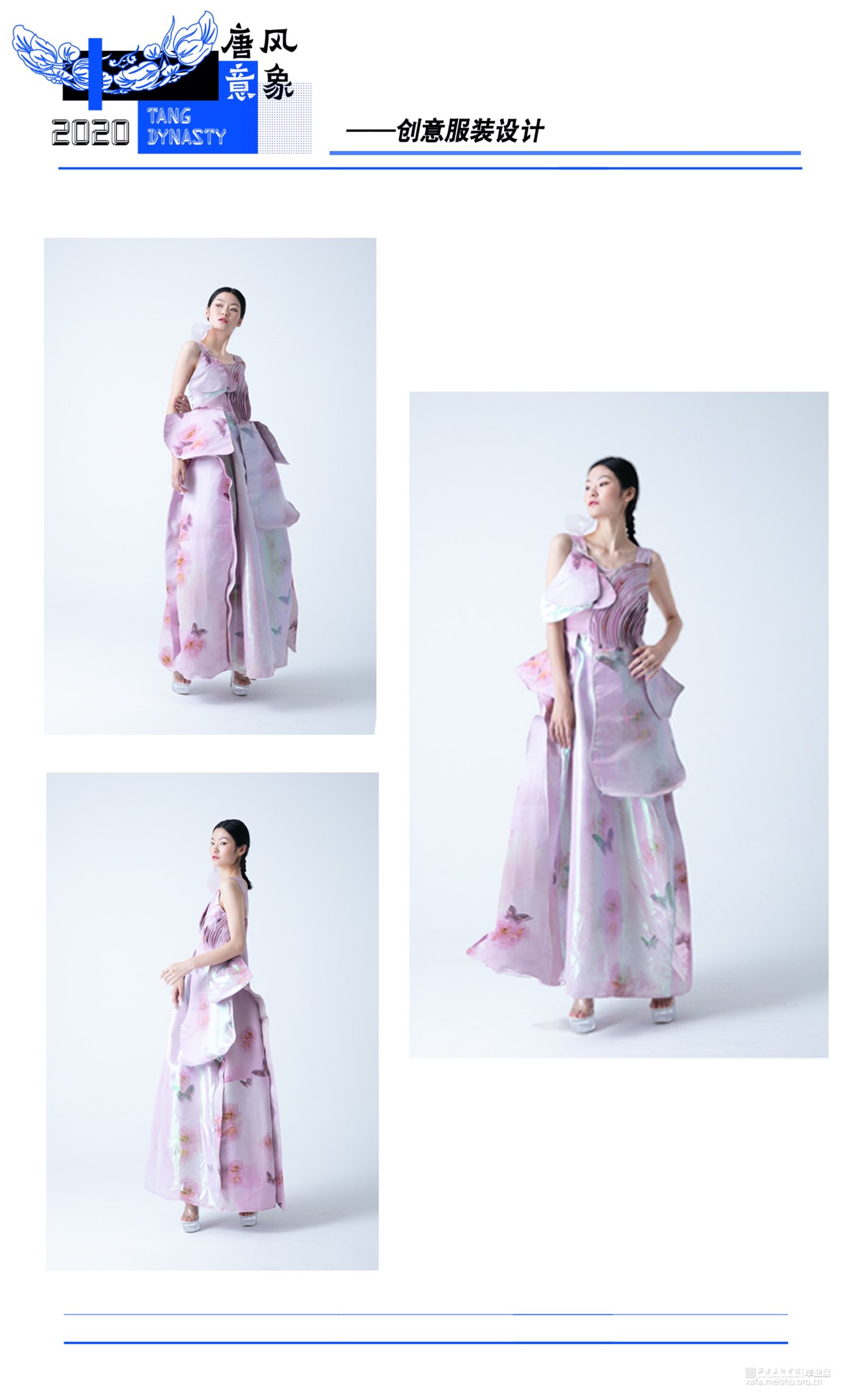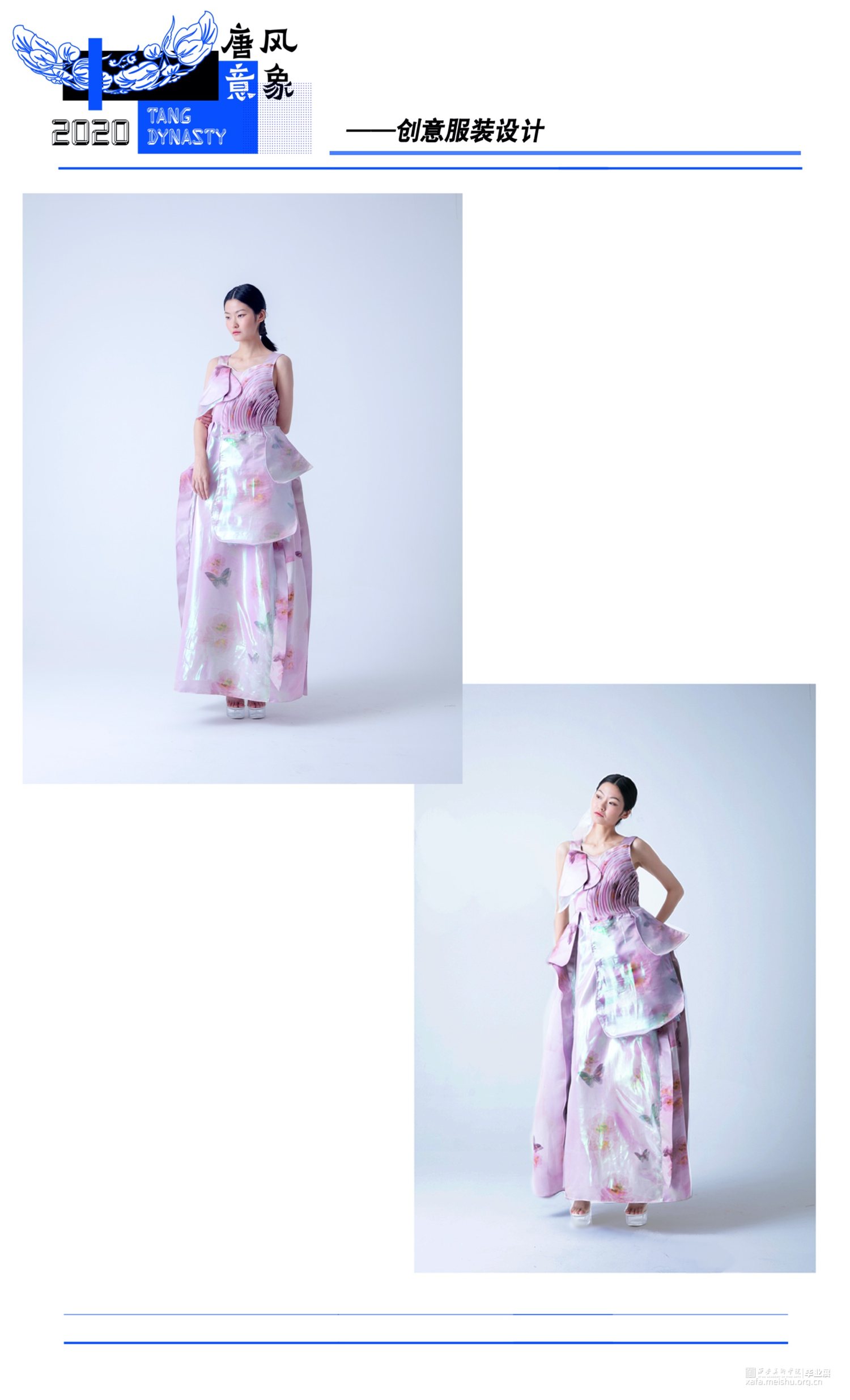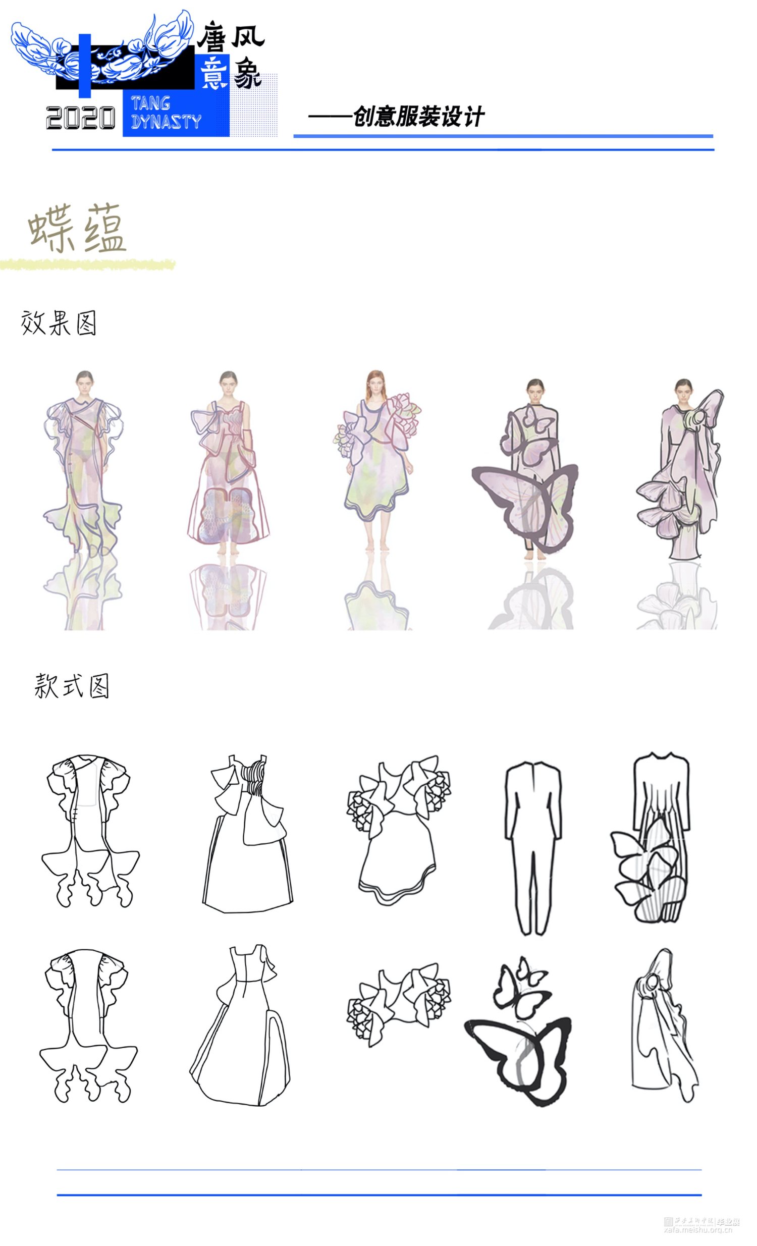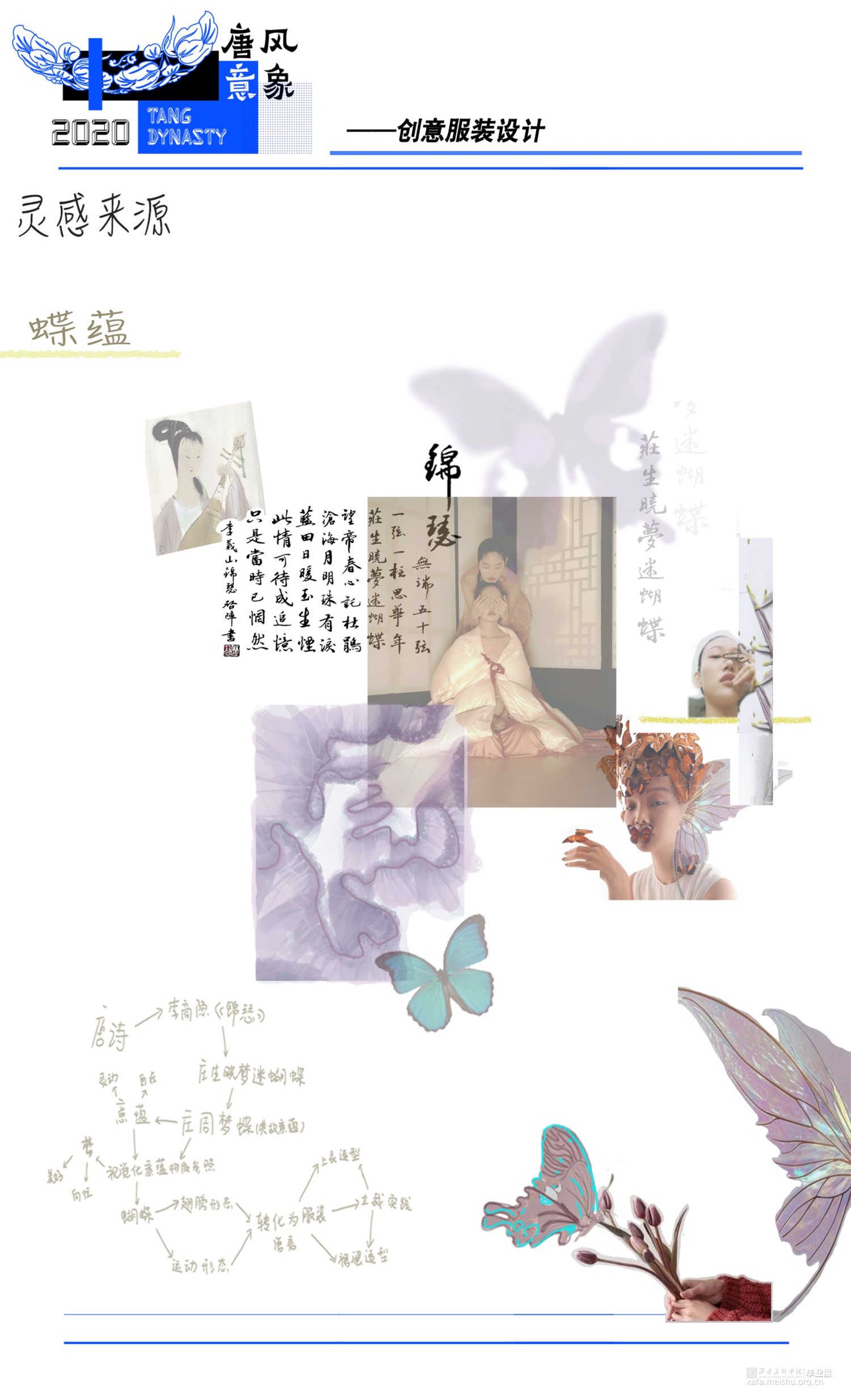 设计灵感来源于李商隐《锦瑟》里的“庄生晓梦迷蝴蝶”这句诗。通过对《锦瑟》这首诗有深入了解的论文和著作的学习参考,了解到李商隐在诗中引用庄周梦蝶典故的缘由。探究庄周梦蝶在《锦瑟》中的意蕴,并将此进行视觉化尝试。最后结合所学服装知识,把蝴蝶翅膀形态和运动形态与庄周梦蝶意蕴结合后融入服装造型中,完成设计创作。