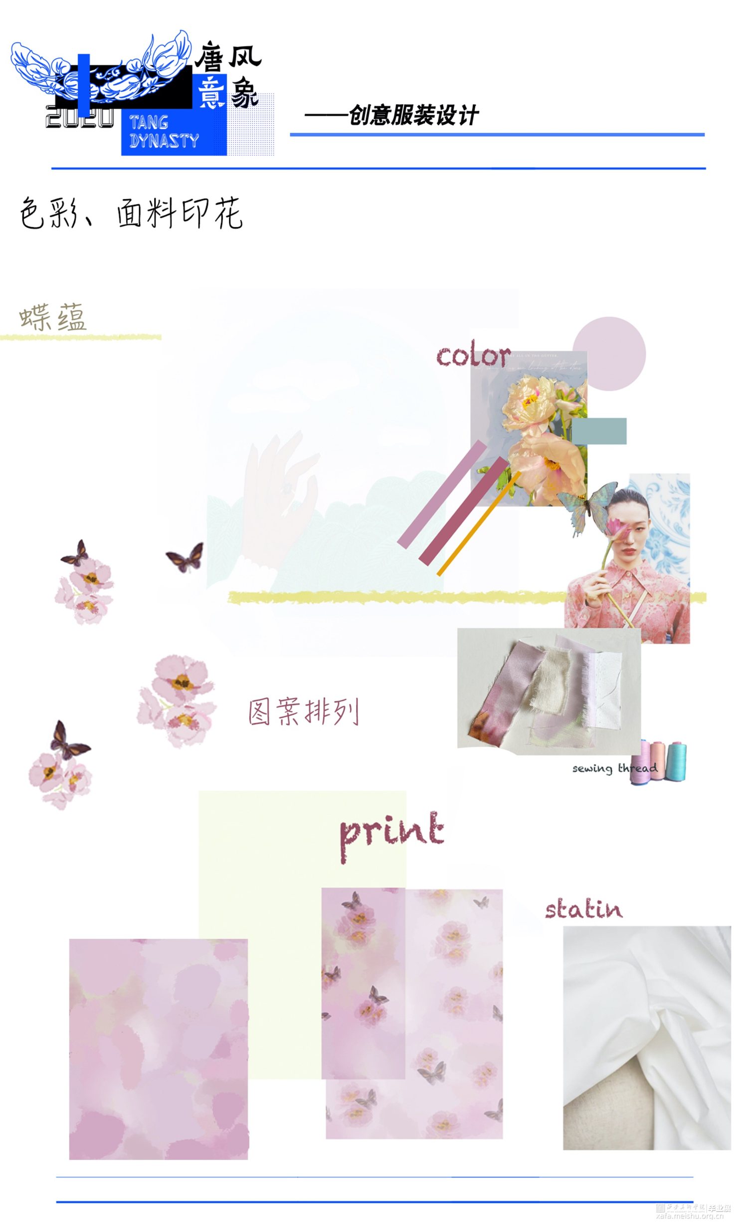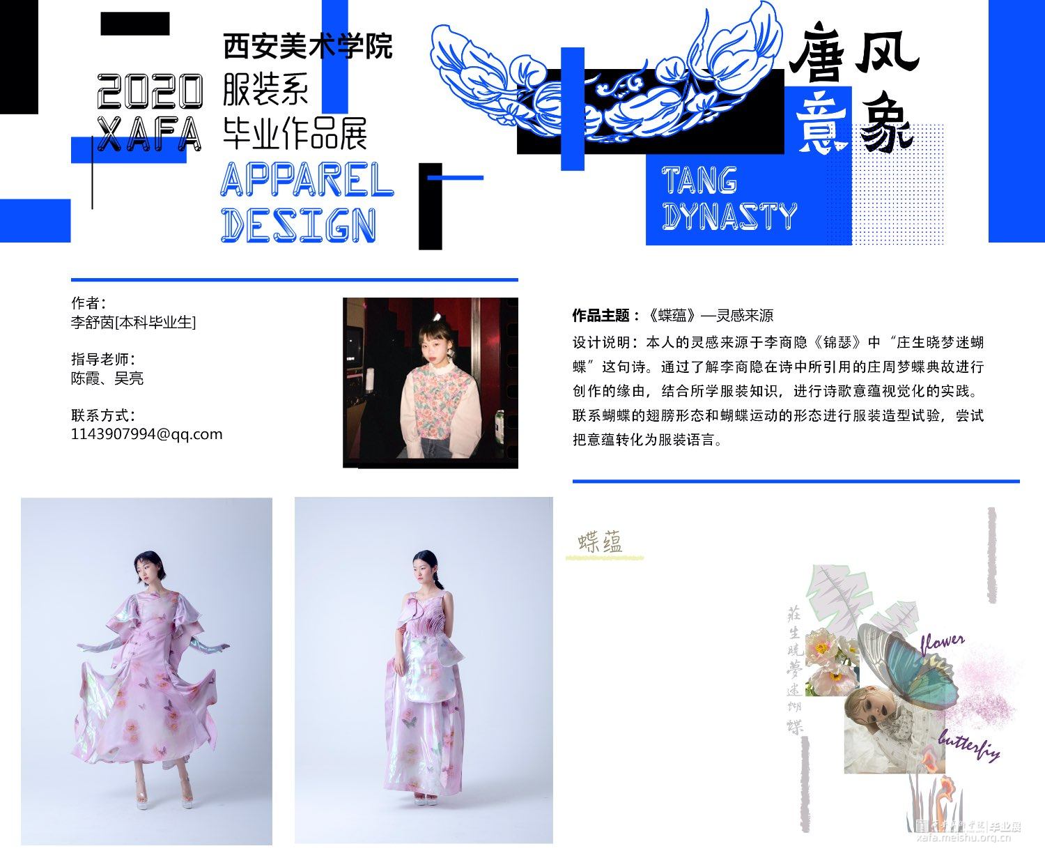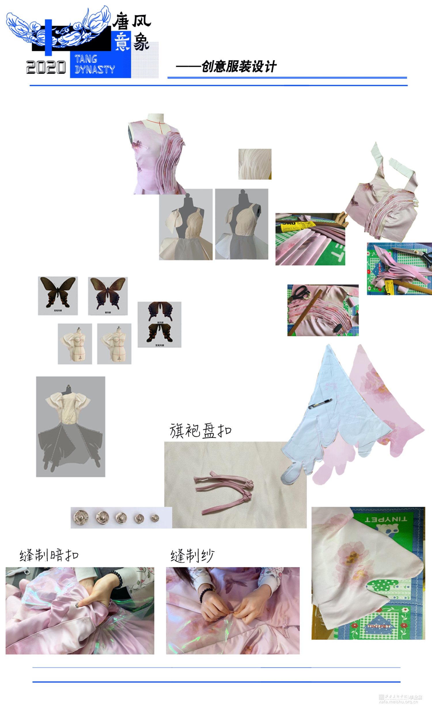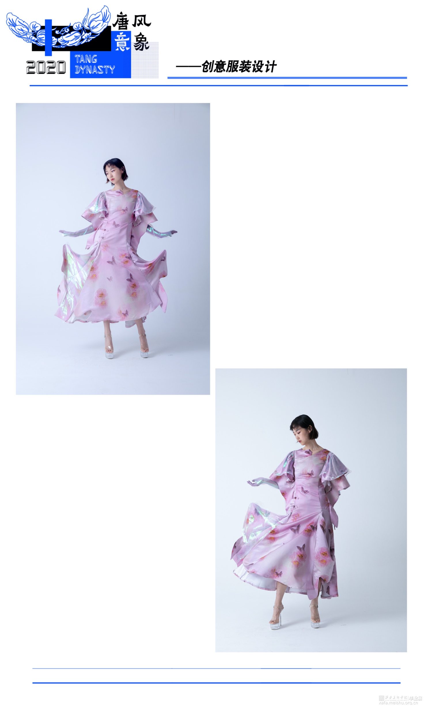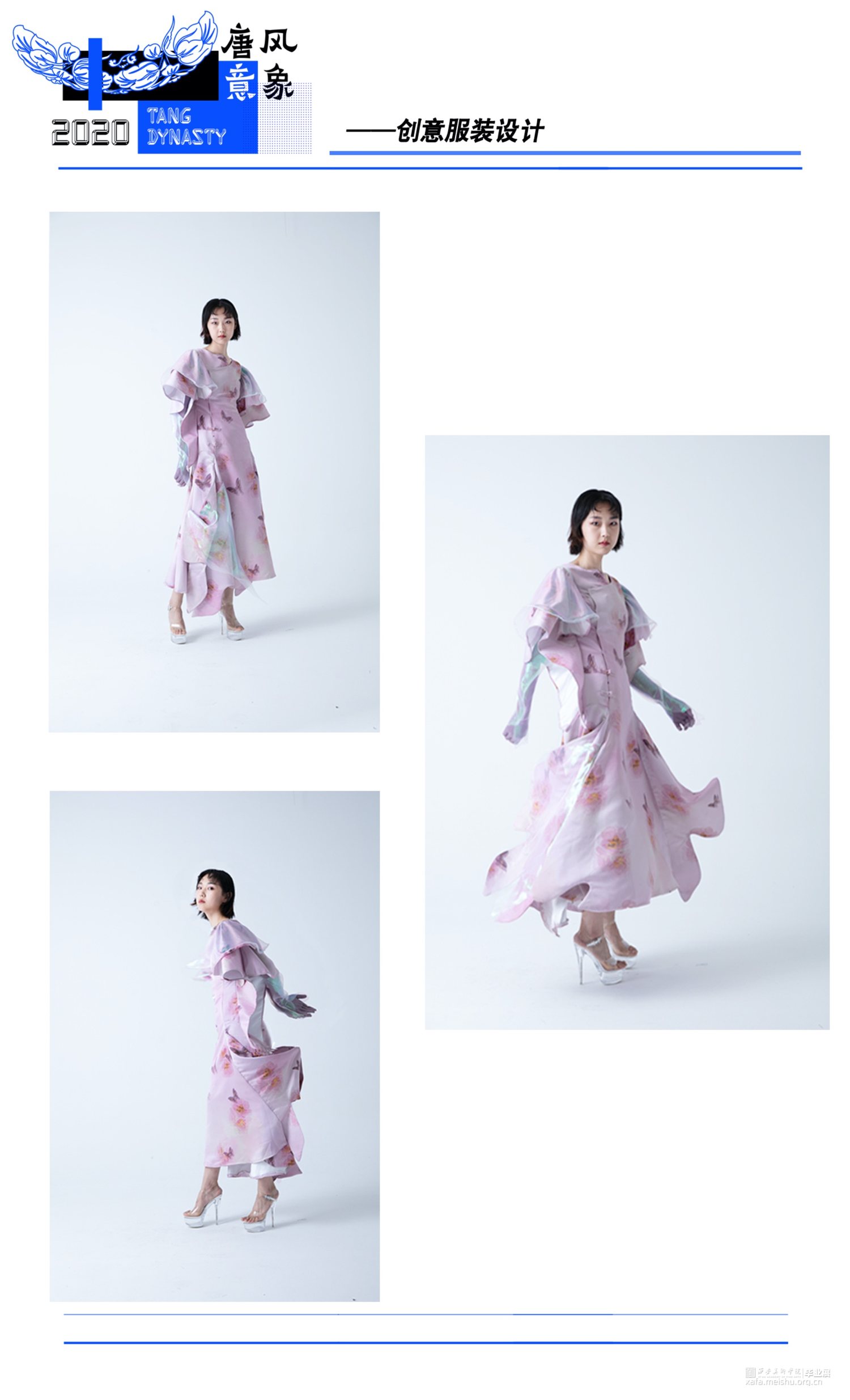 设计灵感来源于李商隐《锦瑟》里的“庄生晓梦迷蝴蝶”这句诗。通过对《锦瑟》这首诗有深入了解的论文和著作的学习参考,了解到李商隐在诗中引用庄周梦蝶典故的缘由。探究庄周梦蝶在《锦瑟》中的意蕴,并将此进行视觉化尝试。最后结合所学服装知识,把蝴蝶翅膀形态和运动形态与庄周梦蝶意蕴结合后融入服装造型中,完成设计创作。