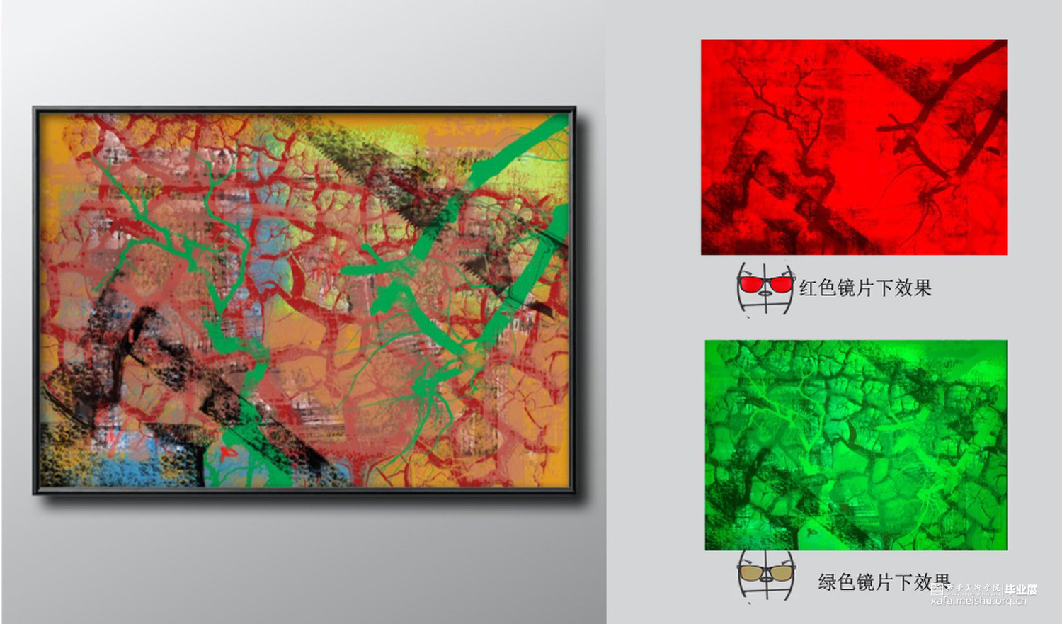 作品4《干枯》红色镜片下斧与锯的砍伐破坏,绿色镜片下干枯的河床;