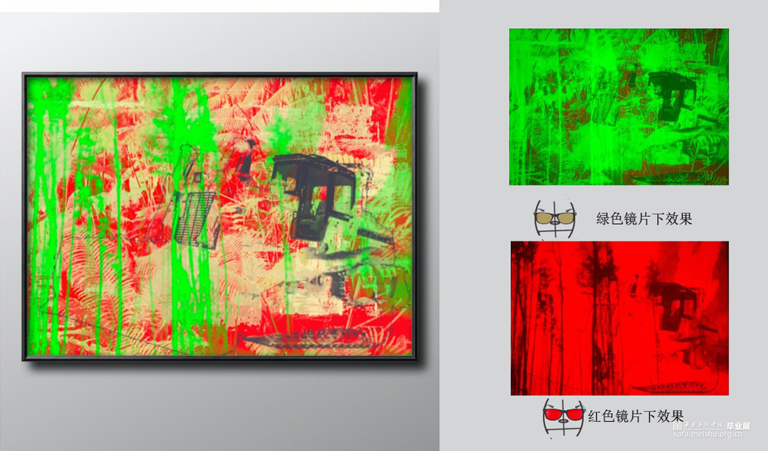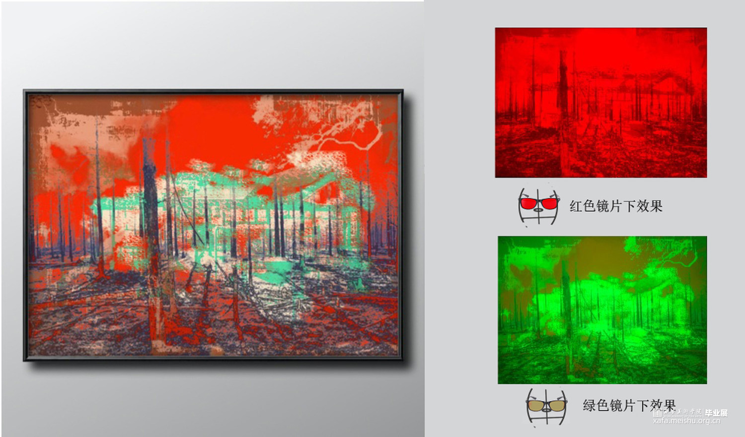 作品5《开发》红色镜片下人类的开发森林的衰退,绿色镜片下阳光照进有雾气的森林;