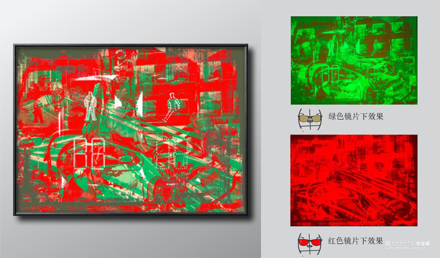 作品2《拆建》红色镜片下正在建造房子,绿色镜片下正在拆除房子;