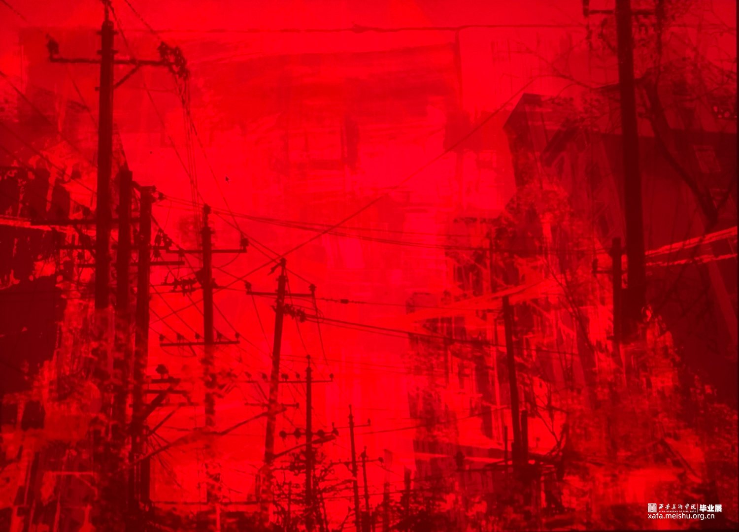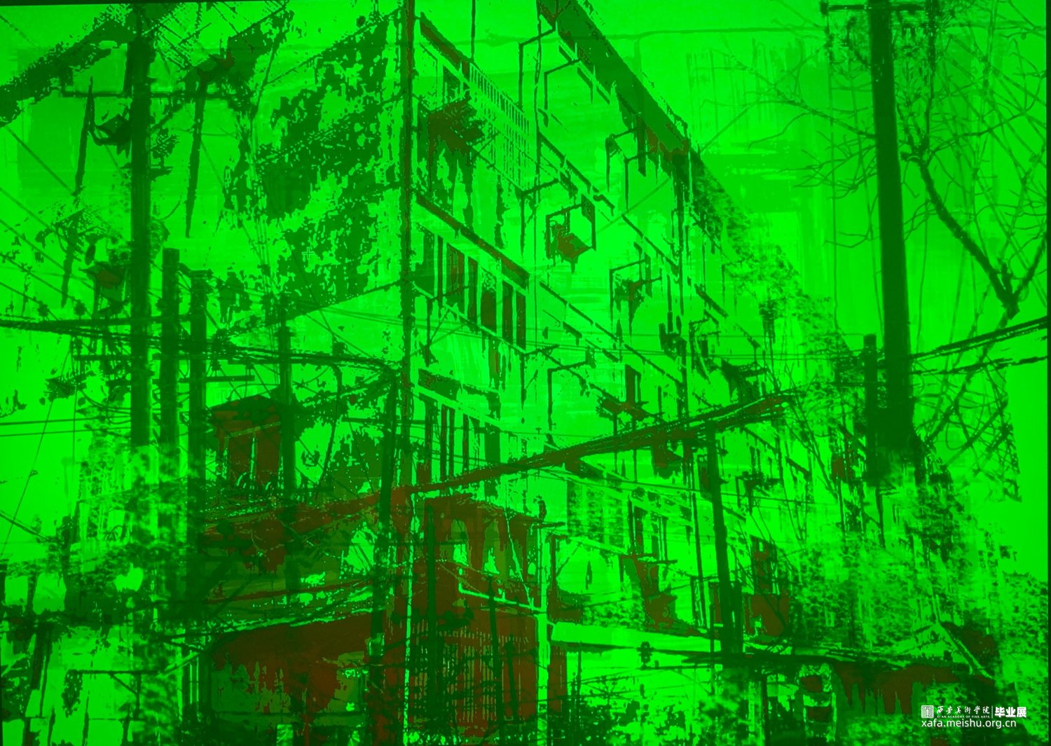 作品1《电线杆》红色镜片下老旧电线杆与崭新的楼房,绿镜片下老旧的电线杆与破旧的楼房;