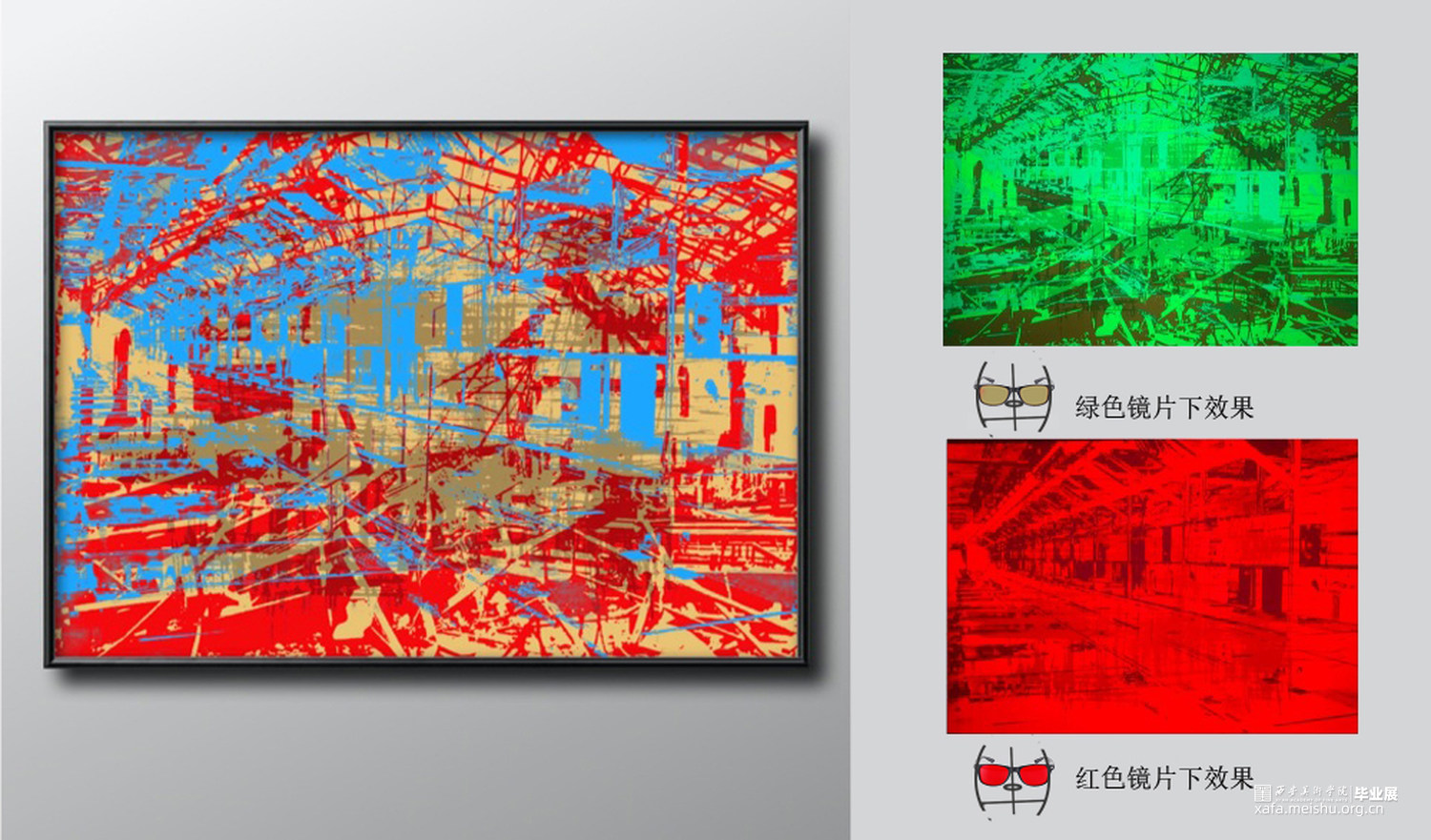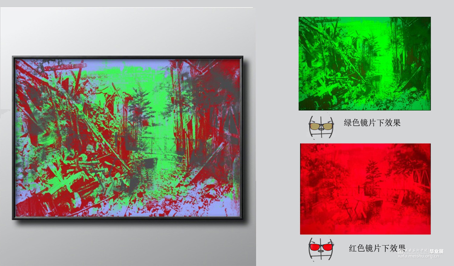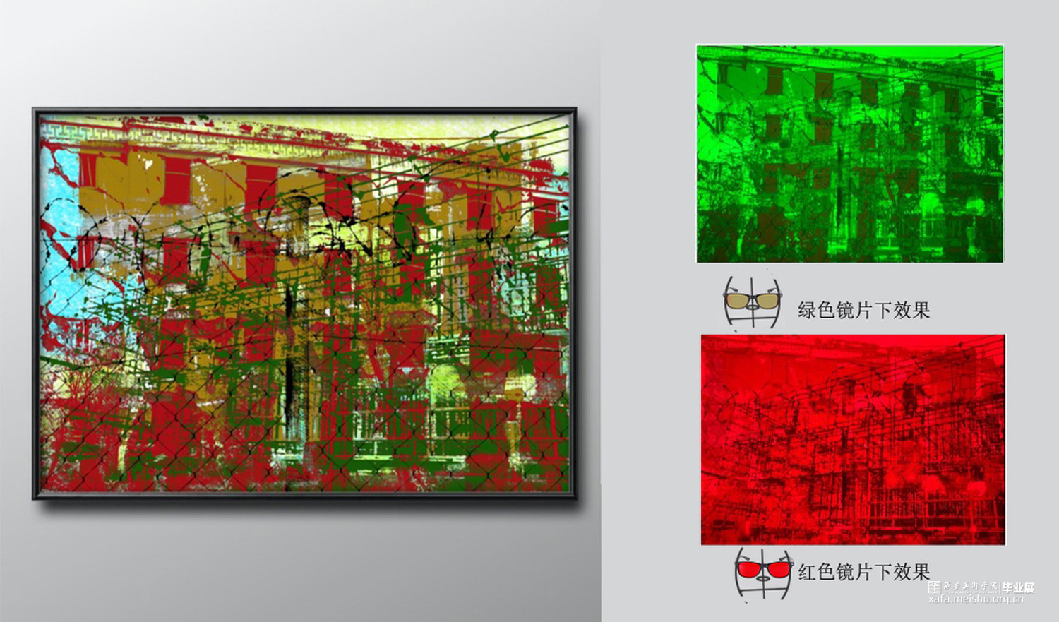 作品3《安逸》红色镜片下安逸的花园,绿色镜片下战争破坏的房屋;