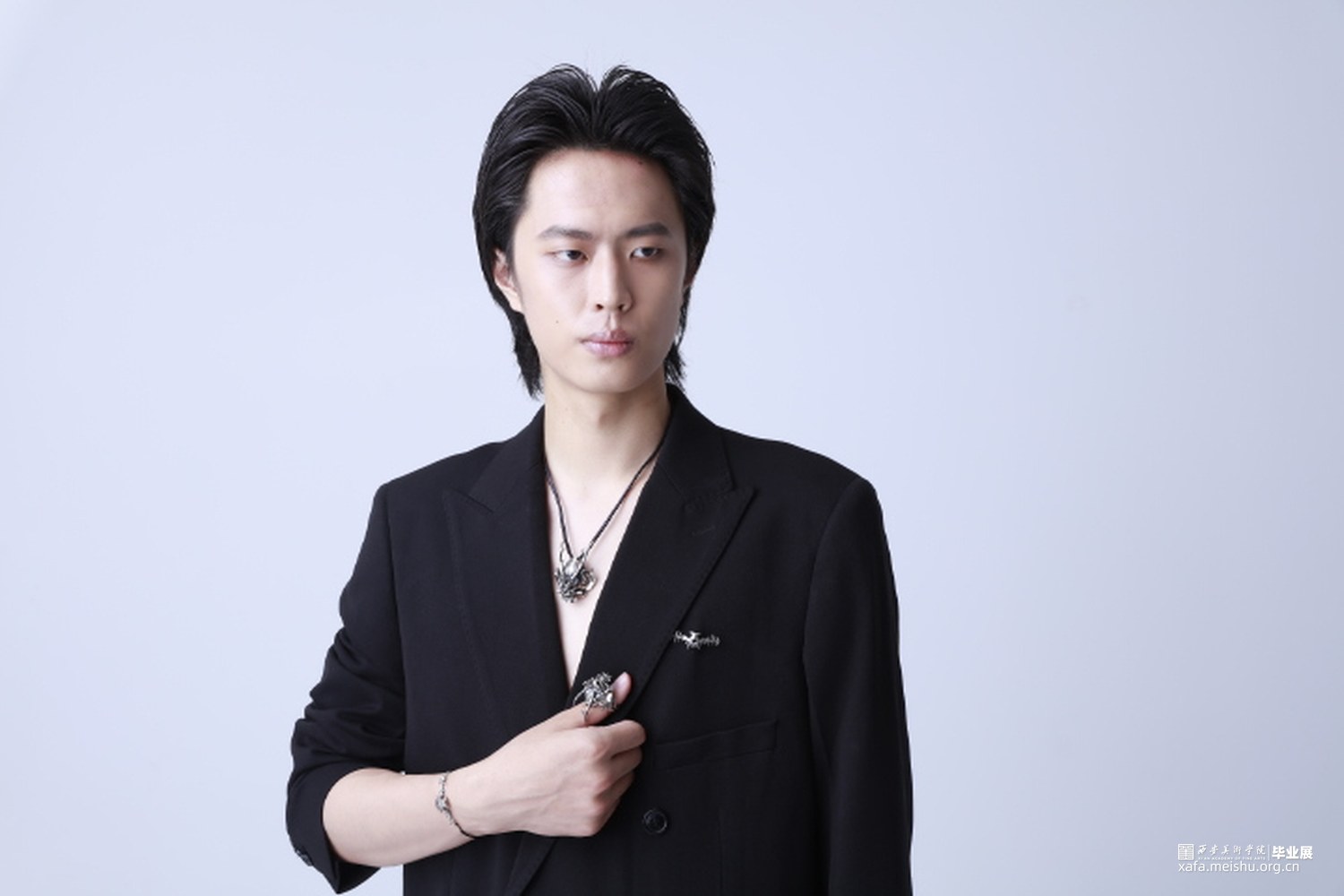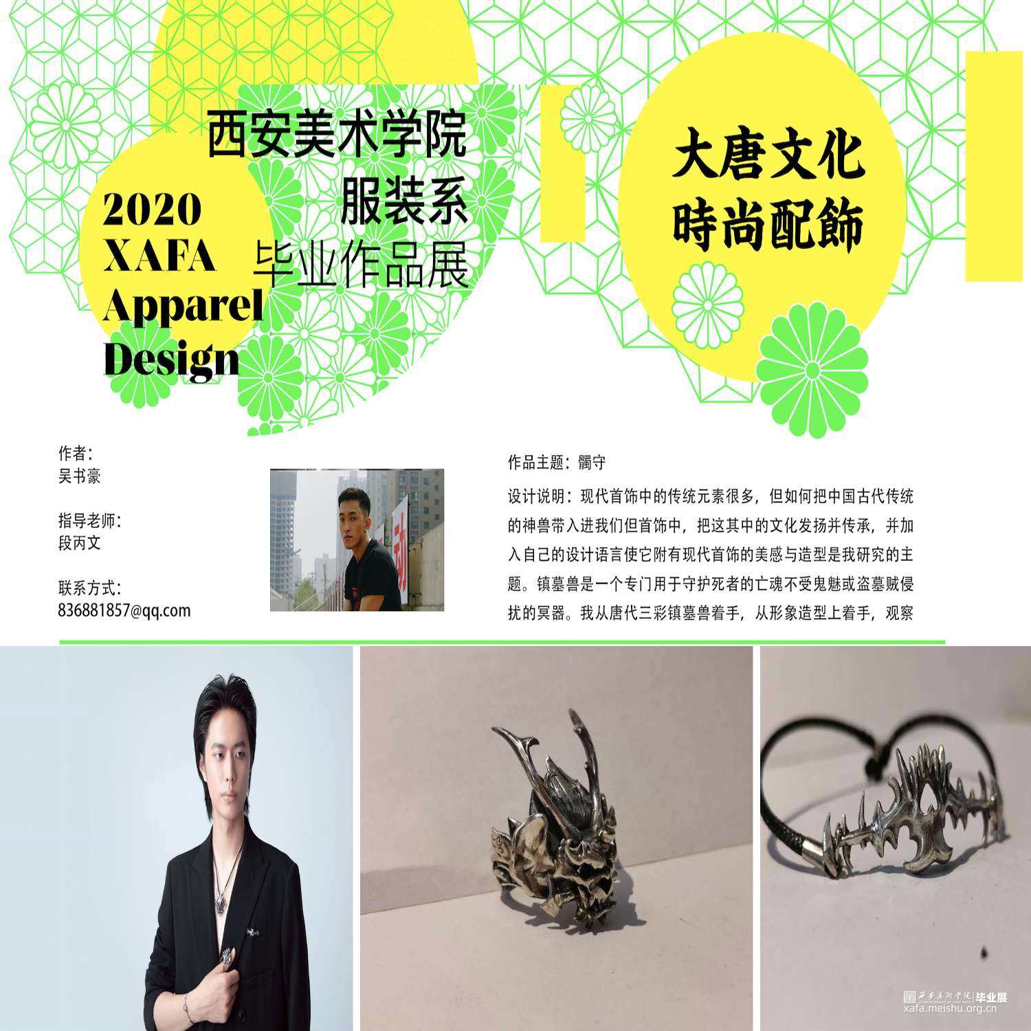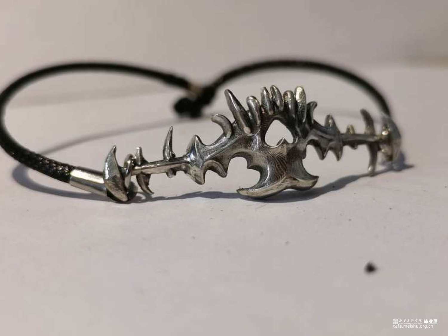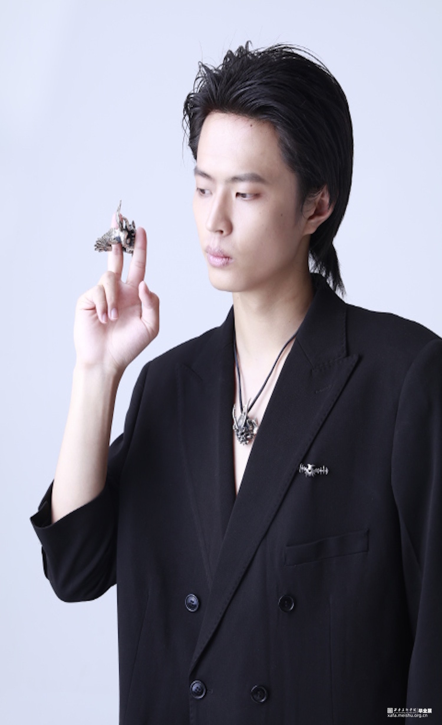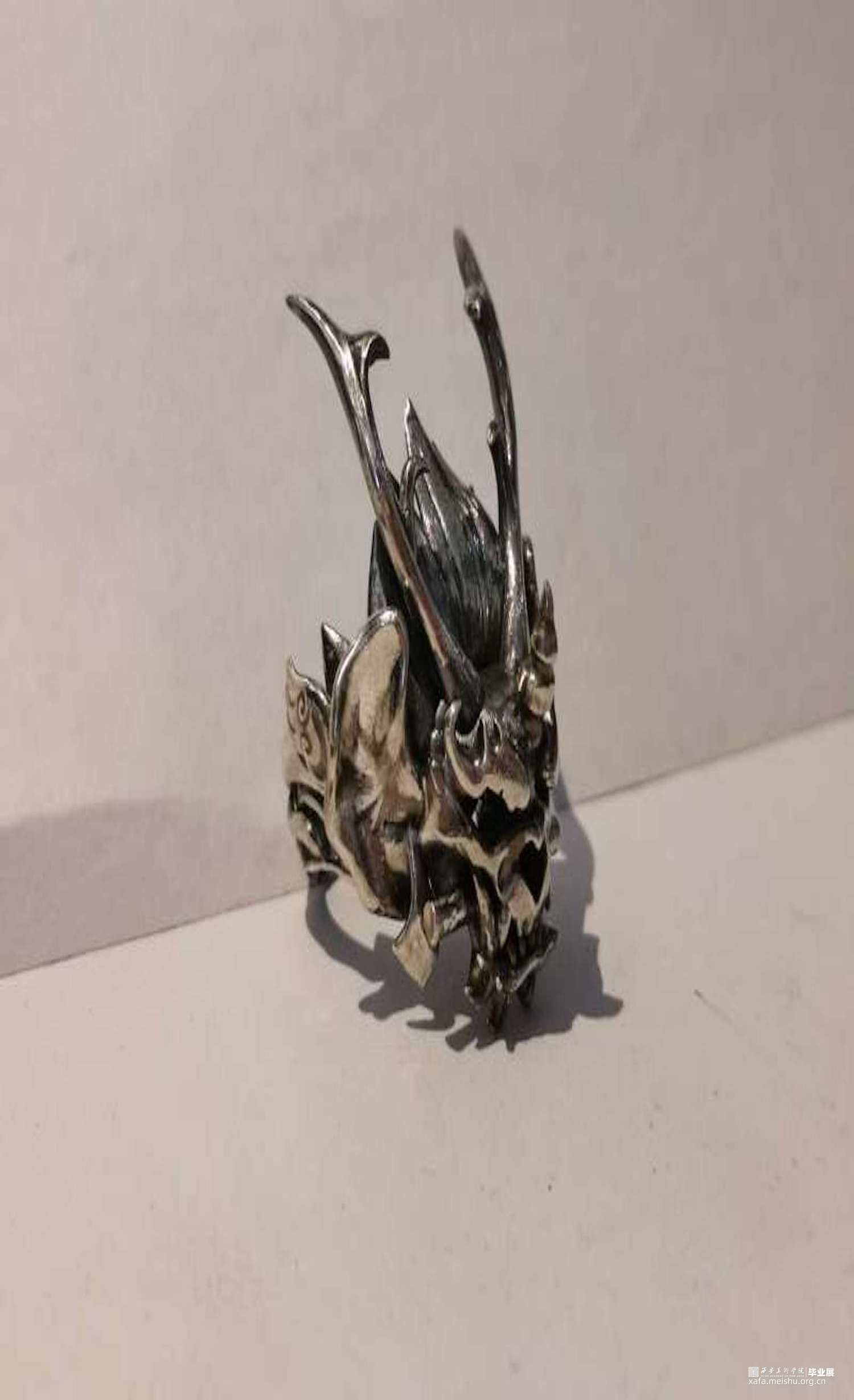 《髑守》是以唐代三彩镇墓兽为主题的首饰设计作品,在文化上它是一个展现中国传统艺术形式美感的作品,作品的主要目的是为了突出和传承中国唐代三彩镇墓兽这一形象,我认为中国的传统艺术是一个宝藏,他值得传承和发扬,在现代首饰艺术中可以更好的融入,在形态上截取了唐代三彩镇墓兽头部骨骼进行创作,设计了项链、戒指等系列首饰,风格硬朗,拼接了古朴的青铜剑和呼应死亡的乌鸦元素进行设计,使《髑守》更加立体,作品以银为主要材料,为表现纹样而进行了氧化做旧,用黄铜作为点缀增加了整体效果,设计方向主要以男士饰品为主,用云纹衔接装饰,
