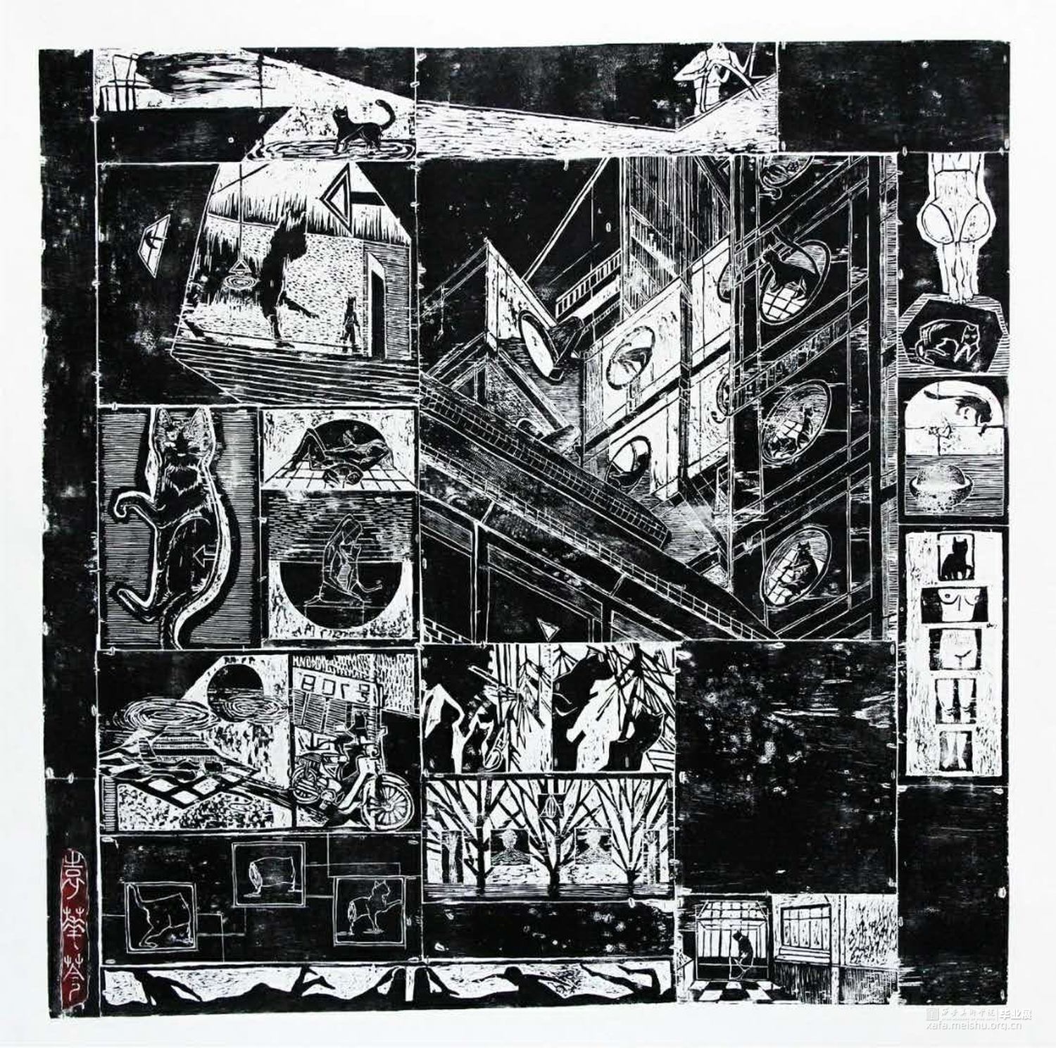 作品主要画了我近三个月以来的噩梦,女人误入大厦却遭遇了黑猫的伏击,黑猫要求女人留下眼睛、皮肤和气味。留在此地与黑猫共生,她答应了下来,却在20个月后一晚,遭到黑猫攻击,挖去了所有能跳动的器官,只留下一副躯壳,女人的身躯不再富有情感,她不顾一切的从大厦中逃跑,她游过黑色淤泥的河畔,穿越森林,被绳索绑住抓回,再逃跑再逃跑,她只是忘记了,黑猫这种生物是巫女的灵物,他只是要骗取女人的器官为主人烹制药物,当然那颗动情的心脏是最有药用价值的,他爱女人吗,自然也是爱的,但更重要的是工作。这个故事谁都没有错,错的只是在这个故事背后还在逃离生活,相信感情的傻子罢了。年末,梦也要醒来了,女人也逃脱了,不过,她还是她吗,还是空有一副美好肉体的躯壳呢。这就是这幅画的所有内容,希望所有人都能有所逃离。