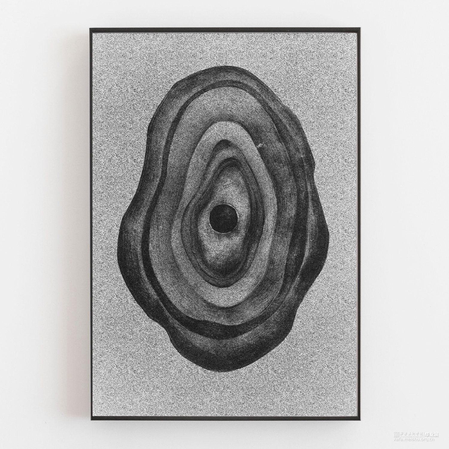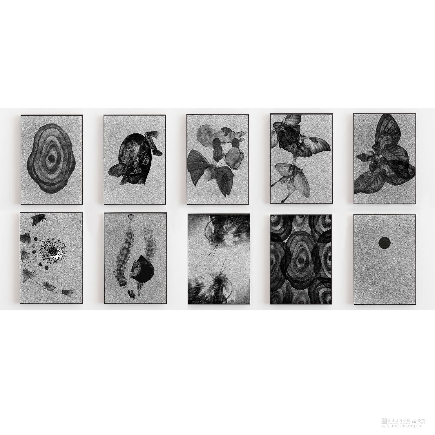 《哀乐终起》是循环终了,我们赋予自我的意义重塑自我,放大自我,蛾子临死看到的是什么呢?是诞生之初的景象还是灯火印入眼帘的无限虚影。所以这幅构图由最开始的景象无限复制,充满视野。葬礼开始,哀乐终起,死去也是诞生开始。《0》作为系列最后一幅画,只是由一个圆点放在画面中央,循环往复,又将由此开始。