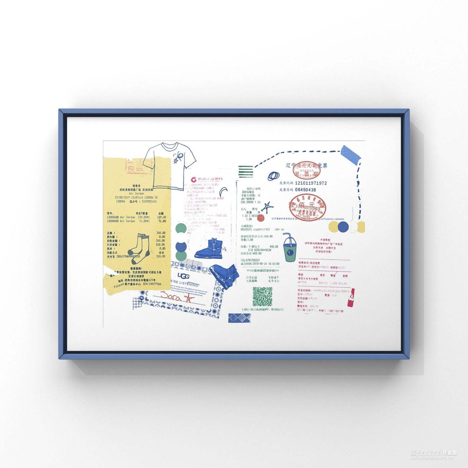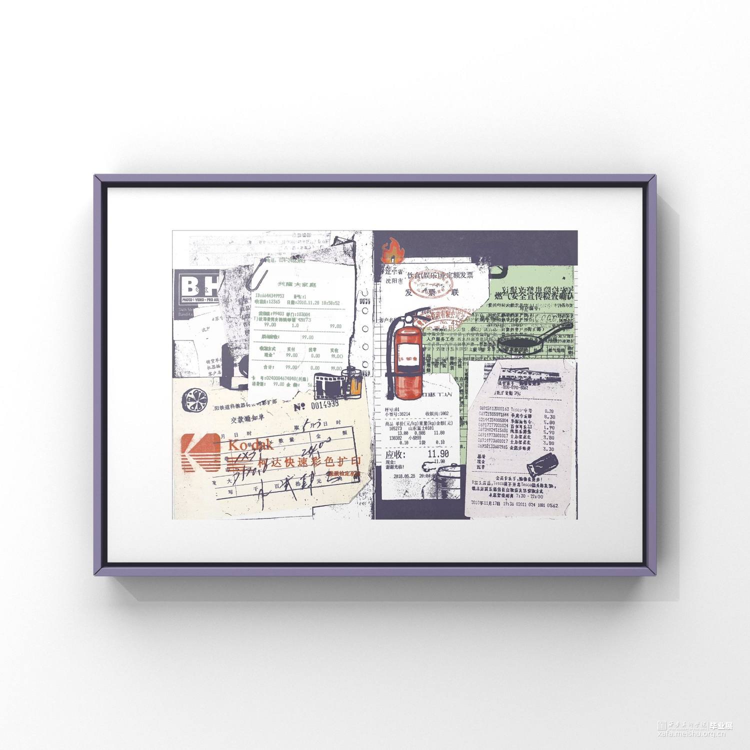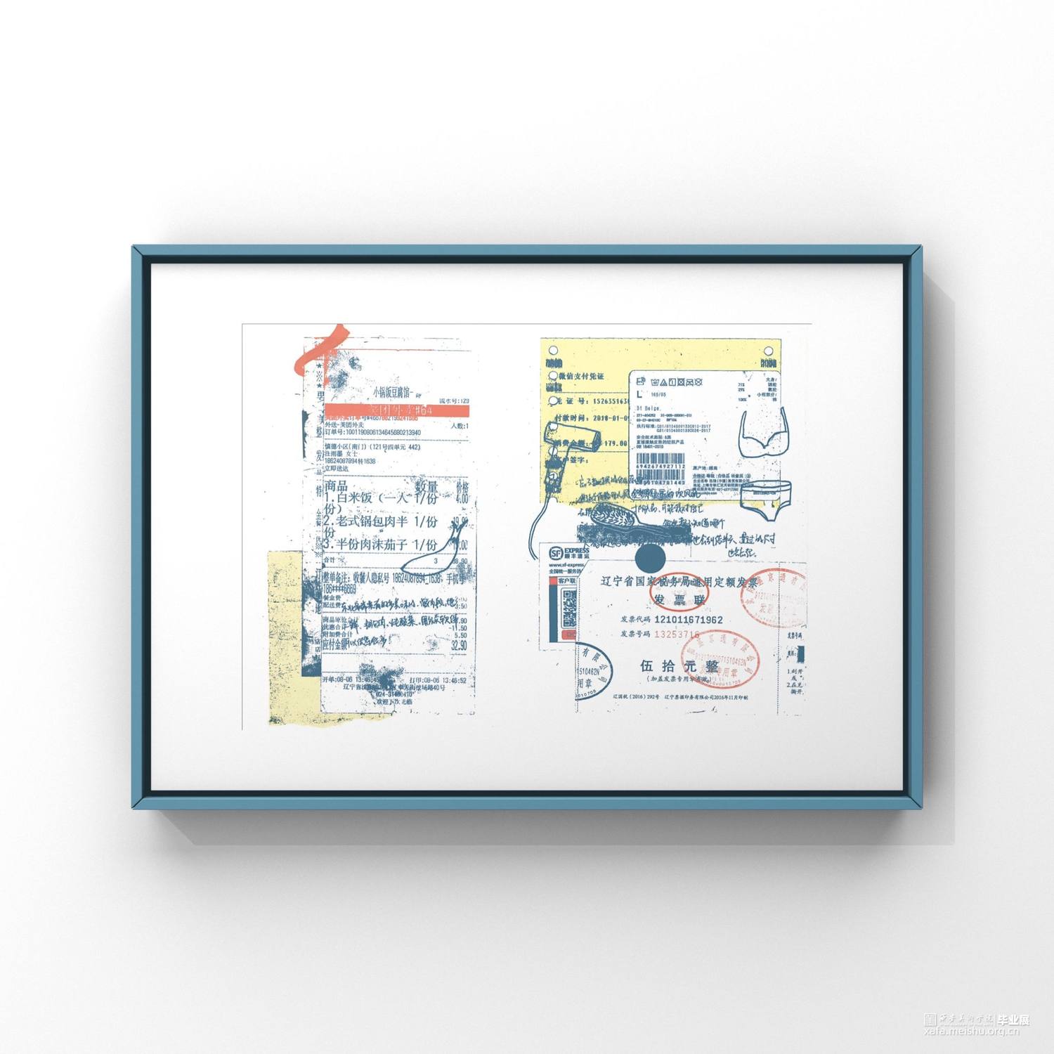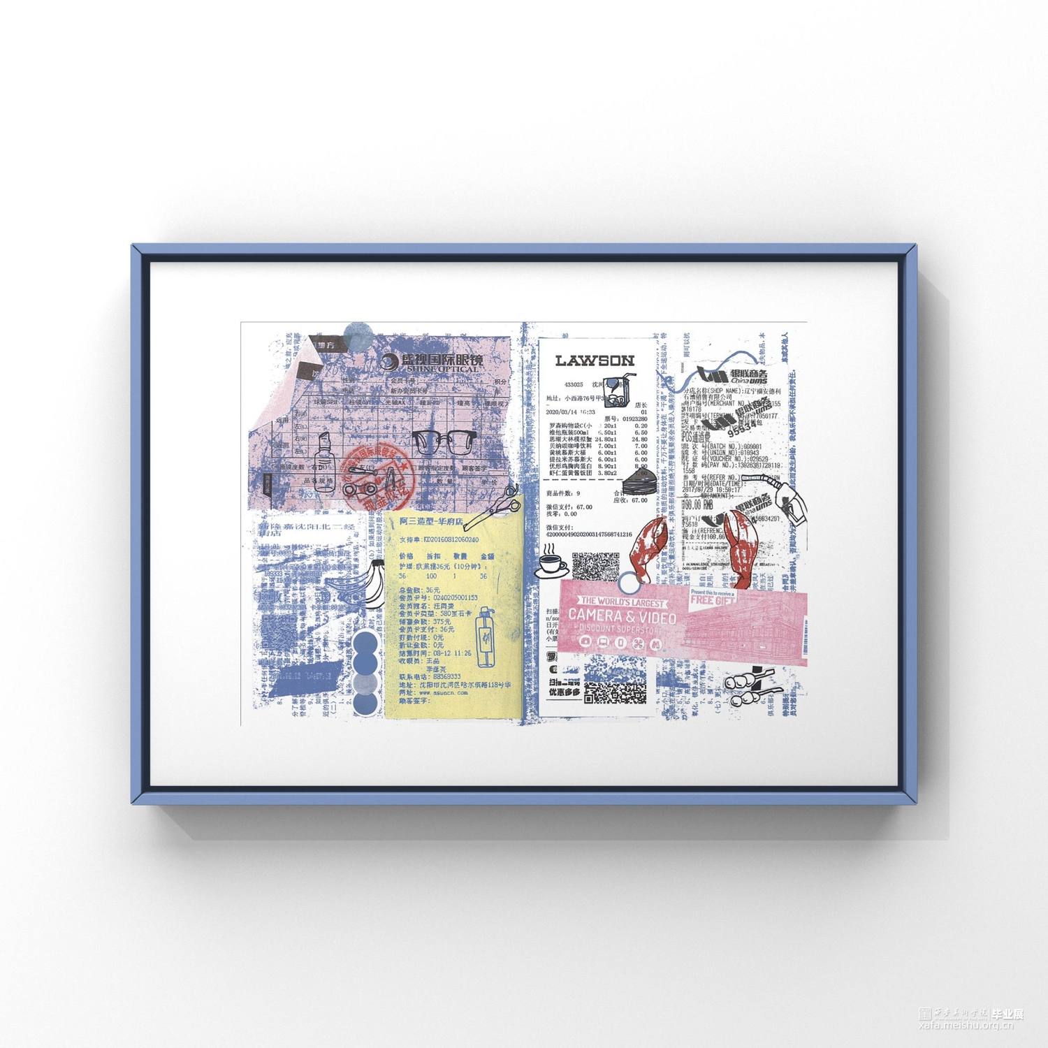 消费不仅是一种经济行为,更是一种社会行为和文化形态。而票据可以作为消费的凭证和记录,一种符号,可以代表消费社会和文化,我将其作为一种视觉元素拼贴,丰富视觉效果。起初我计划做一本手工书,印制成丝网版画,受疫情的影响我做了一些调整,最终选用数字技术分解转化拼贴作品呈现作品。我用有色纸、票据反复叠压,再在上面配有一些与票据相关的手绘插图、文字、胶带、胶版画等来装点。最后把拼贴作品中的素材进行分解提取,用三四个颜色转化后产生了不同的视觉效果。