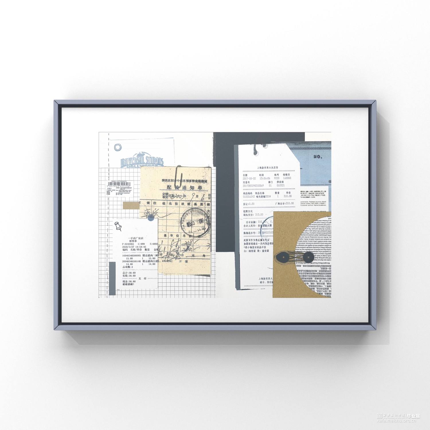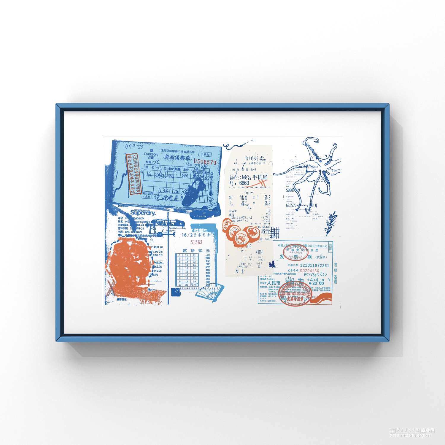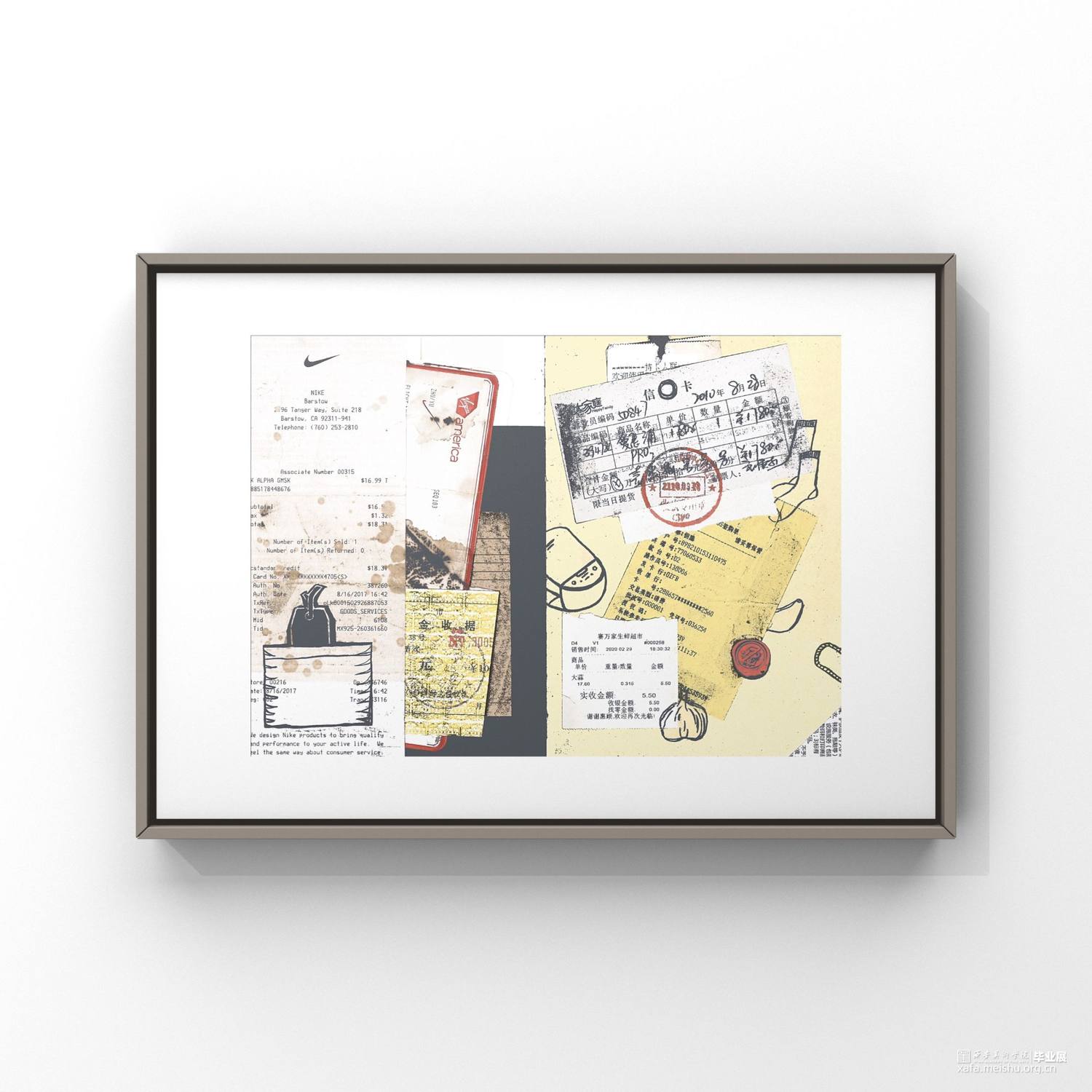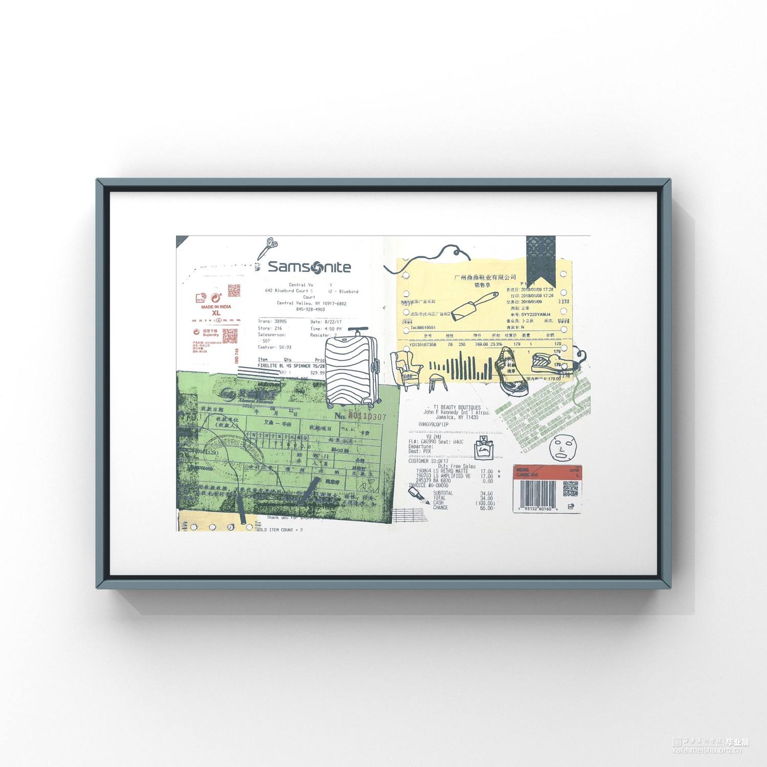 消费不仅是一种经济行为,更是一种社会行为和文化形态。而票据可以作为消费的凭证和记录,一种符号,可以代表消费社会和文化,我将其作为一种视觉元素拼贴,丰富视觉效果。起初我计划做一本手工书,印制成丝网版画,受疫情的影响我做了一些调整,最终选用数字技术分解转化拼贴作品呈现作品。我用有色纸、票据反复叠压,再在上面配有一些与票据相关的手绘插图、文字、胶带、胶版画等来装点。最后把拼贴作品中的素材进行分解提取,用三四个颜色转化后产生了不同的视觉效果。