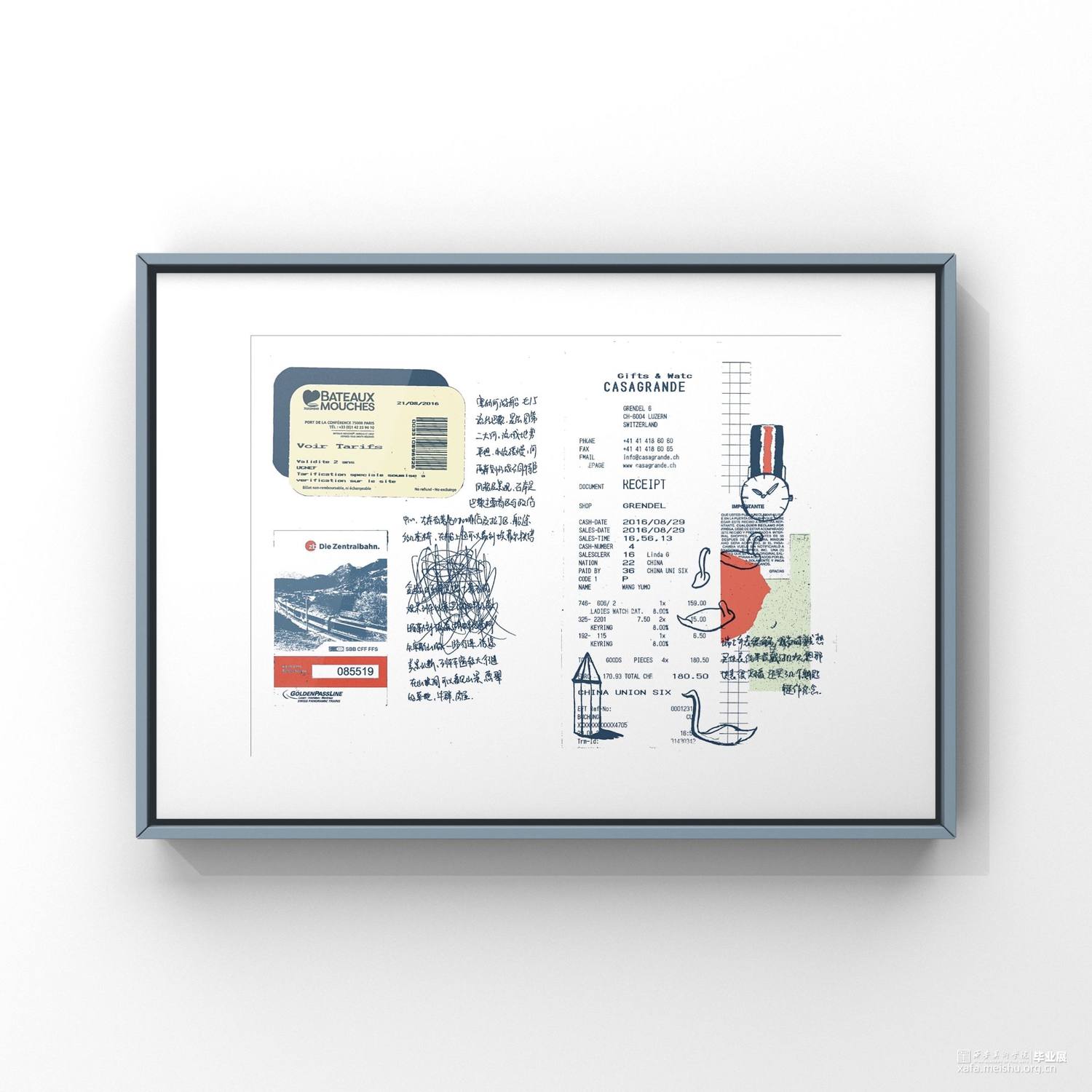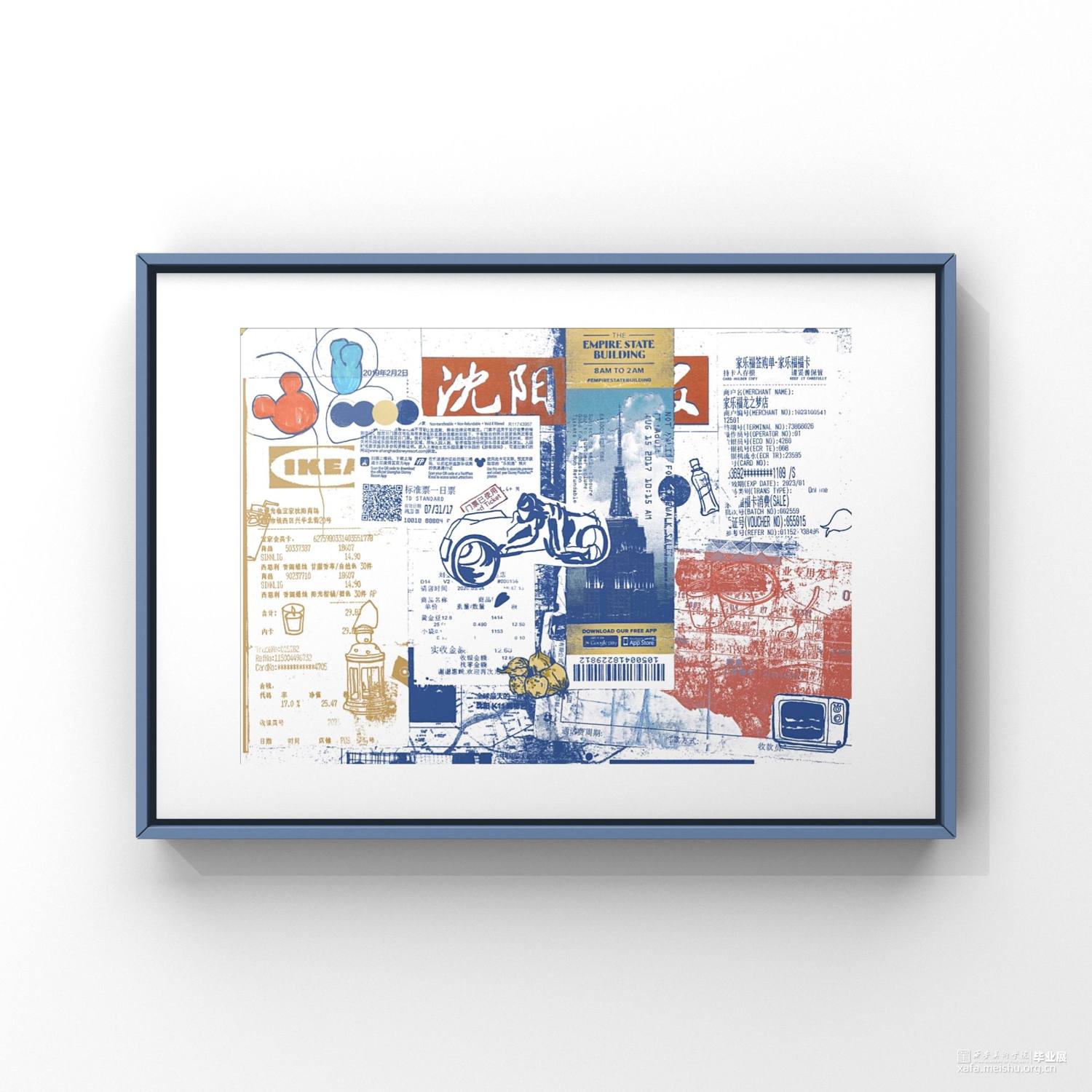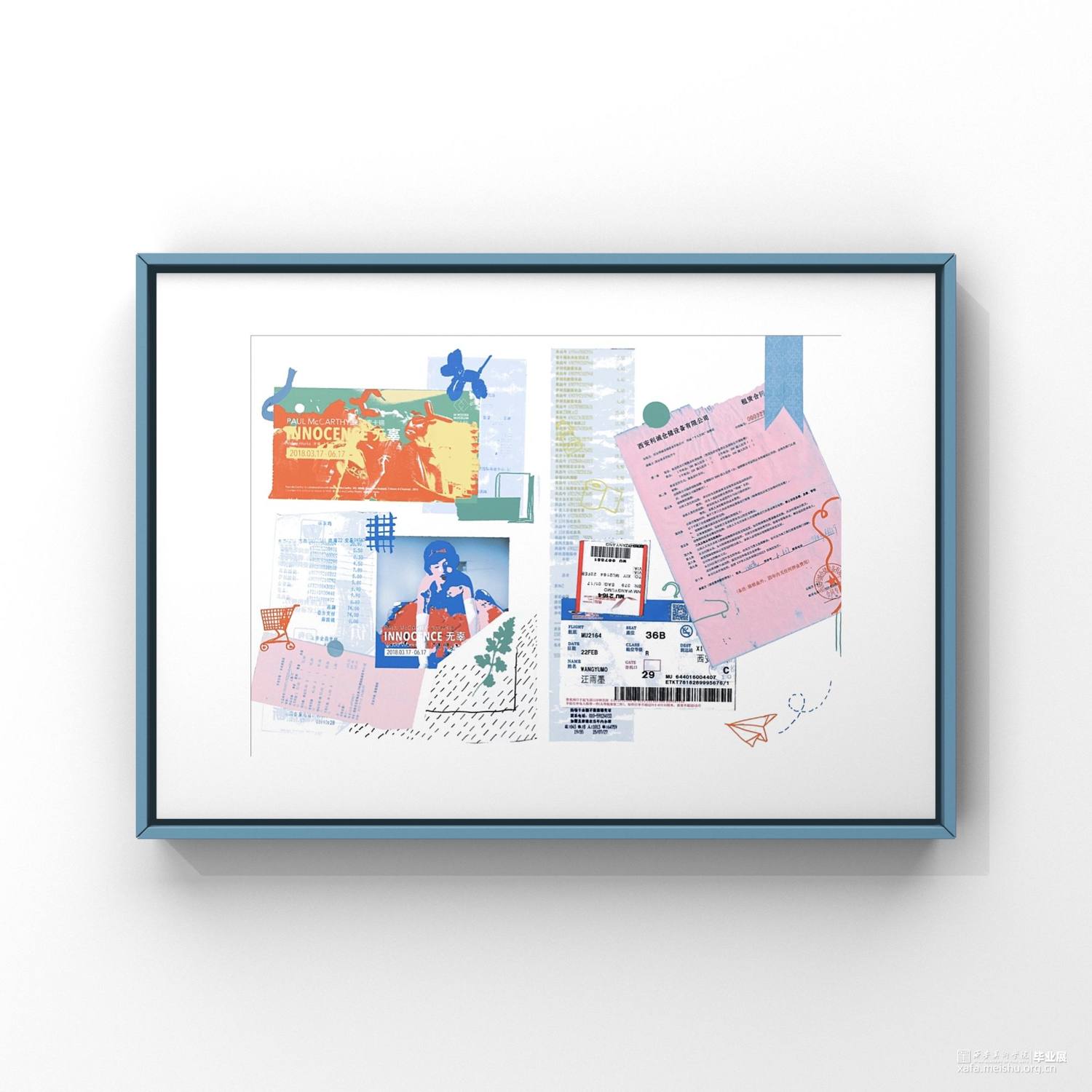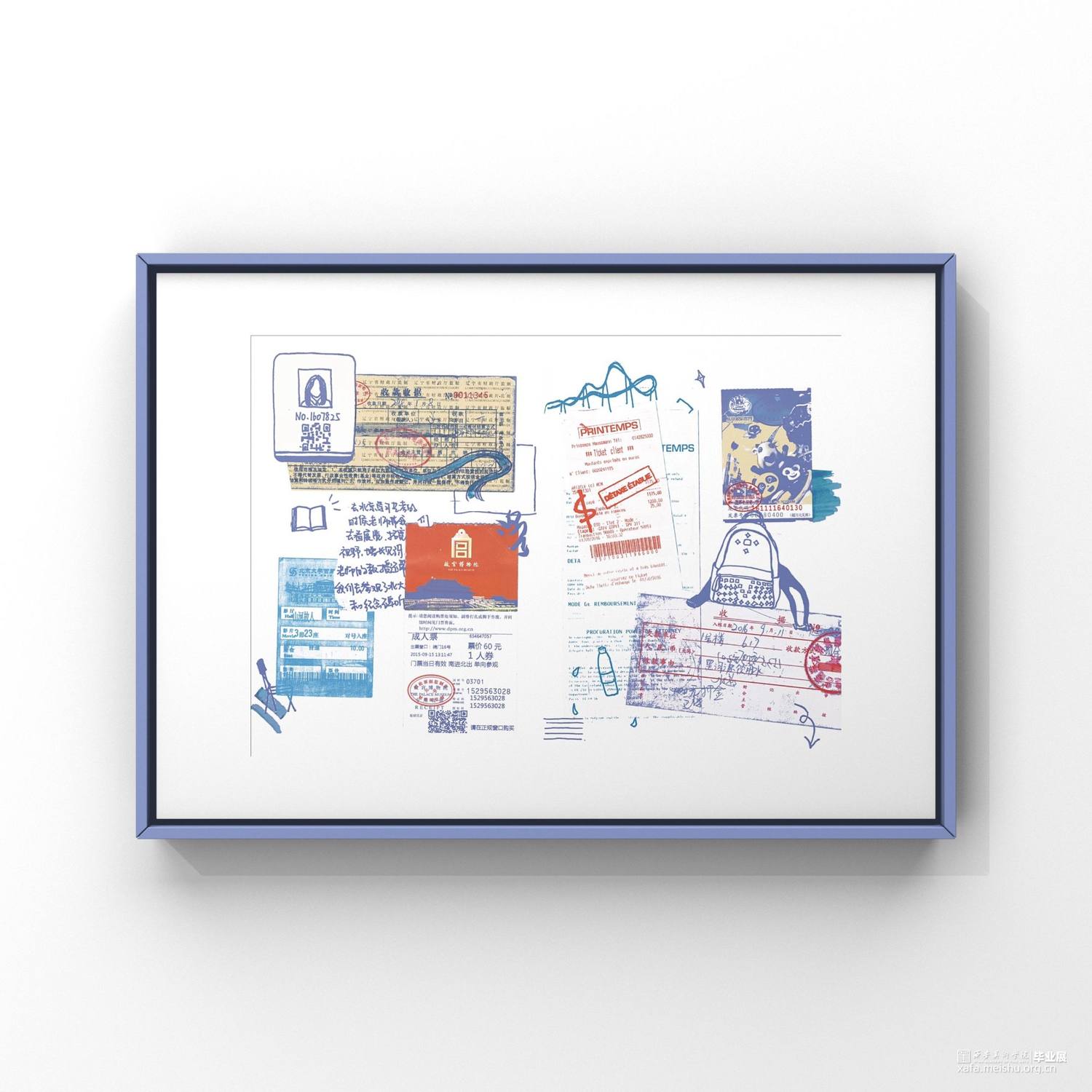 消费不仅是一种经济行为,更是一种社会行为和文化形态。而票据可以作为消费的凭证和记录,一种符号,可以代表消费社会和文化,我将其作为一种视觉元素拼贴,丰富视觉效果。起初我计划做一本手工书,印制成丝网版画,受疫情的影响我做了一些调整,最终选用数字技术分解转化拼贴作品呈现作品。我用有色纸、票据反复叠压,再在上面配有一些与票据相关的手绘插图、文字、胶带、胶版画等来装点。最后把拼贴作品中的素材进行分解提取,用三四个颜色转化后产生了不同的视觉效果。