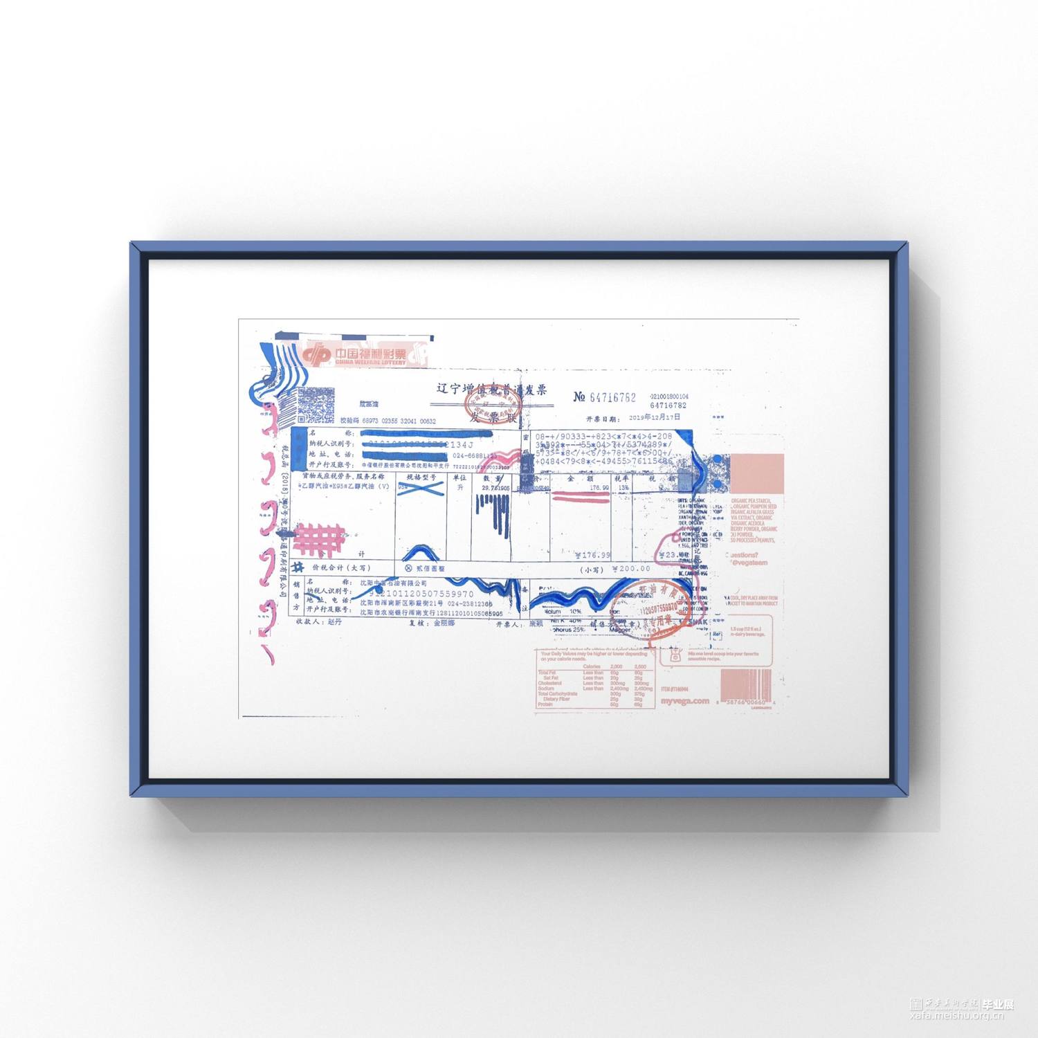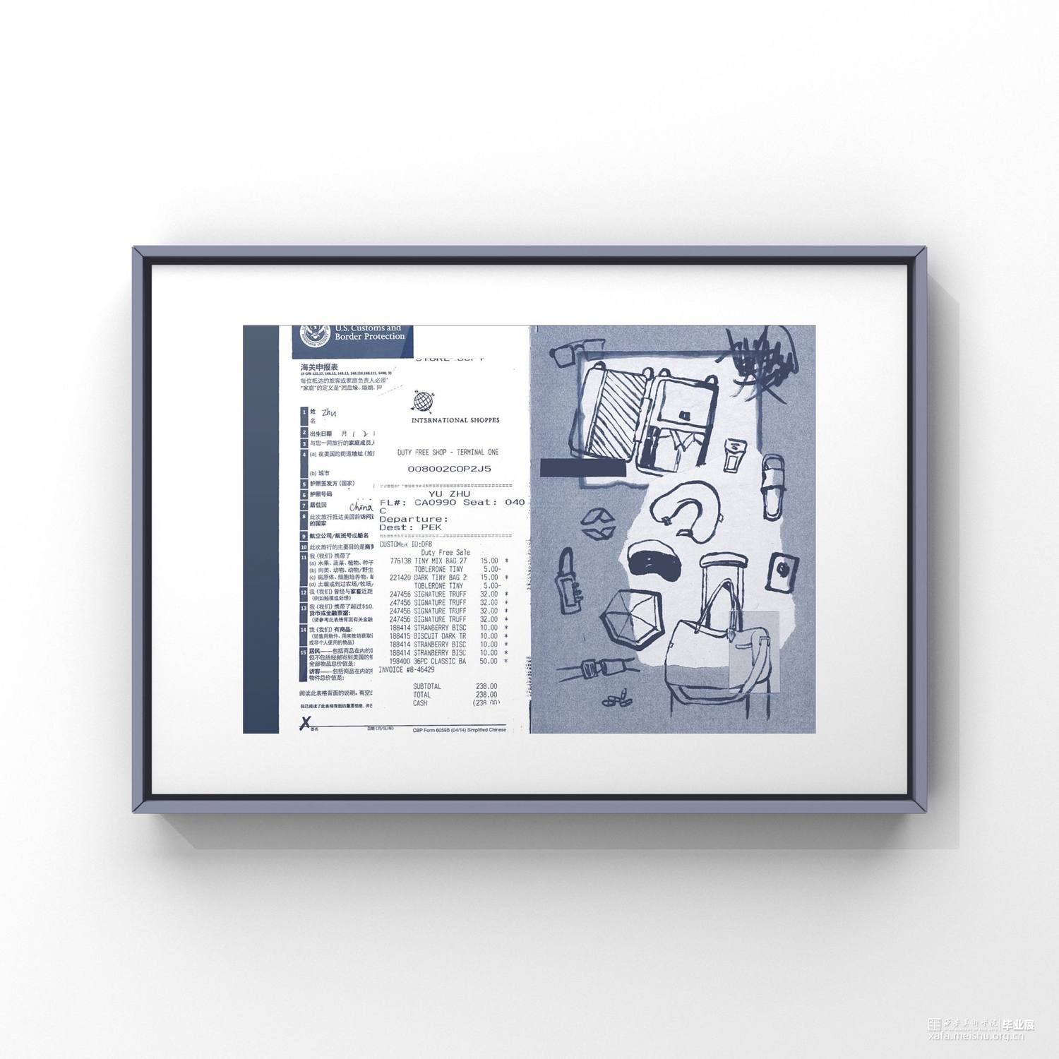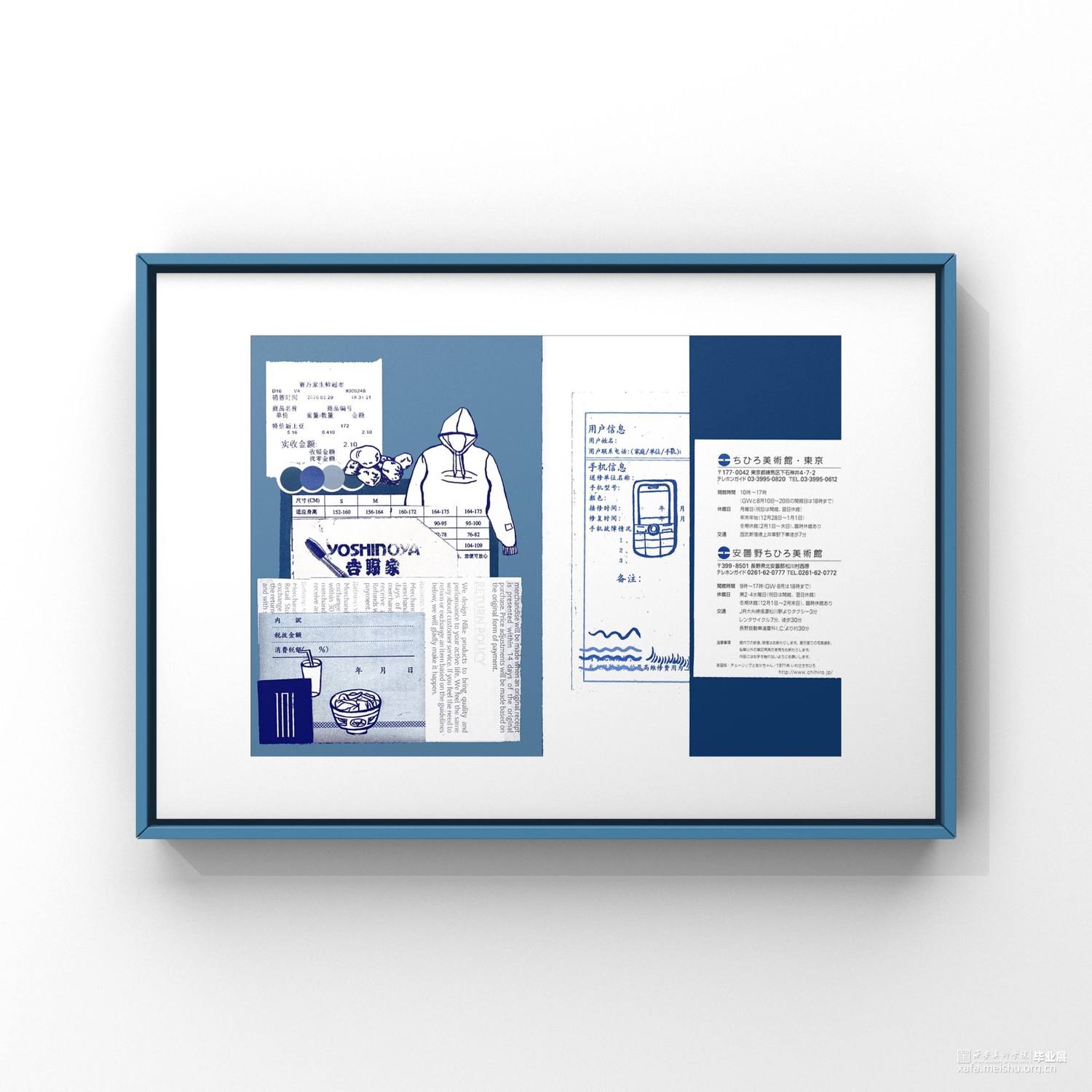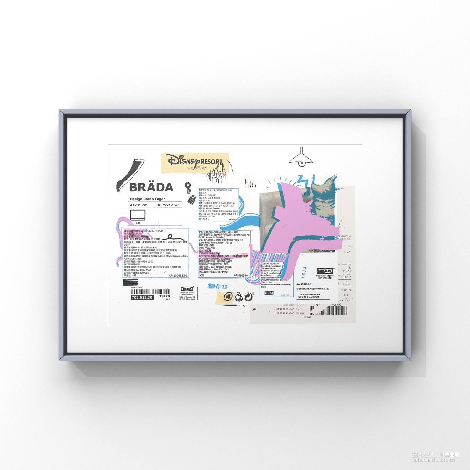 消费不仅是一种经济行为,更是一种社会行为和文化形态。而票据可以作为消费的凭证和记录,一种符号,可以代表消费社会和文化,我将其作为一种视觉元素拼贴,丰富视觉效果。起初我计划做一本手工书,印制成丝网版画,受疫情的影响我做了一些调整,最终选用数字技术分解转化拼贴作品呈现作品。我用有色纸、票据反复叠压,再在上面配有一些与票据相关的手绘插图、文字、胶带、胶版画等来装点。最后把拼贴作品中的素材进行分解提取,用三四个颜色转化后产生了不同的视觉效果。
