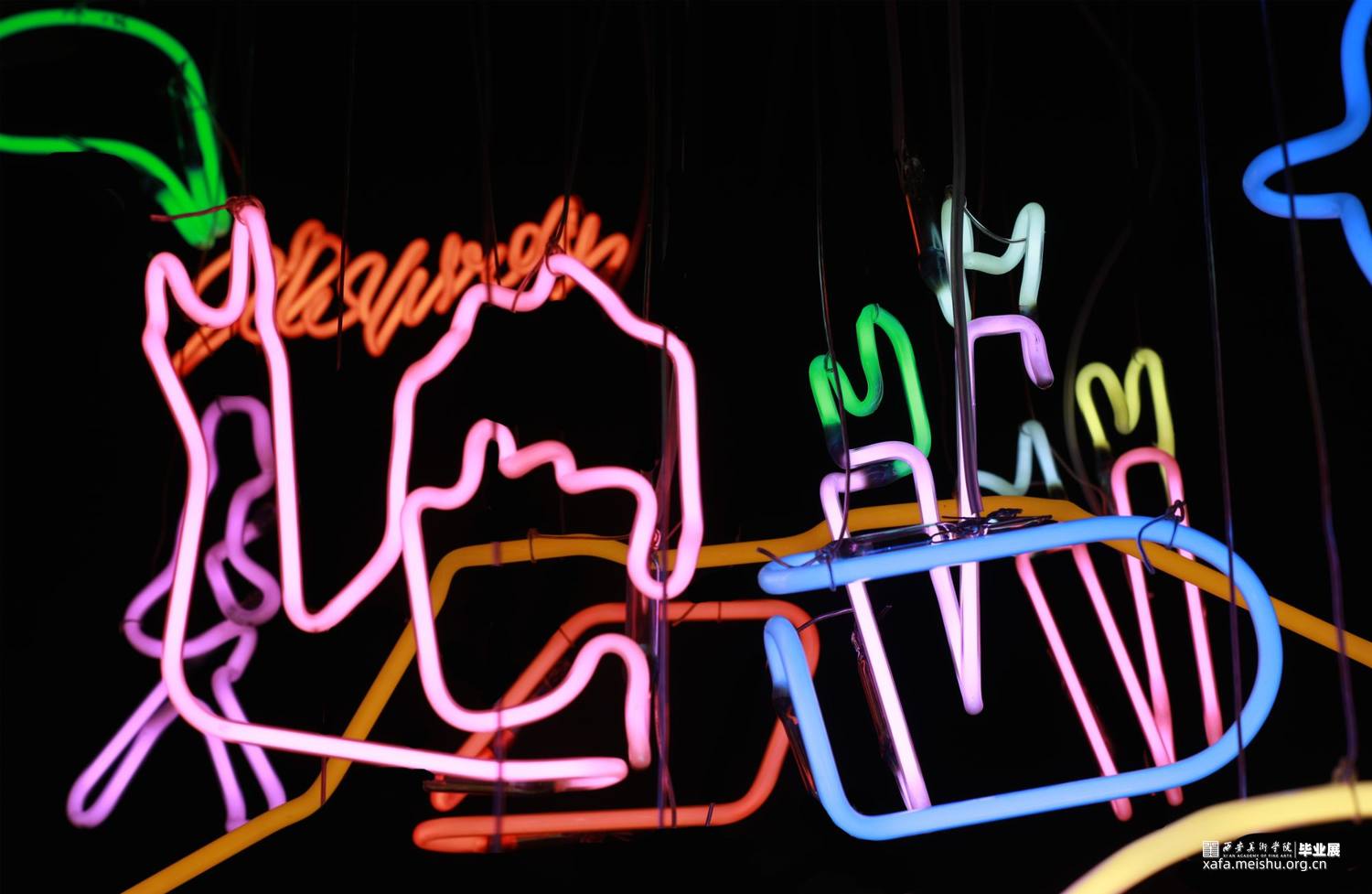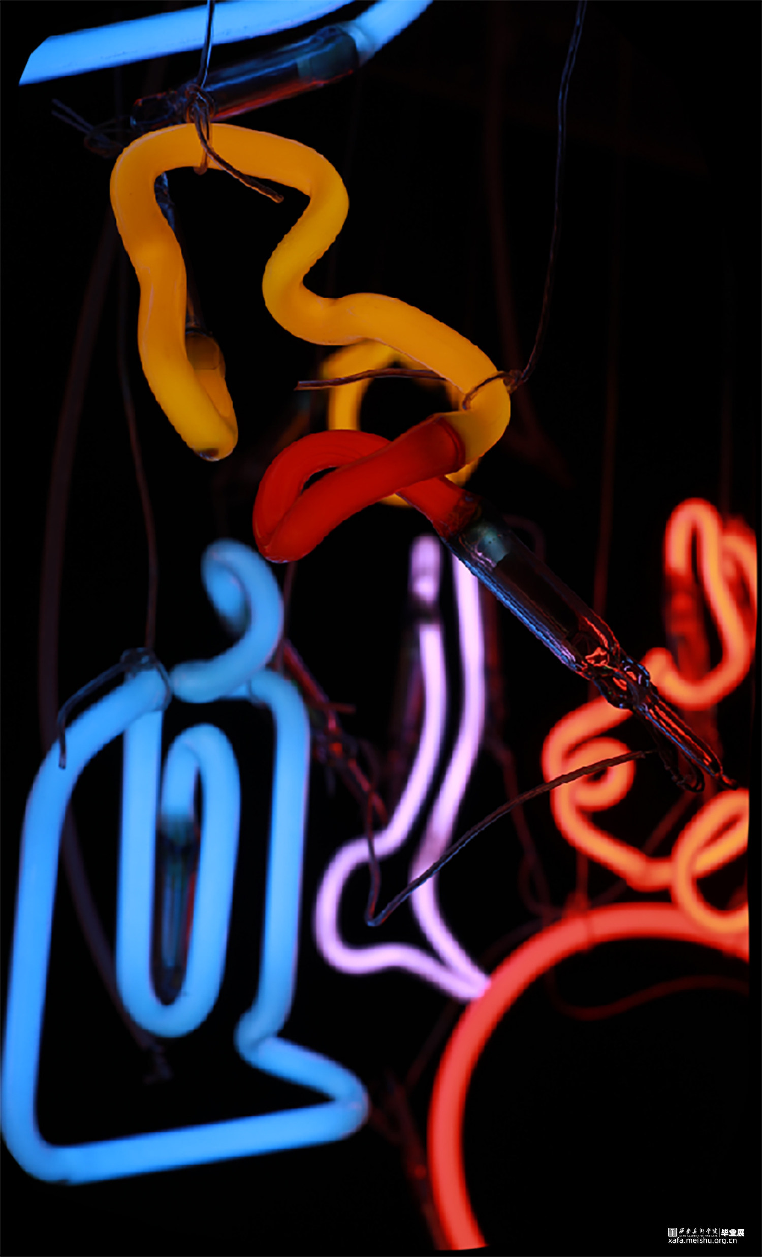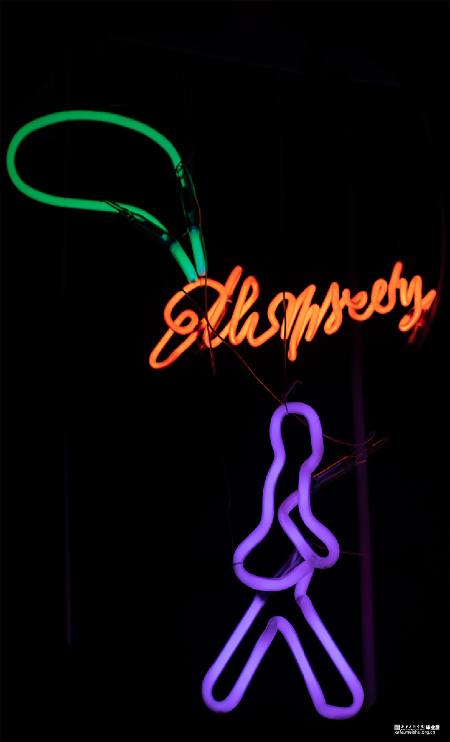 作品《光限制的边缘》是以霓虹灯的“光”来营造迷幻的氛围,从形态学的角度吸引人们的视觉关注。“限制的边缘”在这里表达的是对跨越艺术边界的不断尝试:艺术从未被确切界定过,艺术家们也从未停止突破艺术定义,颠覆传统艺术概念。这组作品也为观众提供了一个新的思维方式,用一系列具有代表性的艺术家的前文本作品,探寻未被言明的隐含在语言表达背后的态度和价值观念。