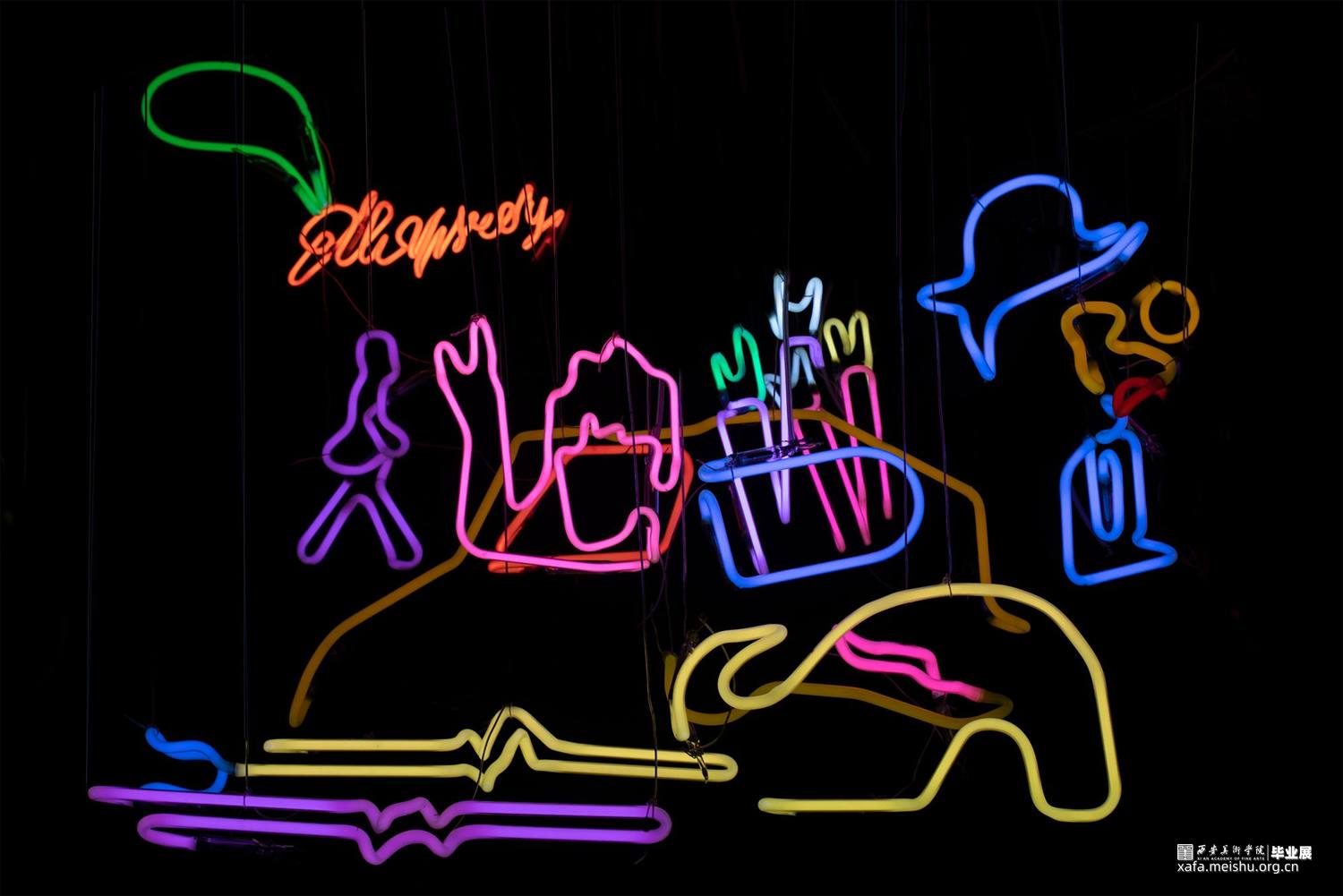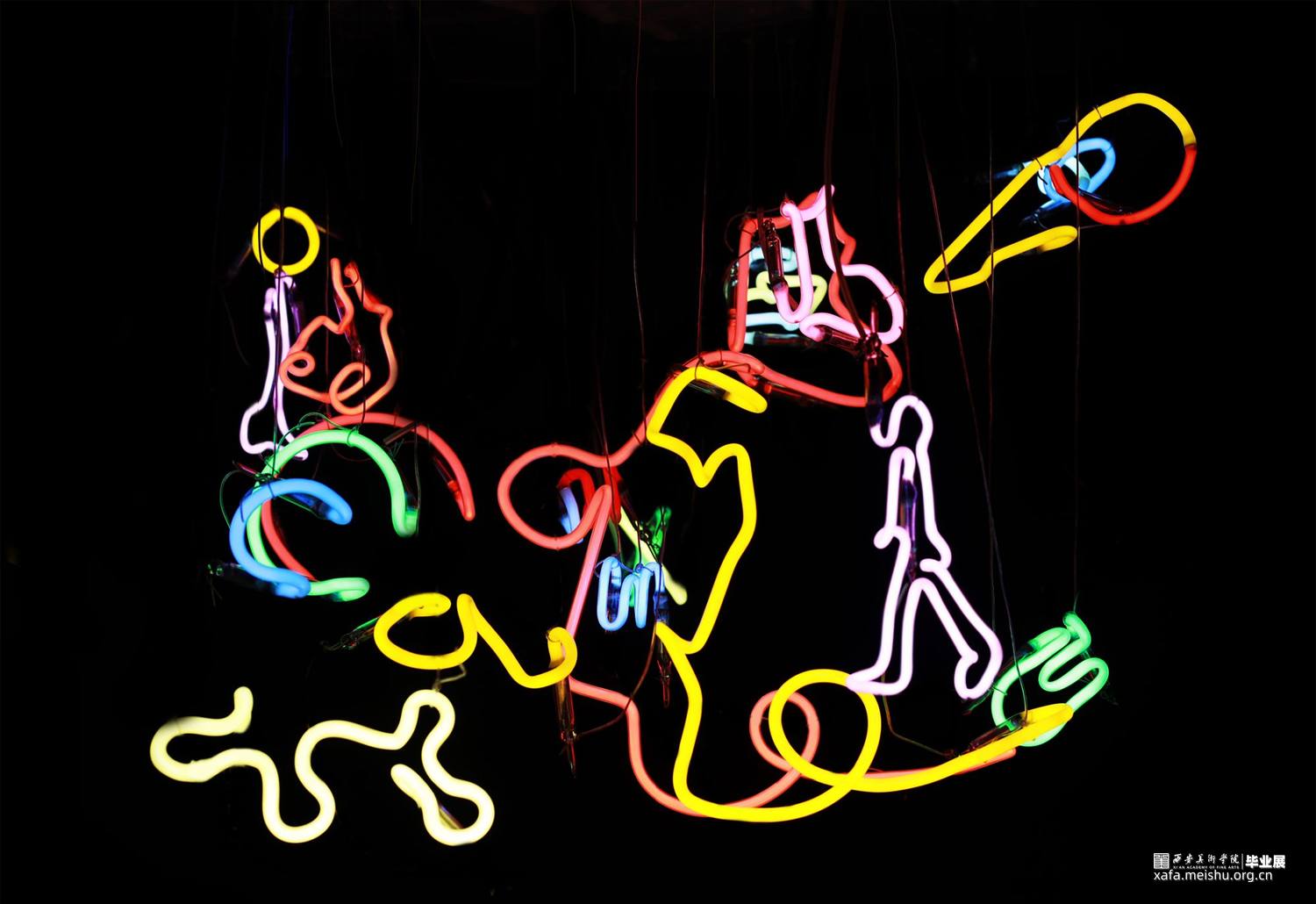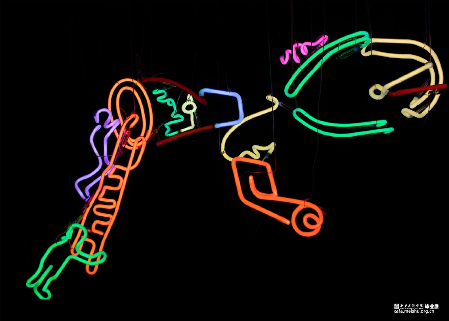 作品《光限制的边缘》是以霓虹灯的“光”来营造迷幻的氛围,从形态学的角度吸引人们的视觉关注。“限制的边缘”在这里表达的是对跨越艺术边界的不断尝试:艺术从未被确切界定过,艺术家们也从未停止突破艺术定义,颠覆传统艺术概念。这组作品也为观众提供了一个新的思维方式,用一系列具有代表性的艺术家的前文本作品,探寻未被言明的隐含在语言表达背后的态度和价值观念。