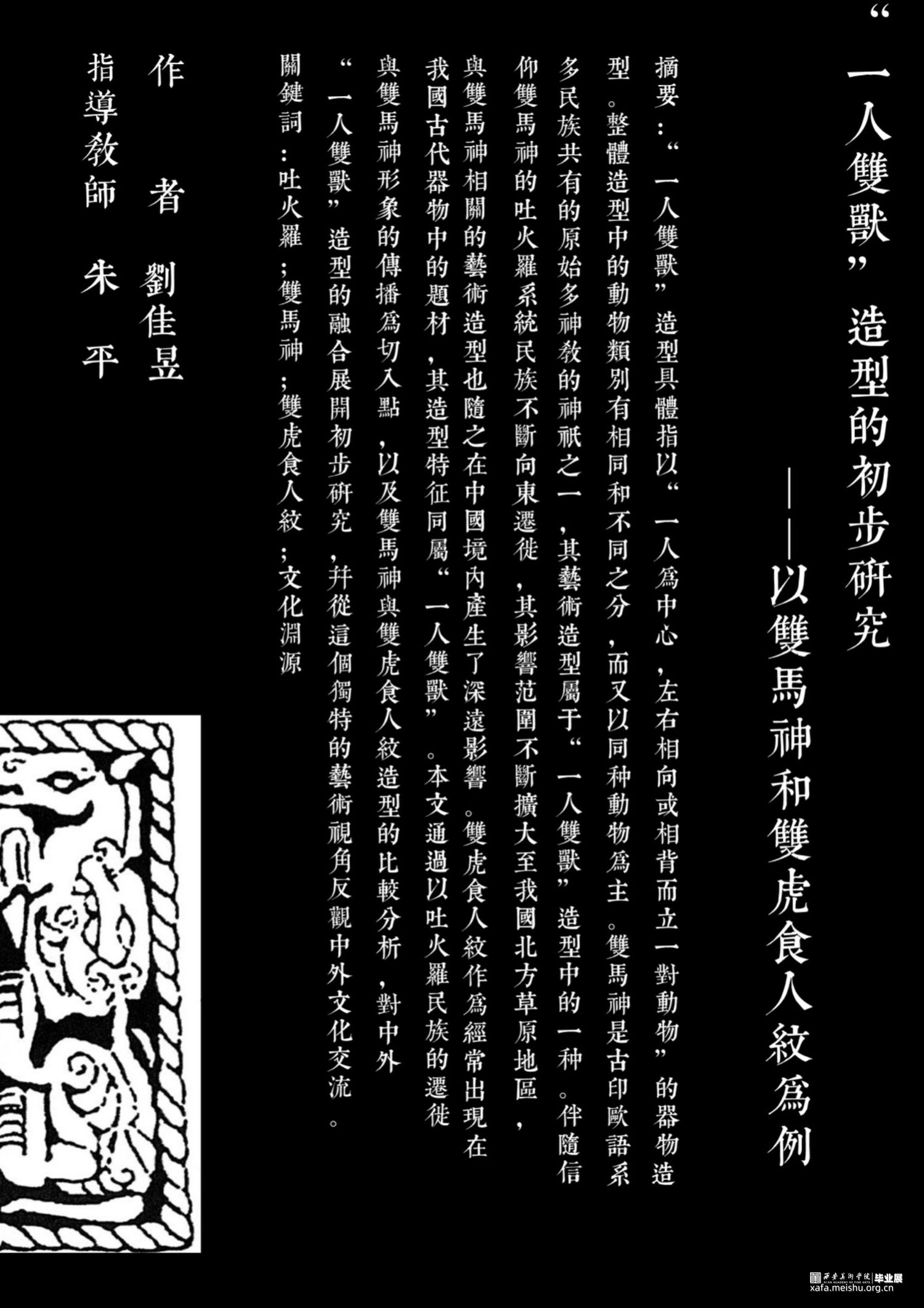 “一人双兽”造型具体指以“一人为中心,左右相向或相背而立一对动物”的器物造型。整体造型中的动物类别有相同和不同之分,而又以同种动物为主。双马神是古印欧语系多民族共有的原始多神教的神祇之一,其艺术造型属于“一人双兽”造型中的一种。伴随信仰双马神的吐火罗系统民族不断向东迁徙,其影响范围不断扩大至我国北方草原地区,与双马神相关的艺术造型也随之在中国境内产生了深远影响。双虎食人纹作为经常出现在我国古代器物中的题材,其造型特征同属“一人双兽”。本文通过以吐火罗民族的迁徙与双马神形象的传播为切入点,以及双马神与双虎食