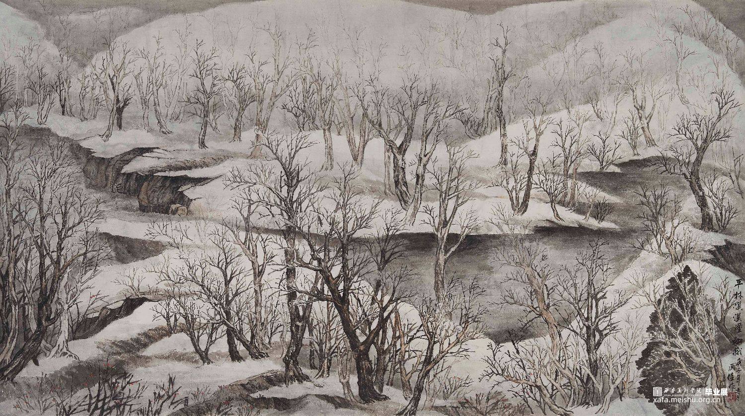 冬日群山之中一片静谧的寒林,带给人无限的遐想