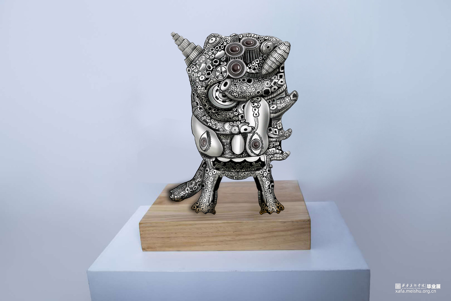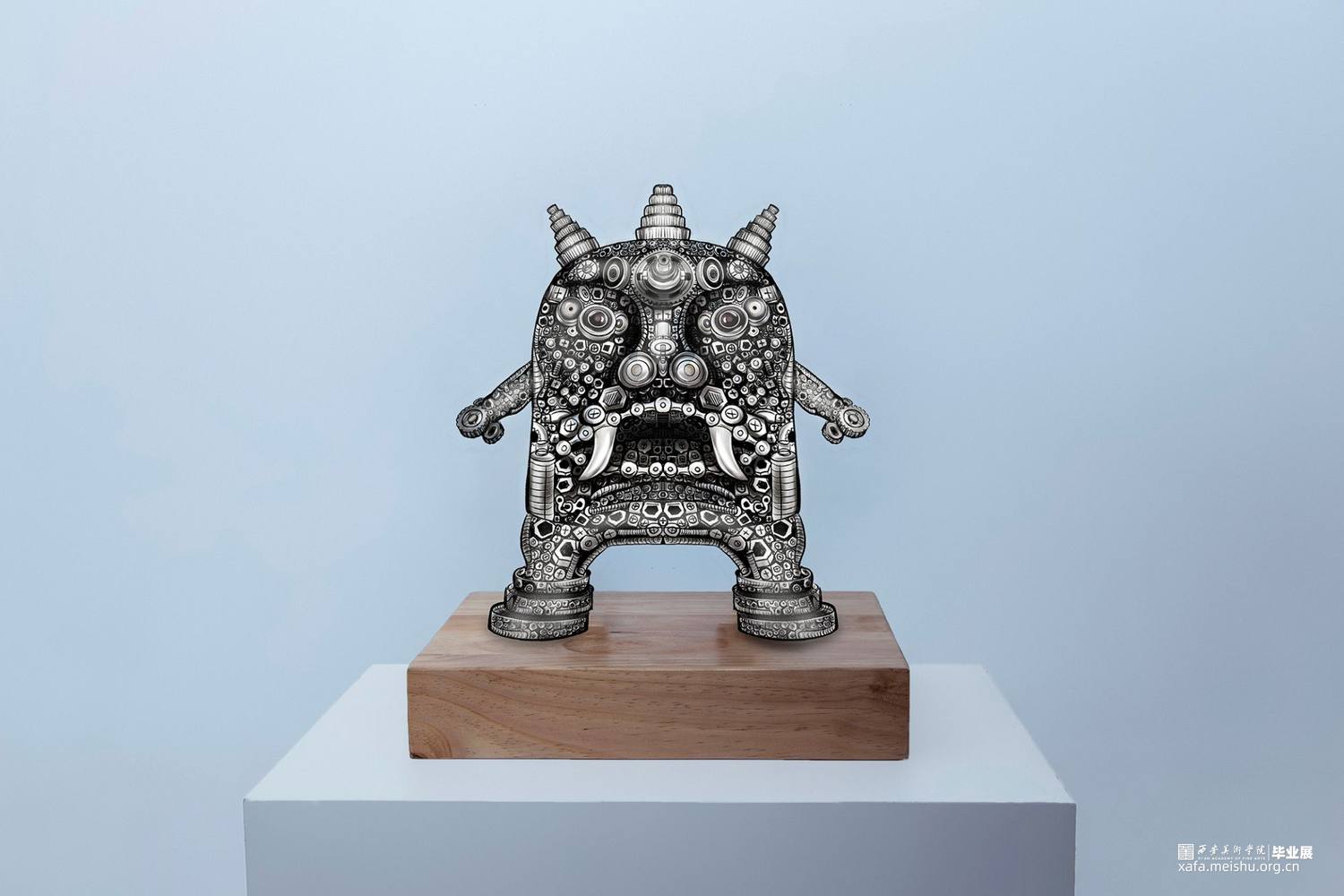 本组整个创作主要是从物质到精神的转换,利用金属元素材料进行微工艺加工焊接,将作品的淳朴、粗犷和简练,利用金属材料的特性形成富有变化的雕塑造型。通过巧妙地利用材料的形制和金属表面的斑驳肌理,想运用视觉效应,去引发人们对自然界走兽物种消失的思考,运用动物的体感造型去传承文化的趣味性。利用金属转折节点的多角度多层次焊接,突出作品的细节感和层次性,通过主题形象的生冷性,呼吁人们尊重自然,关注和热爱传统文化。