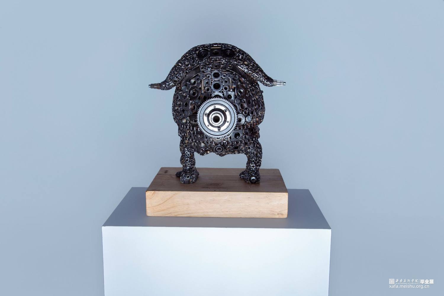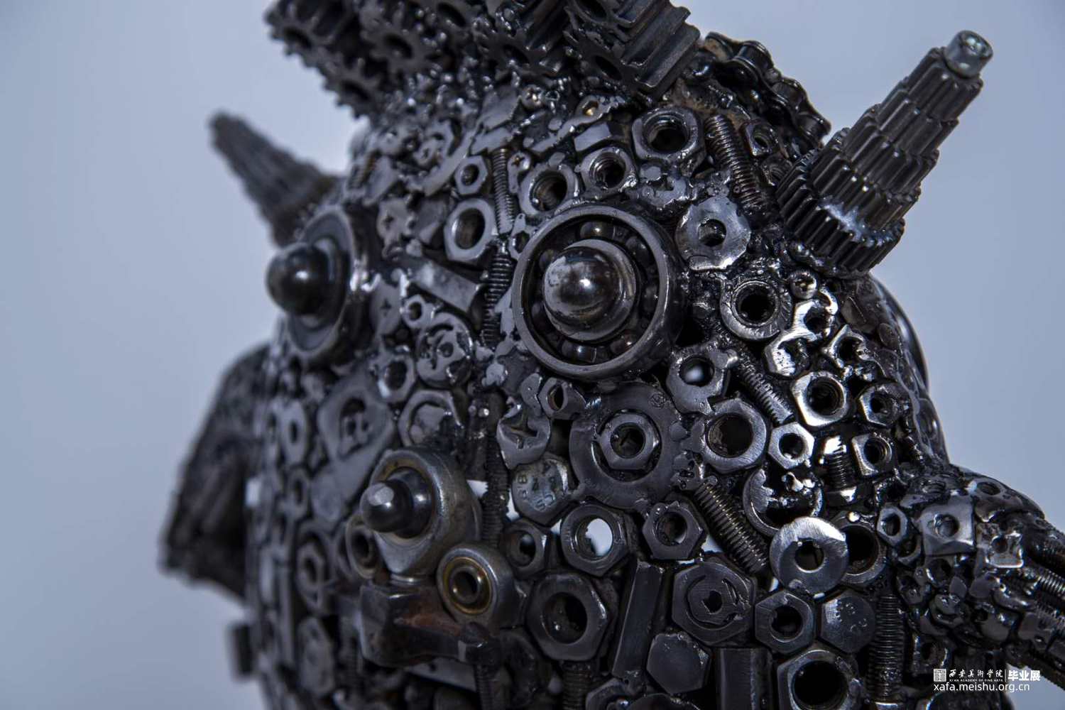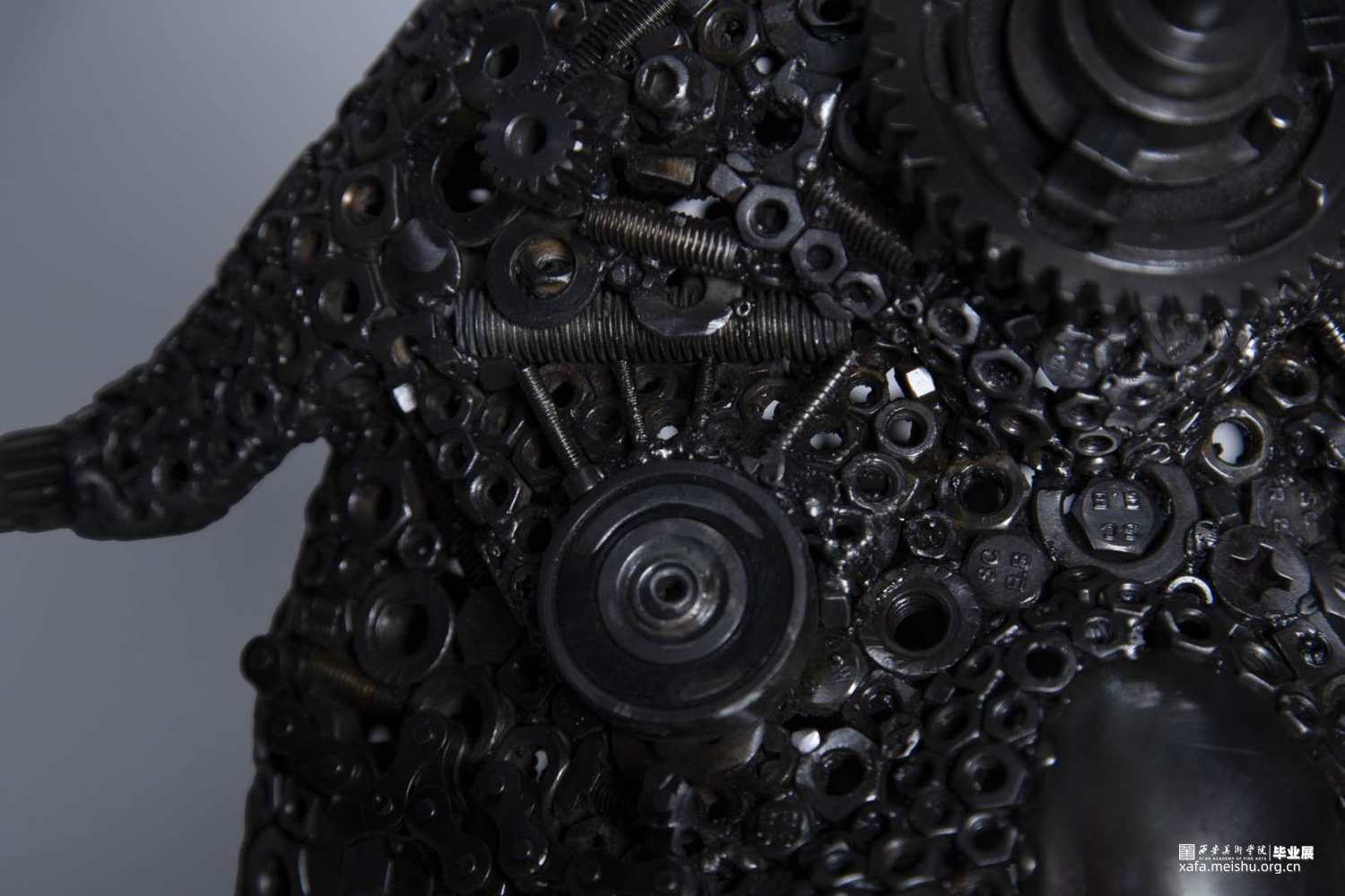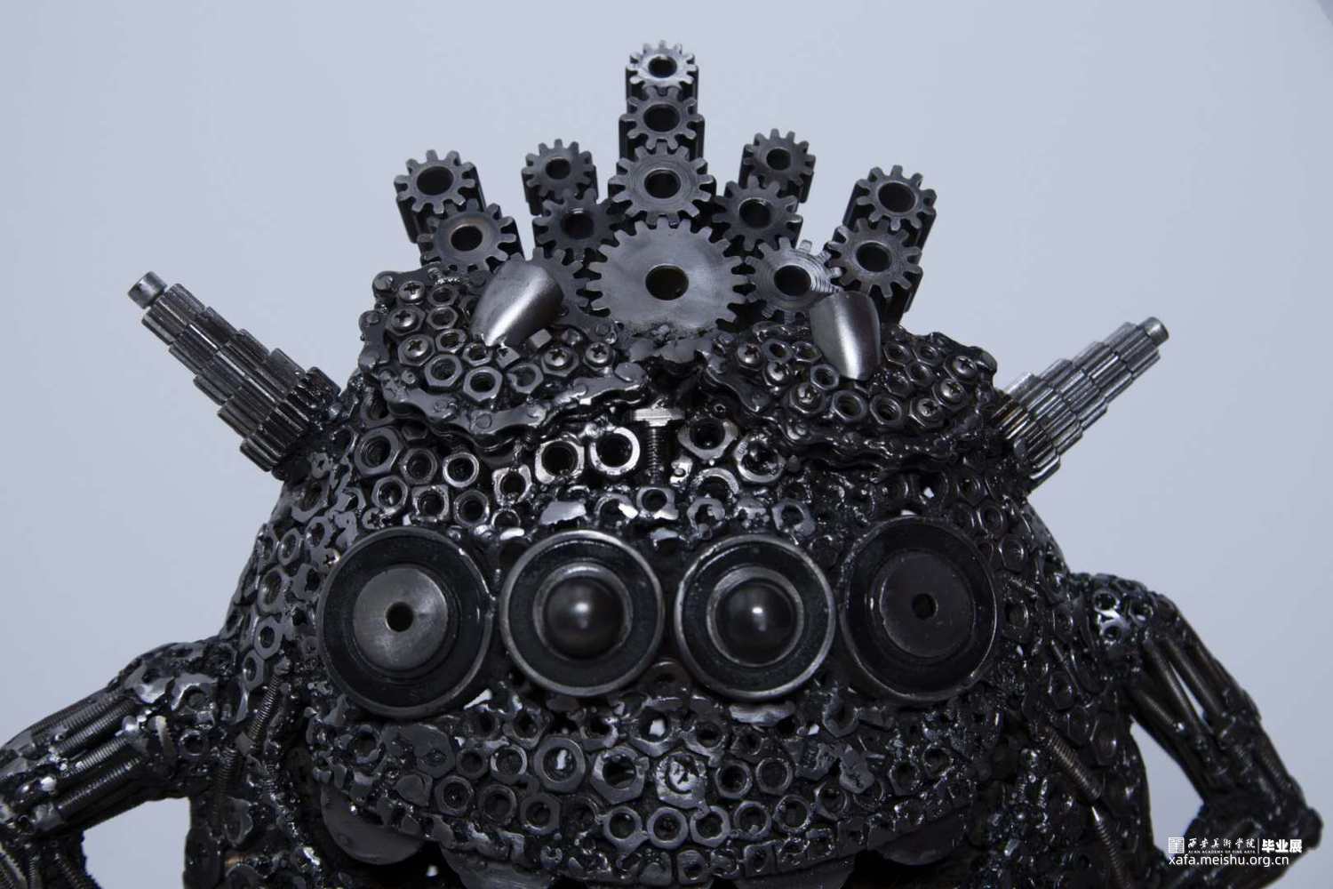 本组作品的创新点在于,四个作品的主题形象完全是再设计的新形象,整个作品面对不同年龄阶段的观众都会带来不同的视觉感受。金属焊接工艺品雕塑本身就是一种具有现代意义的艺术表现形式,它将艺术语言更直接的融合在艺术的创作过程中,赋予其丰富的人文精神审美内涵,有力的拓展了作品的表现力和感染力。材料成品的质感最后也直接的影响着作品的形态。本组作品元素焊接过程中,同时利用点、线、面形体的穿插,想运用空间构成的律动感去凸显雕塑形体上的运动感。金属元素材料的焊接,使作品具有很多细节性,不单单使用螺丝和螺帽小元素,在零件的使用上,注意形体的转折关系,尽可能的点缀轴承,齿轮,金属弹珠等,使整个雕塑具有丰富性。后期打磨阶段尽可能的顺着外部形体走势打磨,尽最大可能保留了金属的时间感和铁锈的生冷性。