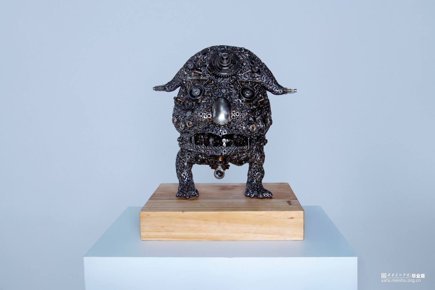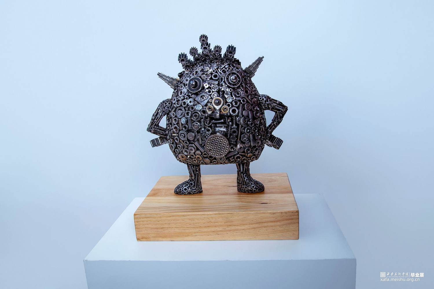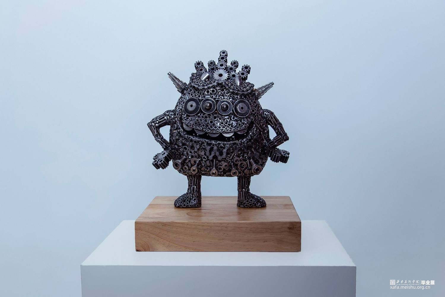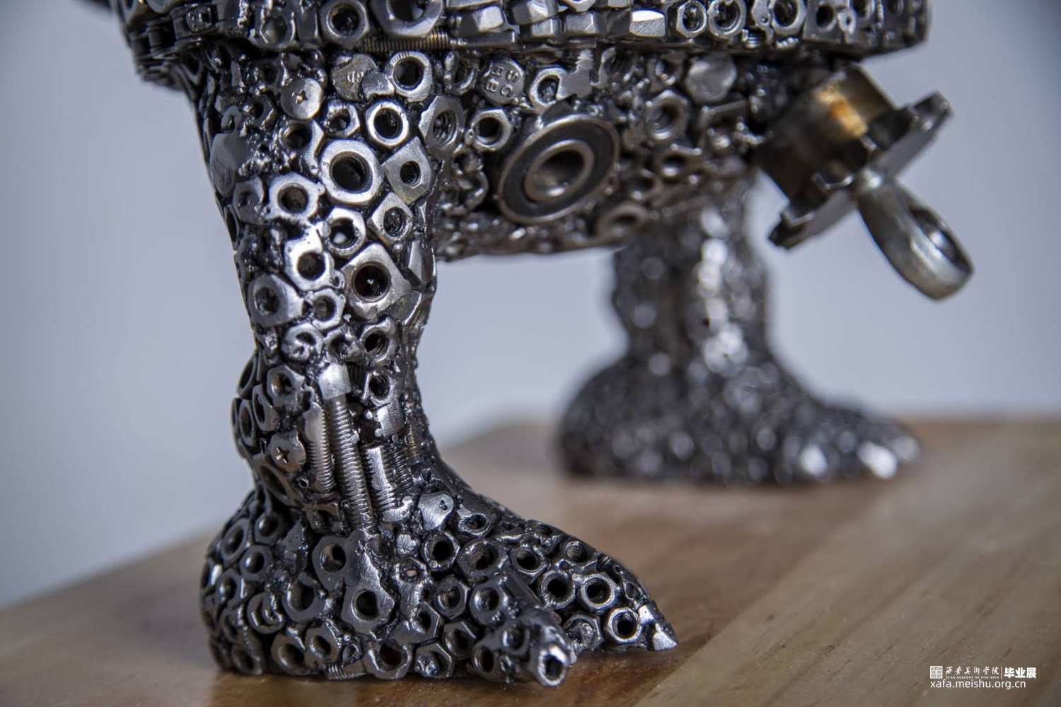 本组作品的创新点在于,四个作品的主题形象完全是再设计的新形象,整个作品面对不同年龄阶段的观众都会带来不同的视觉感受。金属焊接工艺品雕塑本身就是一种具有现代意义的艺术表现形式,它将艺术语言更直接的融合在艺术的创作过程中,赋予其丰富的人文精神审美内涵,有力的拓展了作品的表现力和感染力。材料成品的质感最后也直接的影响着作品的形态。本组作品元素焊接过程中,同时利用点、线、面形体的穿插,想运用空间构成的律动感去凸显雕塑形体上的运动感。金属元素材料的焊接,使作品具有很多细节性,不单单使用螺丝和螺帽小元素,在零件的使用上,注意形体的转折关系,尽可能的点缀轴承,齿轮,金属弹珠等,使整个雕塑具有丰富性。后期打磨阶段尽可能的顺着外部形体走势打磨,尽最大可能保留了金属的时间感和铁锈的生冷性。