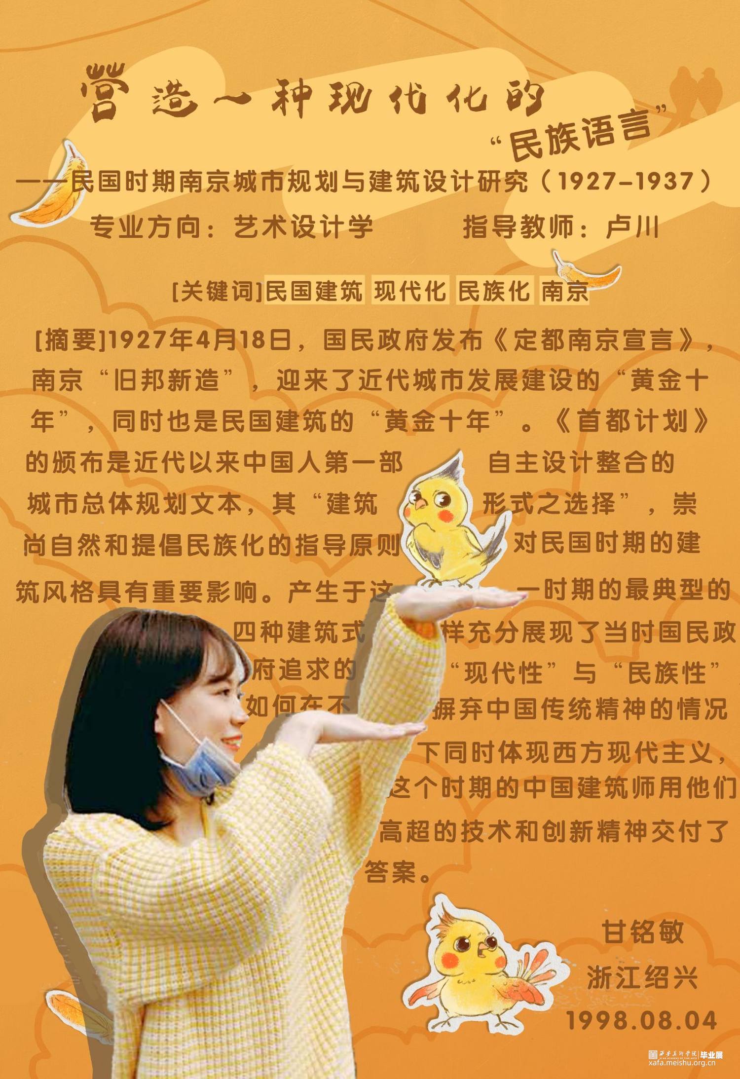 1927 年 4 月 18 日,国民政府发布《定都南京宣言》,南京“旧邦新造”,迎来 了近代城市发展建设的“黄金十年”,同时也是民国建筑的“黄金十年”。《首都计划》 的颁布是近代以来中国人第一部自主设计整合的城市总体规划文本,其“建筑形式之选 择”,崇尚自然和提倡民族化的指导原则,对民国时期的建筑风格具有重要影响。产生 于这一时期的最典型的四种建筑式样充分展现了当时国民政府追求的“现代性”与“民 族性”,如何在不摒弃中国传统精神的情况下同时体现西方现代主义,这个时期的中国 建筑师用他们高超的技术和创新精神