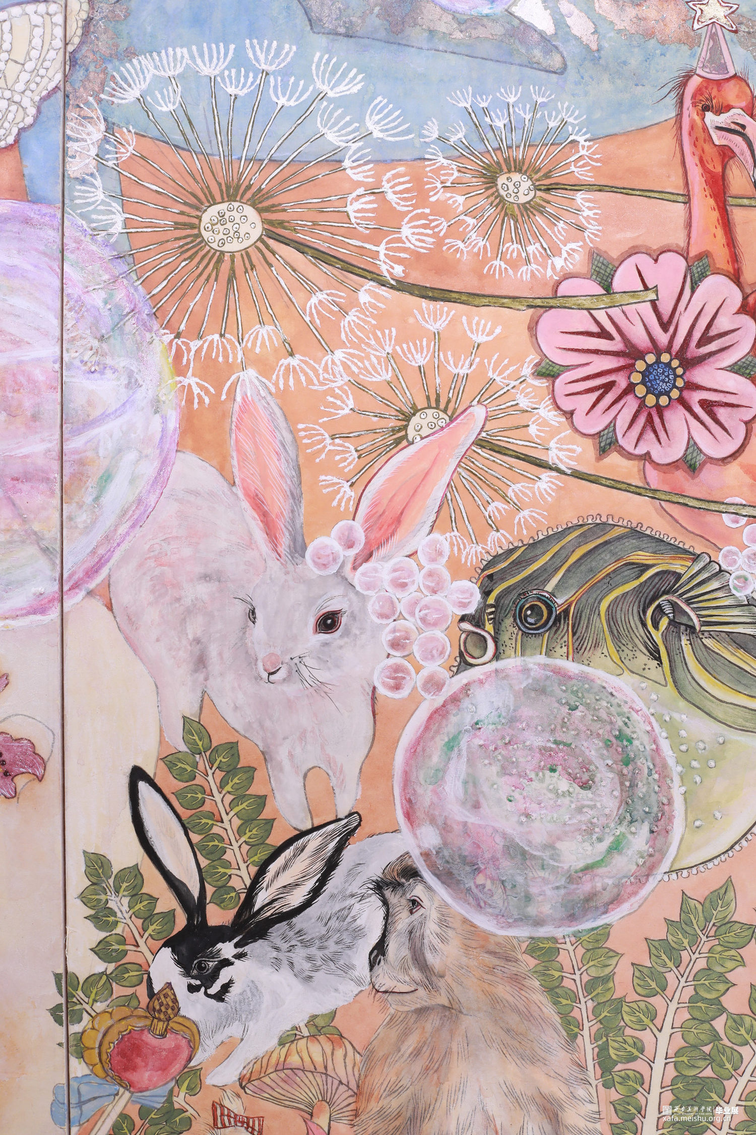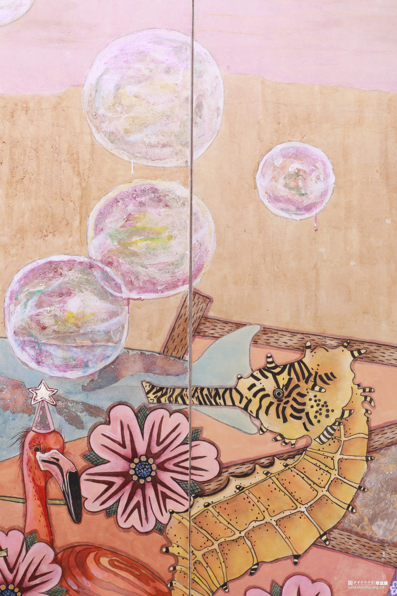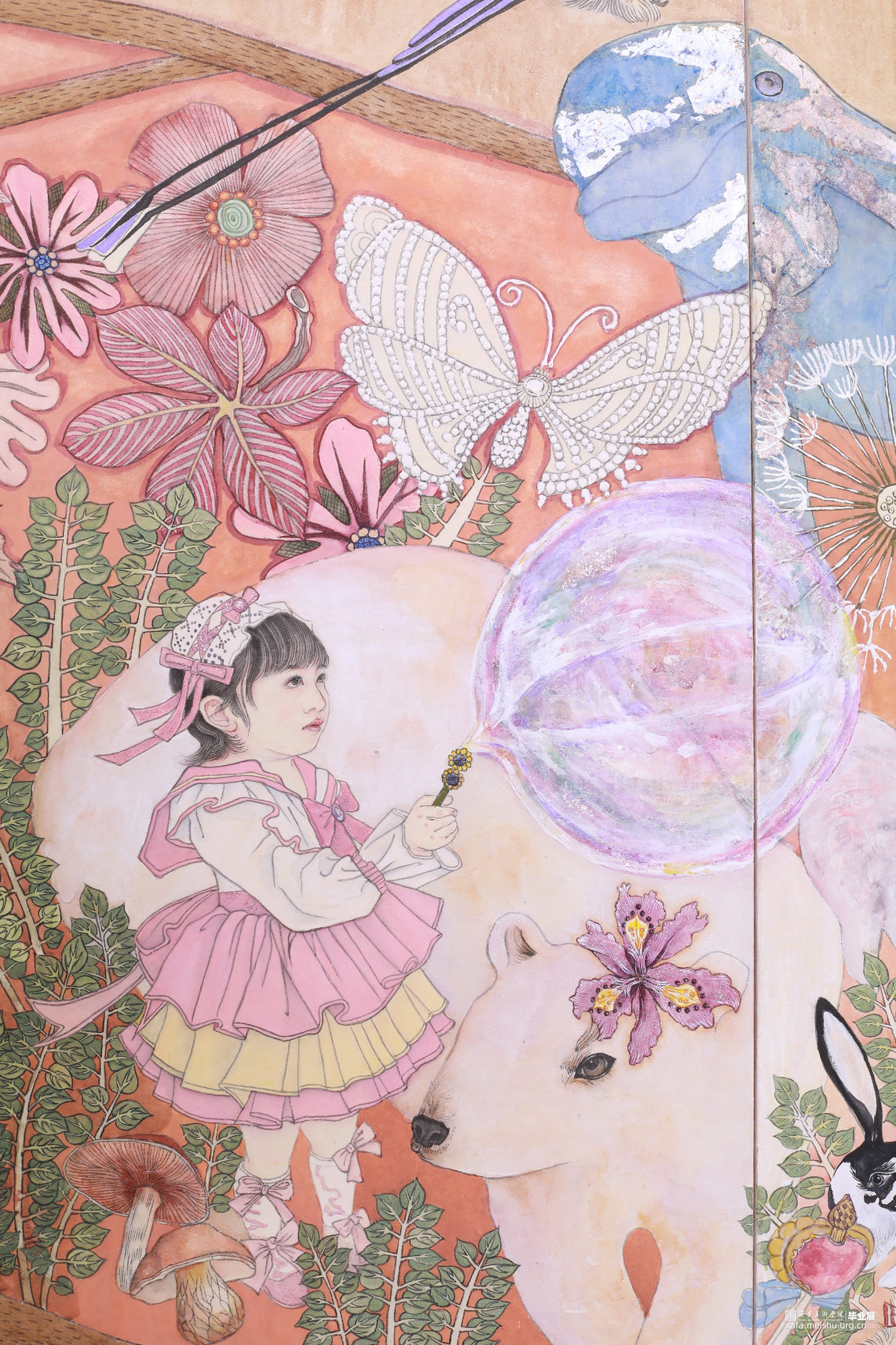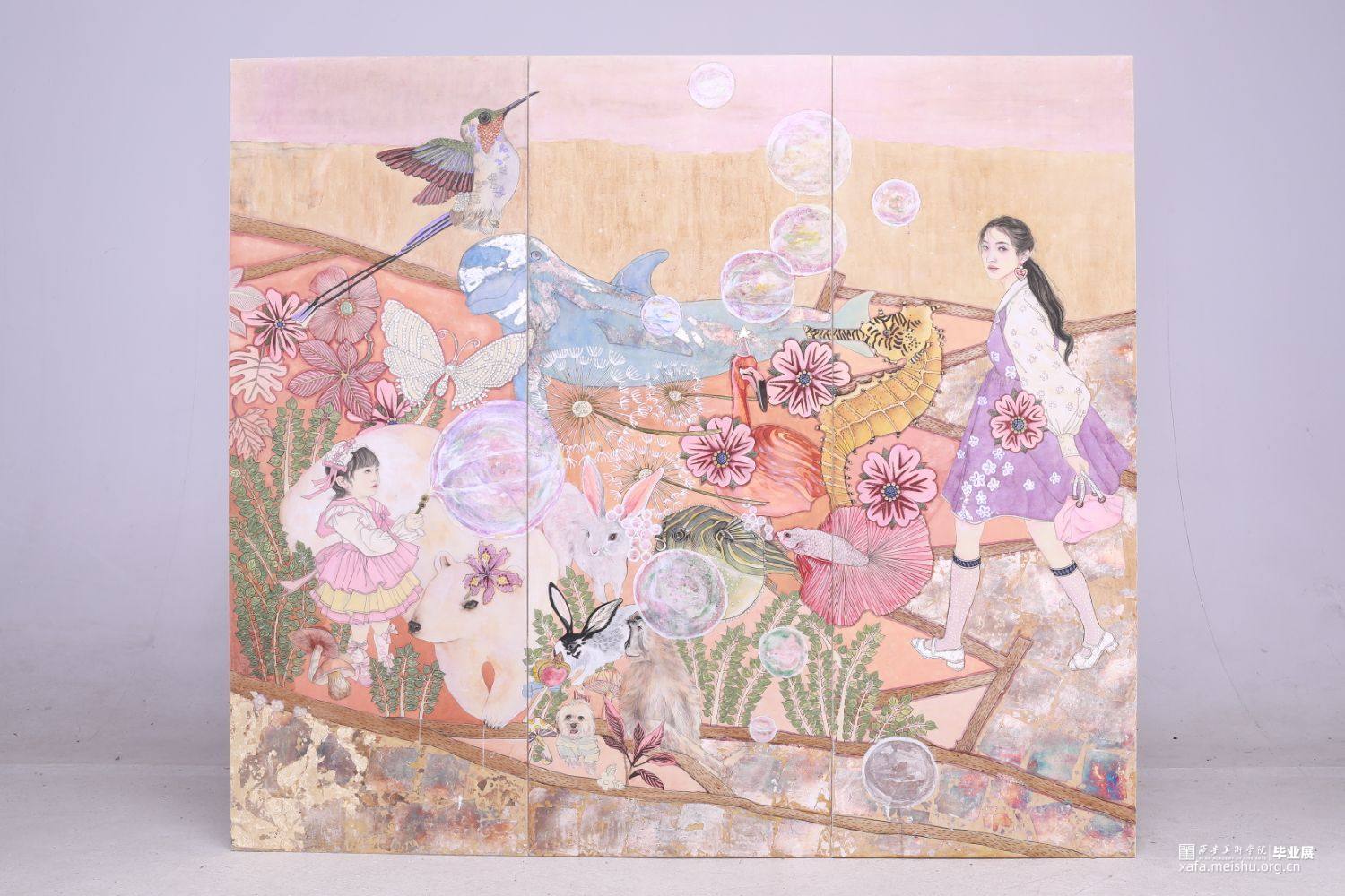 偶然间翻到相册,看到儿时的我,同样的场景,同样的事物。虽然在不一样的地方,然而两个我都身处在同一种幸福轻松的气氛里,可是我无法创造一个平行的时空,我想和儿时的我对话,想回到过去。还记得小时候老哼到的一首歌的歌词是“我不想,我不想,不想长大!长大后世界就没童话…”,于是我想通过自己的画笔把这个梦想实现!我选择这两个时期的我组成同一组画面,是我的个性的内在表达。而童年的回忆就像泡泡一样,只能在旧的相册中找到,是我对回忆的诉说。