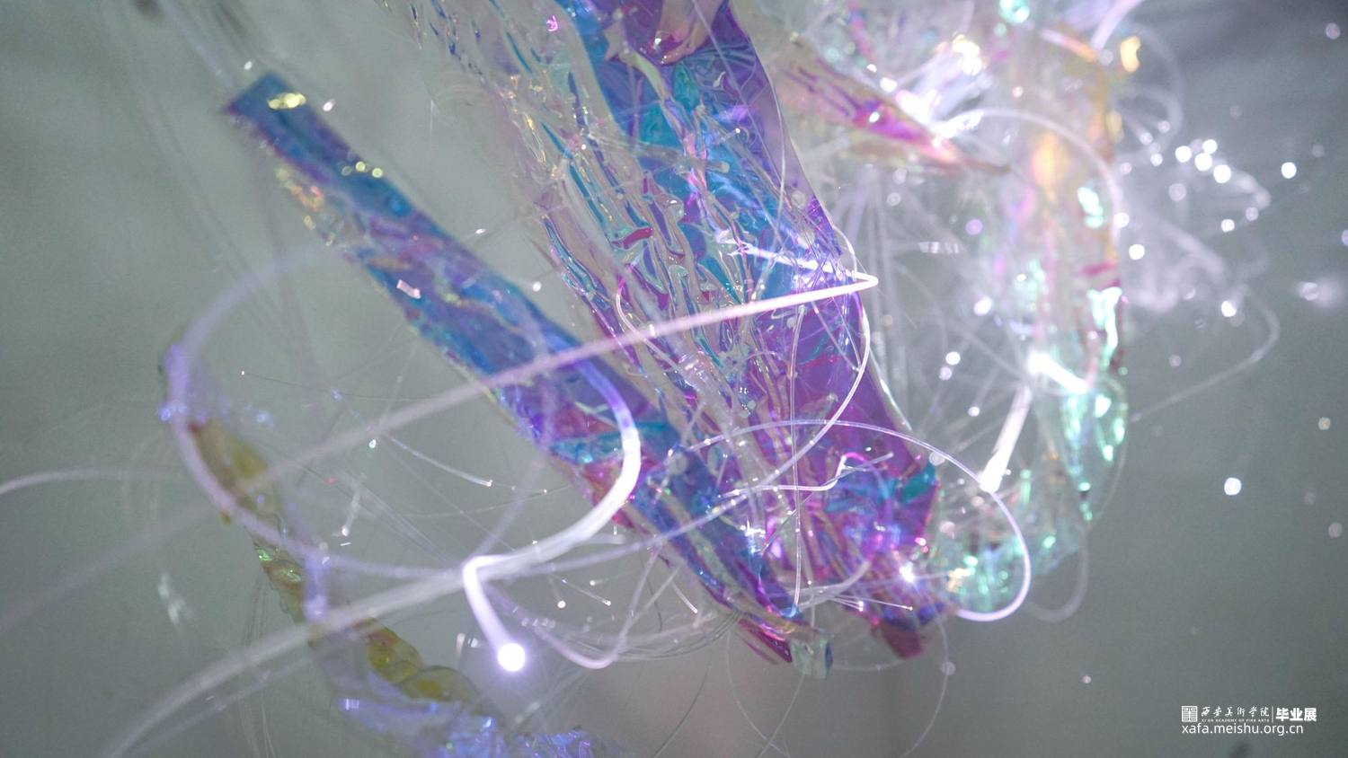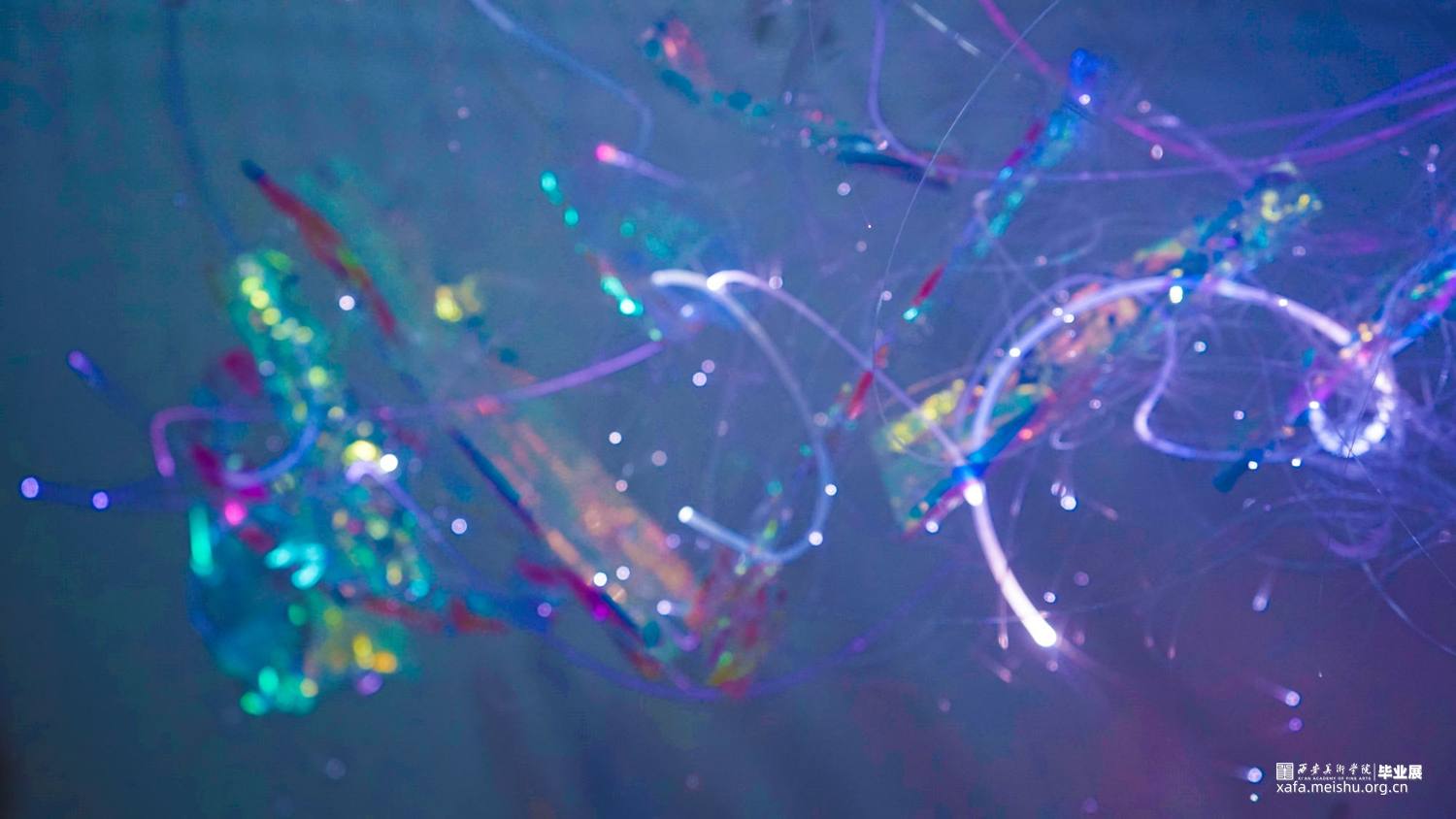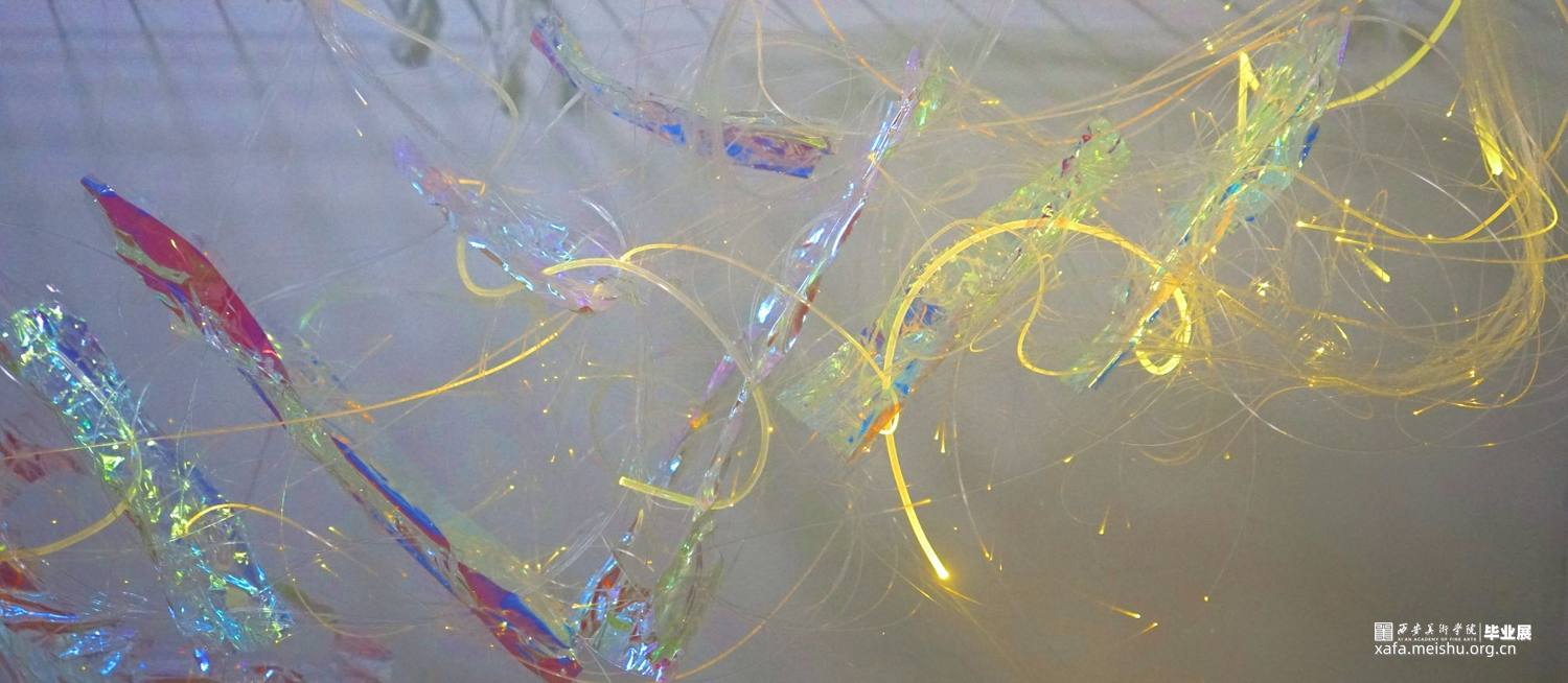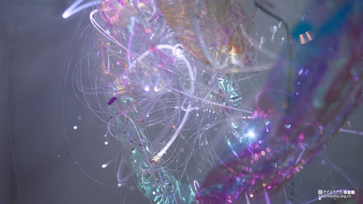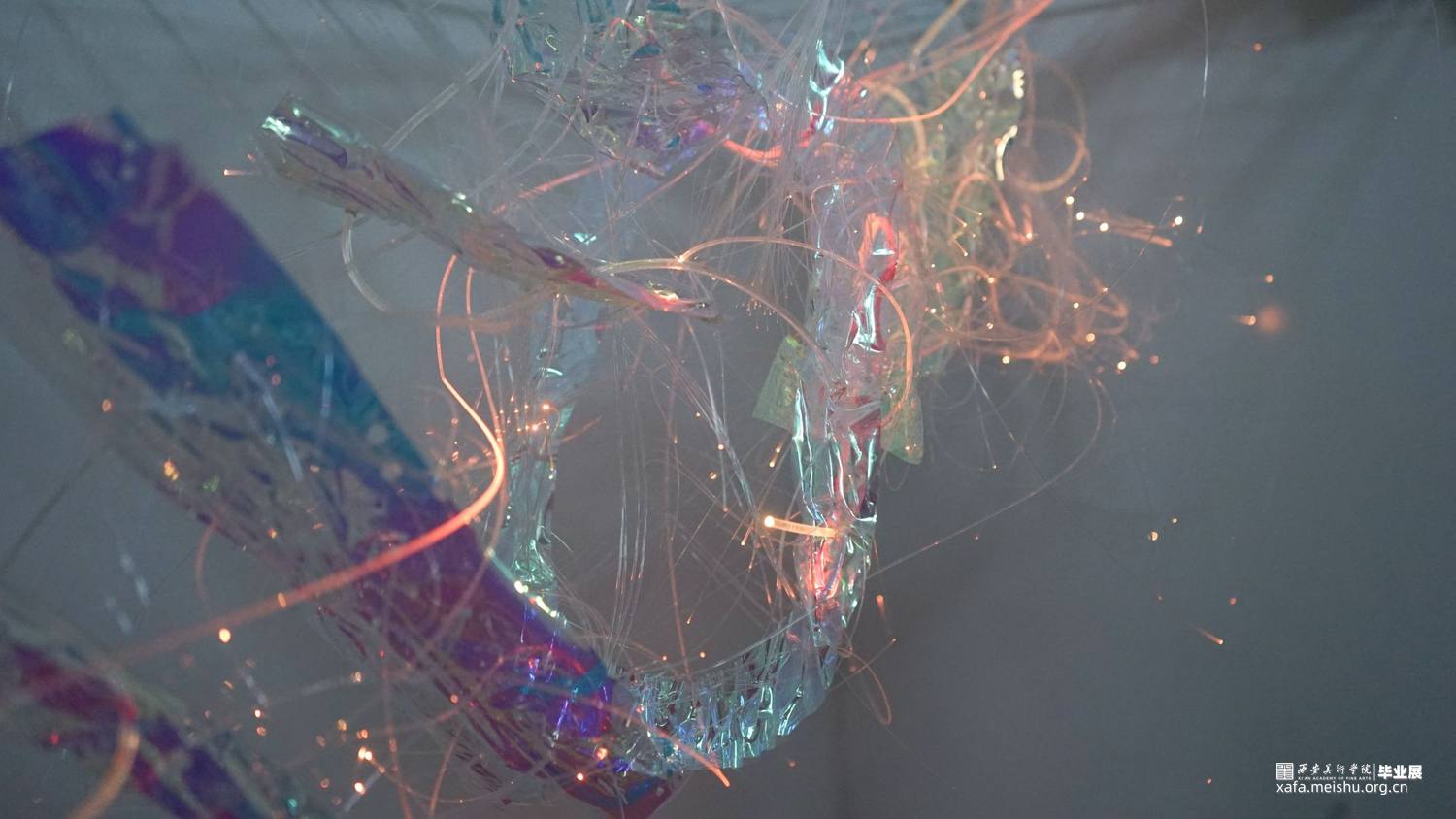 旧时光总让人觉得生动、绵长,对此的追寻是我一直在构思的创作方向,有了这样的想法我开始进行了草图的绘制,思考什么材料可以表达时光绵长的效果,最后选用的光导纤维和镭射纸,光导纤维型号、大小不一样,可以传递的光的长度与亮度也不一样,有些导光条可以整条都发光;有的只在头部和尾部发光;甚至还有在中间某个点发光的……就好比脑海中记忆存在的时长不一样,被遗忘的时间也不一样。镭射纸特别的属性是它折射的光的颜色随着角度和方向的不同随时都在发生变化,镭射纸+PVC板贴合再热弯穿孔,PVC板和镭射纸都是较硬质地的材料,将它们的特性进行改变,以热弯的效果与软性的光纤进行碰撞搭配,光纤缠绕、穿梭在记忆杂物组成的漩涡中并且穿孔而入,串联起每一片可能交错、重叠,或许甚至毫无交集的镭射板,镭射板同时会影响光纤的颜色变化,这可以物化我的创作构思。