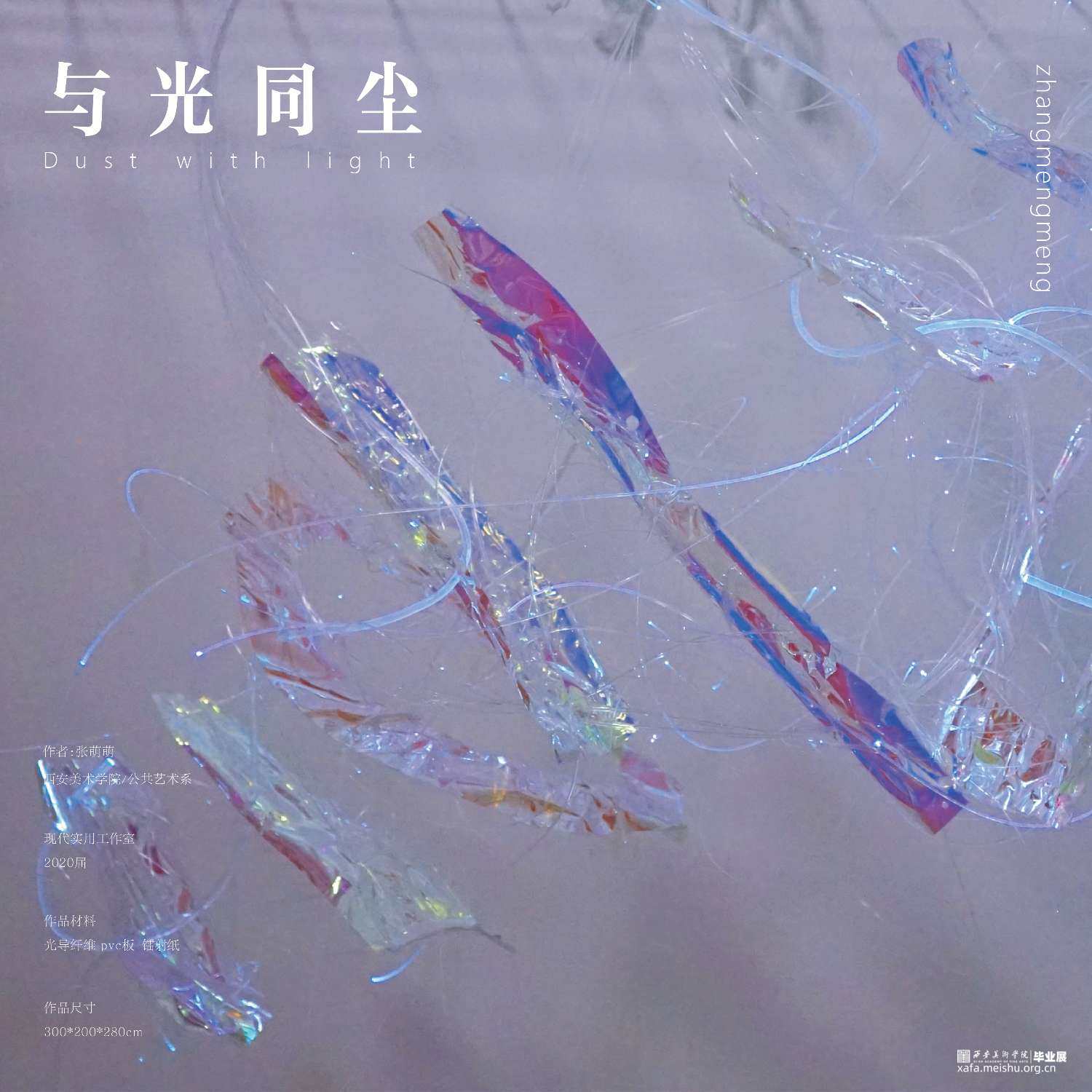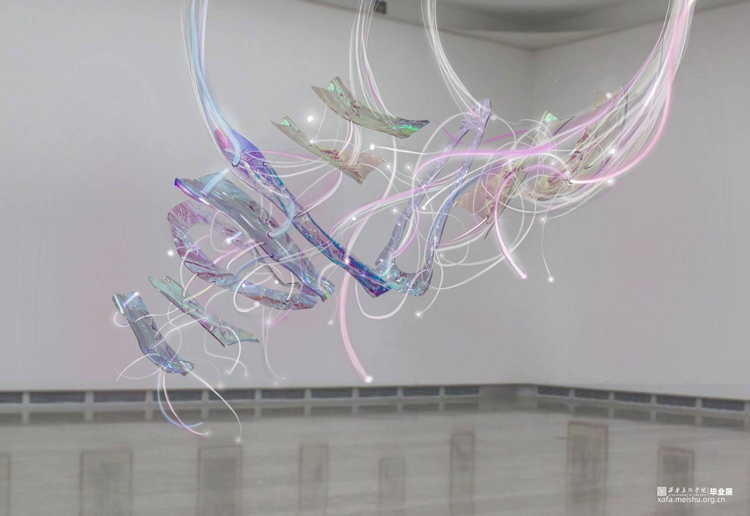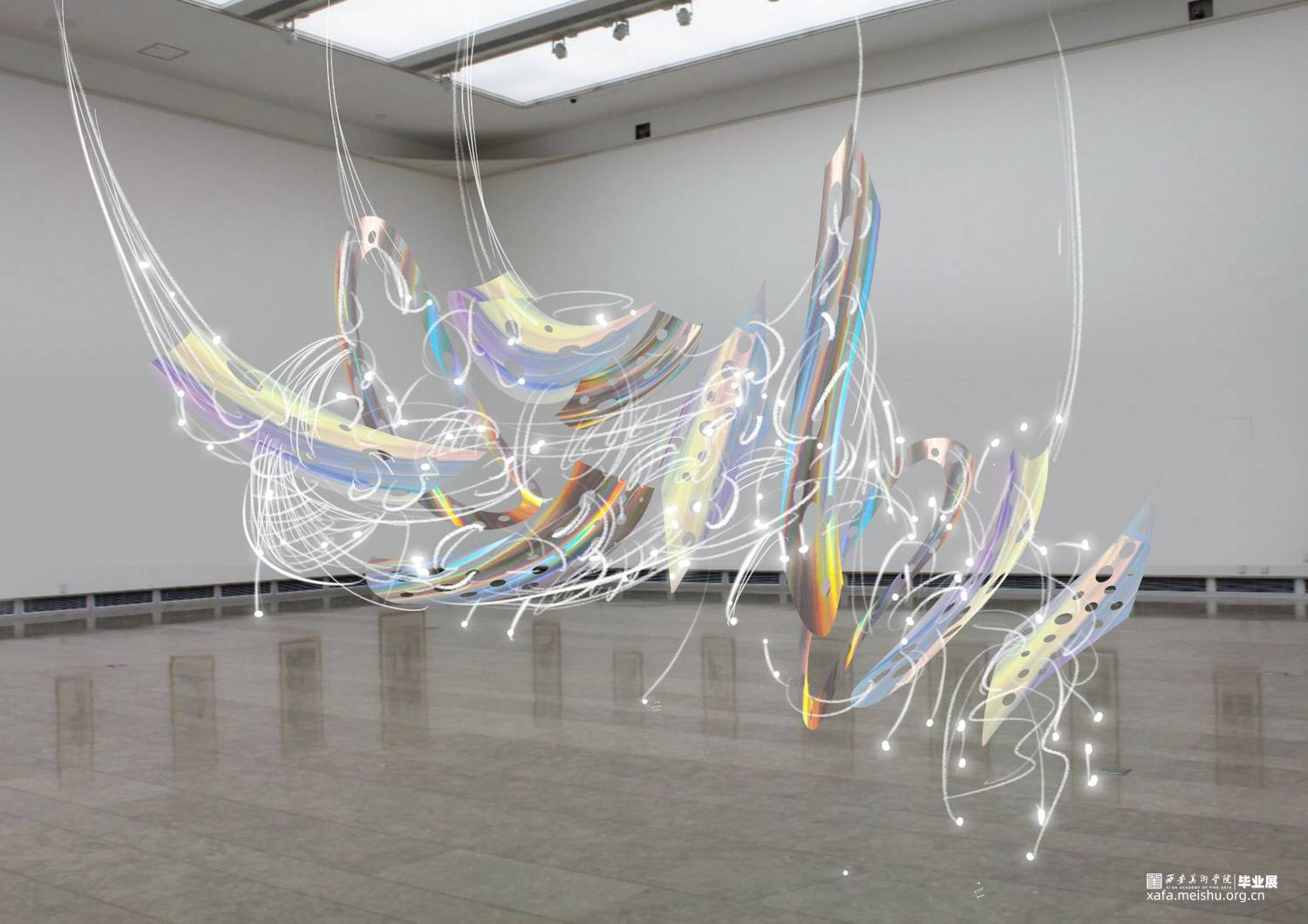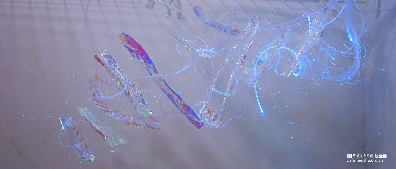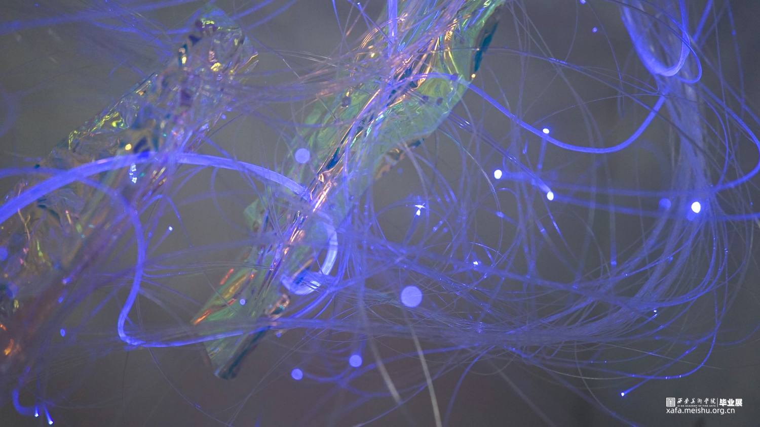 旧时光总让人觉得生动、绵长,对此的追寻是我一直在构思的创作方向,有了这样的想法我开始进行了草图的绘制,思考什么材料可以表达时光绵长的效果,最后选用的光导纤维和镭射纸,光导纤维型号、大小不一样,可以传递的光的长度与亮度也不一样,有些导光条可以整条都发光;有的只在头部和尾部发光;甚至还有在中间某个点发光的……就好比脑海中记忆存在的时长不一样,被遗忘的时间也不一样。镭射纸特别的属性是它折射的光的颜色随着角度和方向的不同随时都在发生变化,镭射纸+PVC板贴合再热弯穿孔,PVC板和镭射纸都是较硬质地的材料,将它们的特性进行改变,以热弯的效果与软性的光纤进行碰撞搭配,光纤缠绕、穿梭在记忆杂物组成的漩涡中并且穿孔而入,串联起每一片可能交错、重叠,或许甚至毫无交集的镭射板,镭射板同时会影响光纤的颜色变化,这可以物化我的创作构思。