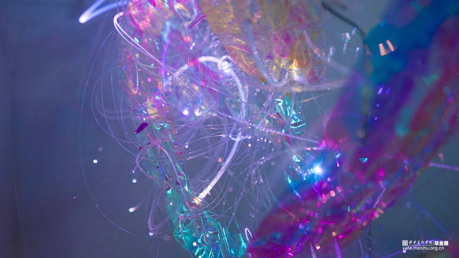 接下来就是实物制作了,首先做了一个支撑架,下一步将镭射纸和pvc板裁剪成草图中的大小,将它们粘贴在一起,再用热风机进行热弯变形做成草图的形状,最后用几种型号的电钻进行打孔,做好镭射板之后就是将它们依次用鱼线挂在铁网上面, 然后把各种型号的光纤分组,找到一个最高点进行位置固定,再依次编织到镭射板里面,大概分了十多屡光纤,分插到各个镭射板中又变成了无数屡。做好之后再对整体进行造型的轻微调整,最后把每组光纤进行合并,安装发光装备,整个实物模型就做好了。