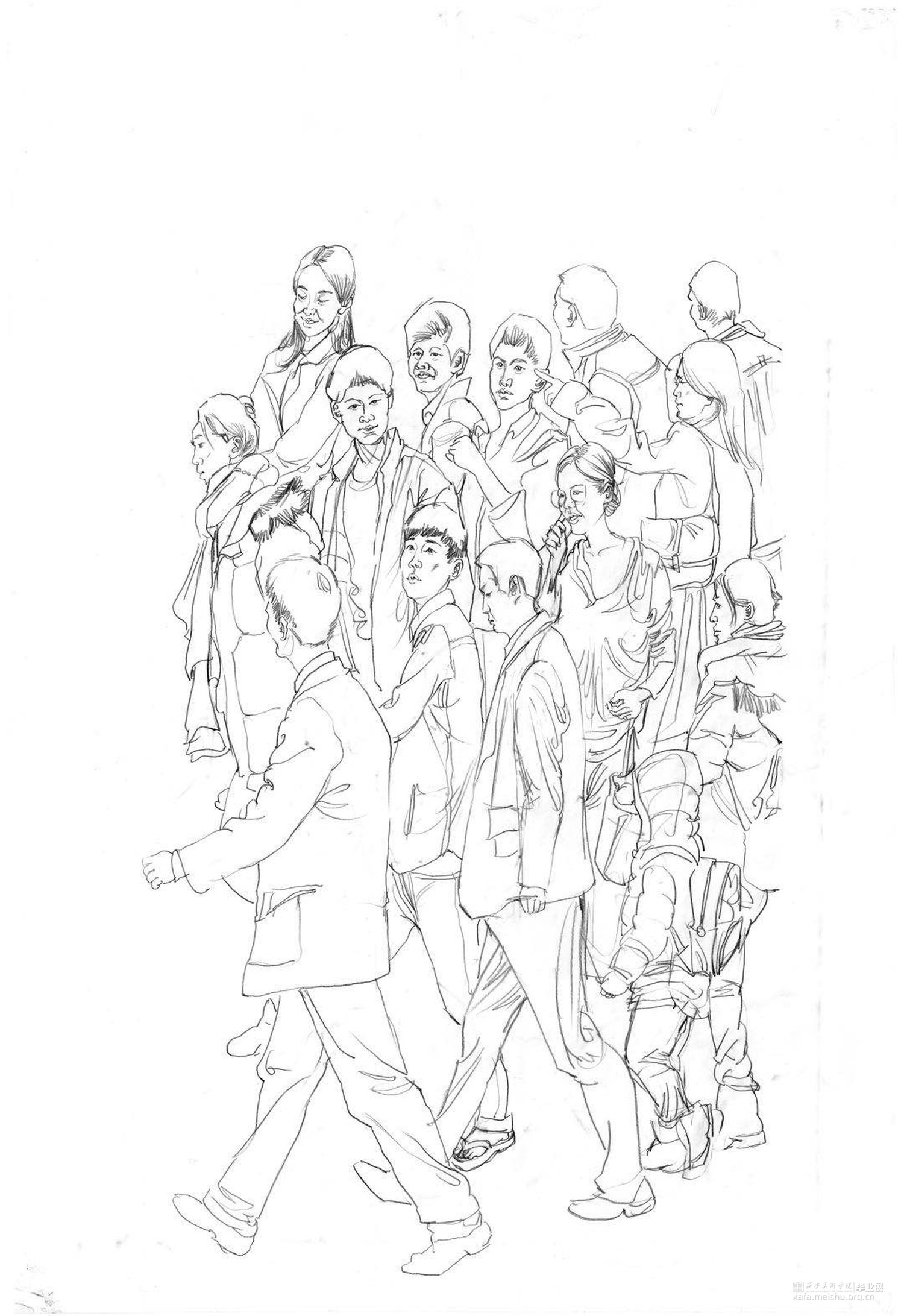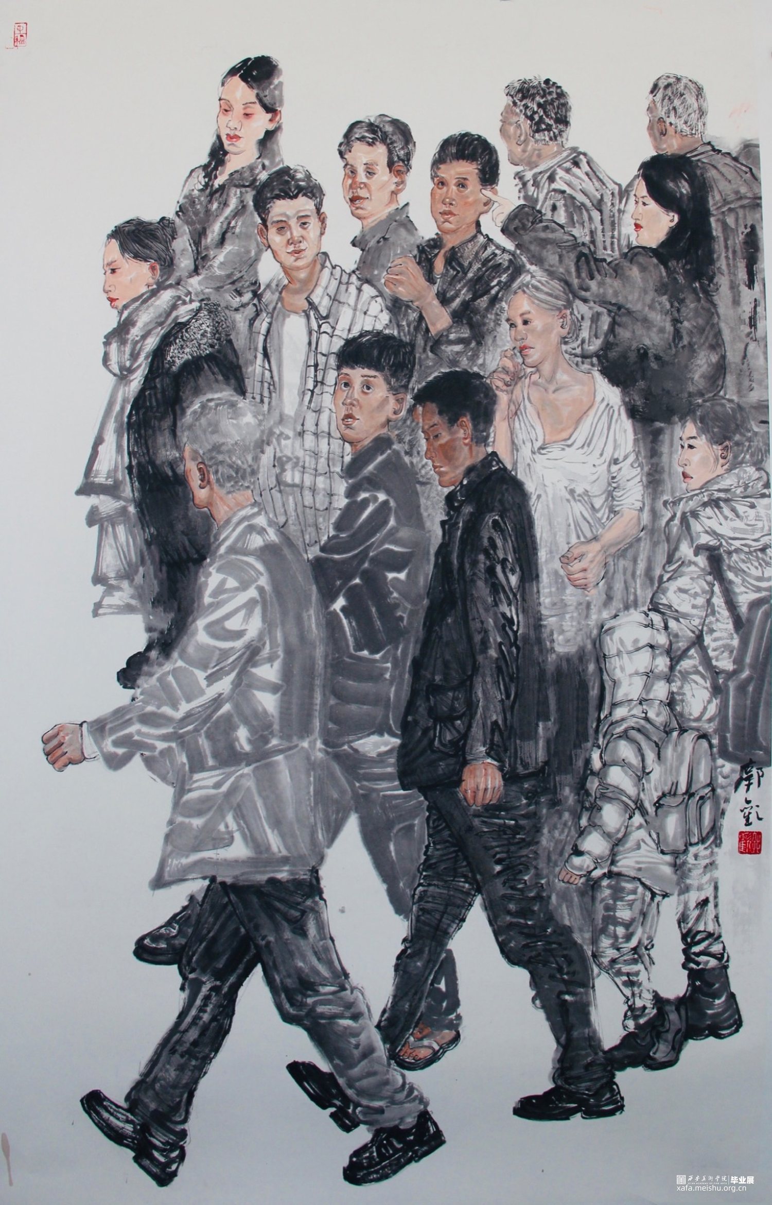 二十二岁,即将大学毕业的我们面临未来充满了迷茫。我们站在人生的十字路口很迷茫无助。我创作的这幅作品表达了我对于青春时期的迷茫无助以及当代年轻人的迷茫和对未来的困惑。我创作这幅作品是用人物群像的方式通过不同青年人的情绪特点表现出青年人的迷茫,人物在行走中表现出不同人物的特点让人物形成一种动势形成一个团块。具有整体的力量。意在对青年人的规范及表演模式的冲破。人群行走的驶向并非愚昧、邪恶、错觉,而是走向为人的精神留有幻想、发泄、异轨、解放与自由可能性的模糊地带,是青年人面向未来向往挣脱理性枷锁的束缚和避免精神同