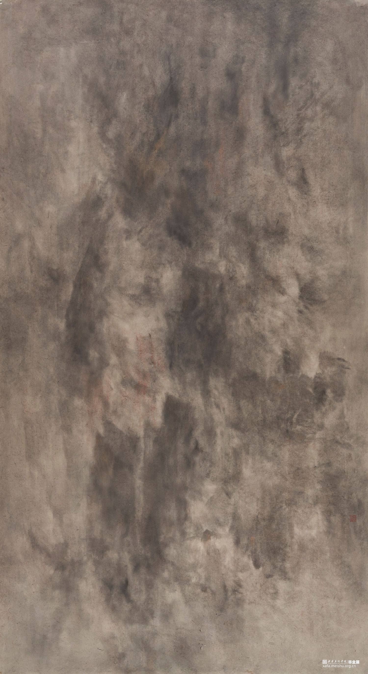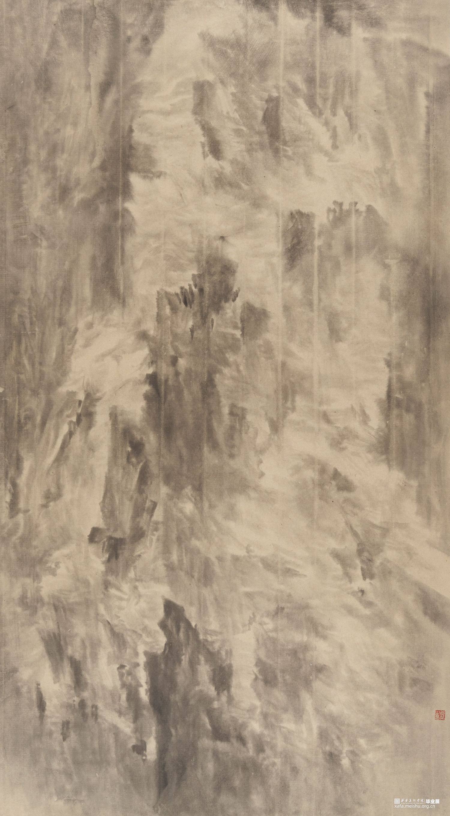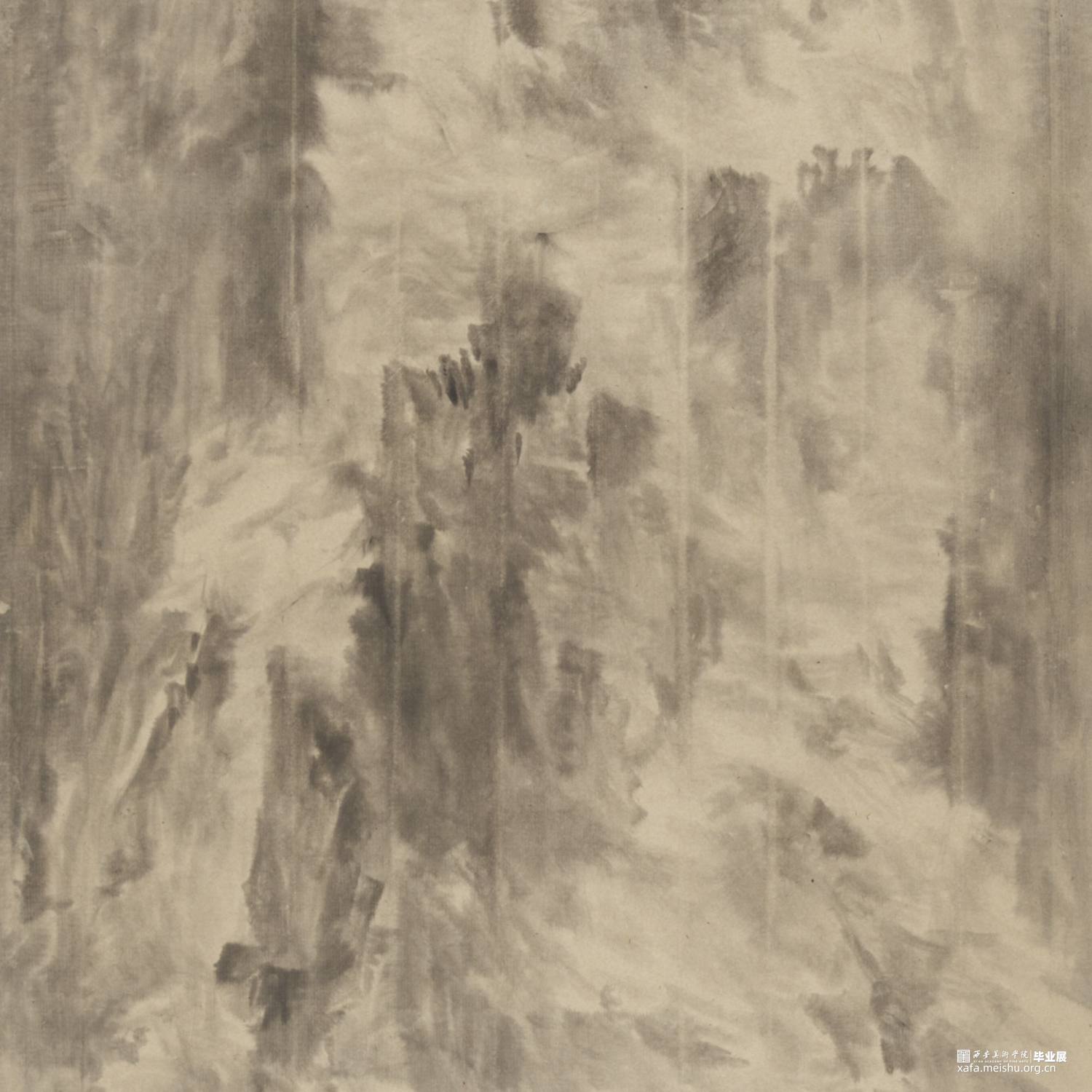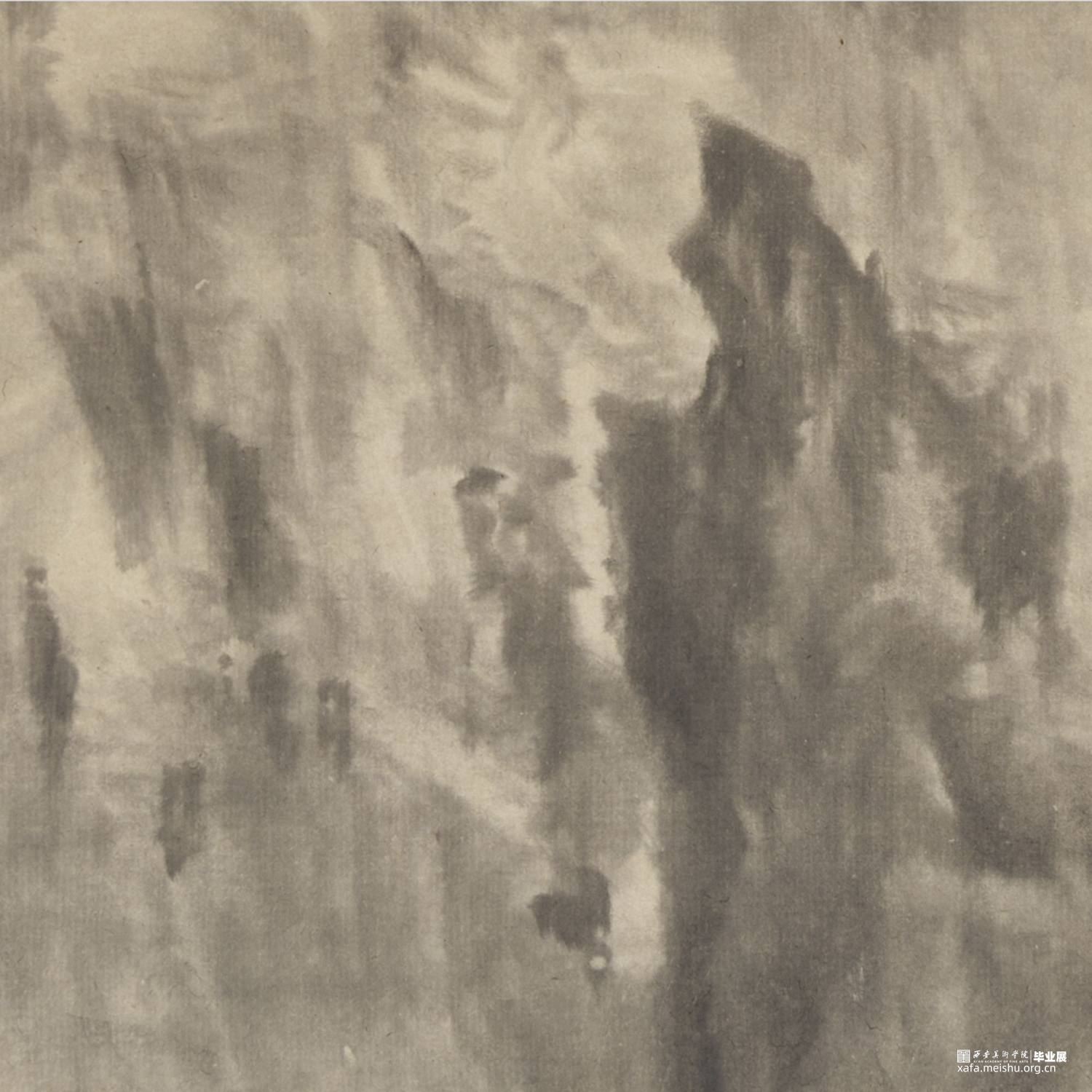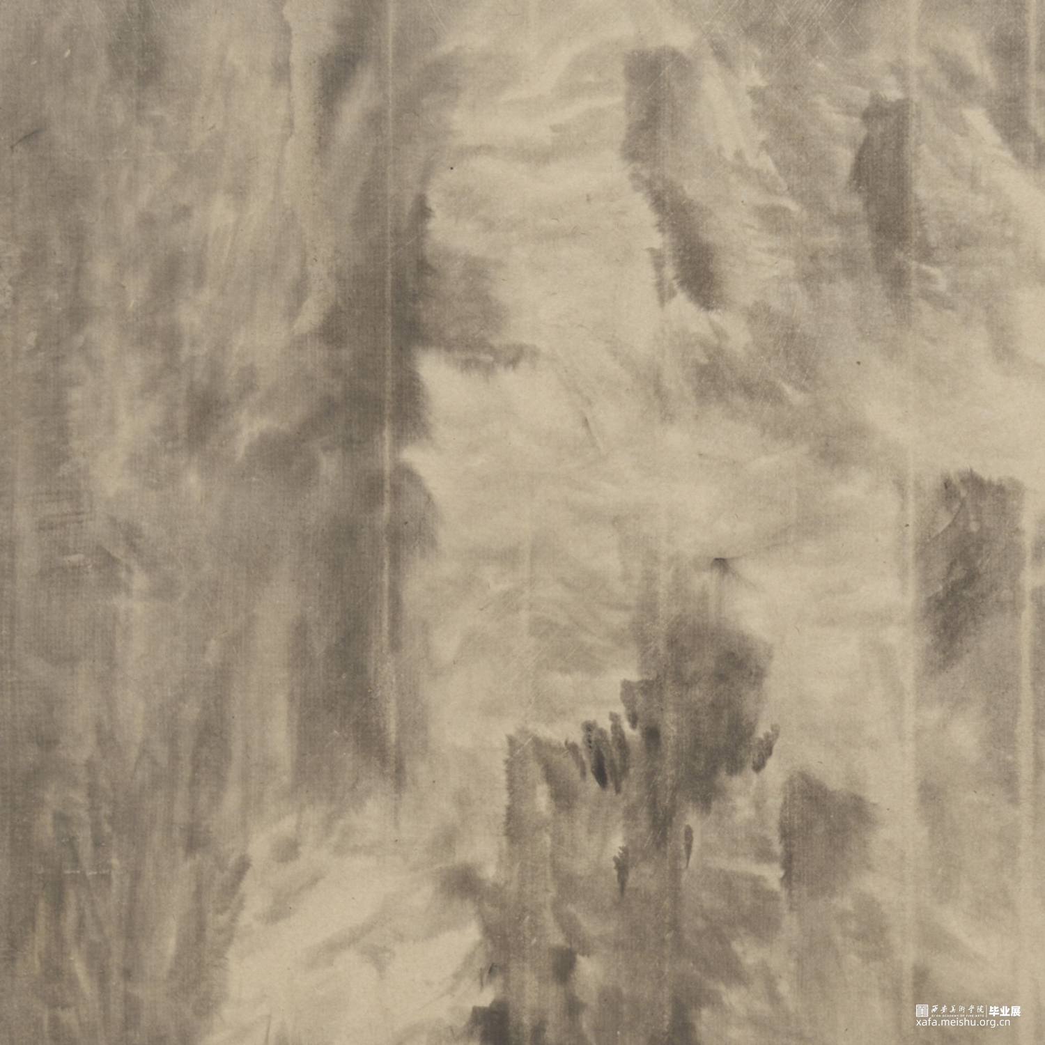 以径之奇怪论,画不如山水。以笔墨之精妙论,则山水绝不如画。在景与境的关系中找到画面的和谐之处,区别于景又高于景。《山外山》这一系列主要运用大块的山、墨块等等构成,运用淡墨的层层积染,削弱客观的细节,强调画面的经营。使画面产生一种朦胧、幻想之感,使观者能够凭借自己的主观意识折射出自然物象,达到相由心生、境随心转的画面效果。构图上通过大开合的方法明确画面主要的走势,细节方面主要体现在局部的墨色变化意趣,而不是具体的刻画物体。通过反复的用笔、点染产生森罗万象的画面效果。颜色上大体以墨色为主,画面整体上有着松烟自带的淡青色与纸本底色,显得平淡宁静。局部运用丙烯铜色、金色等,运笔盖过,为画面添加律动的效果。