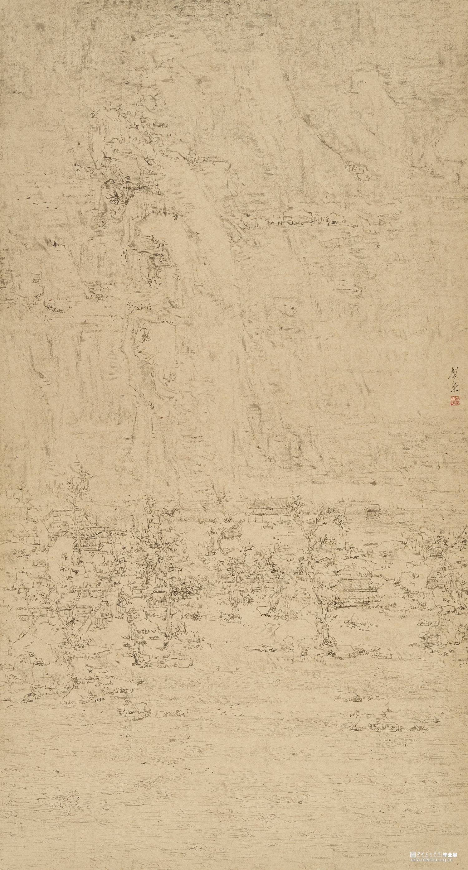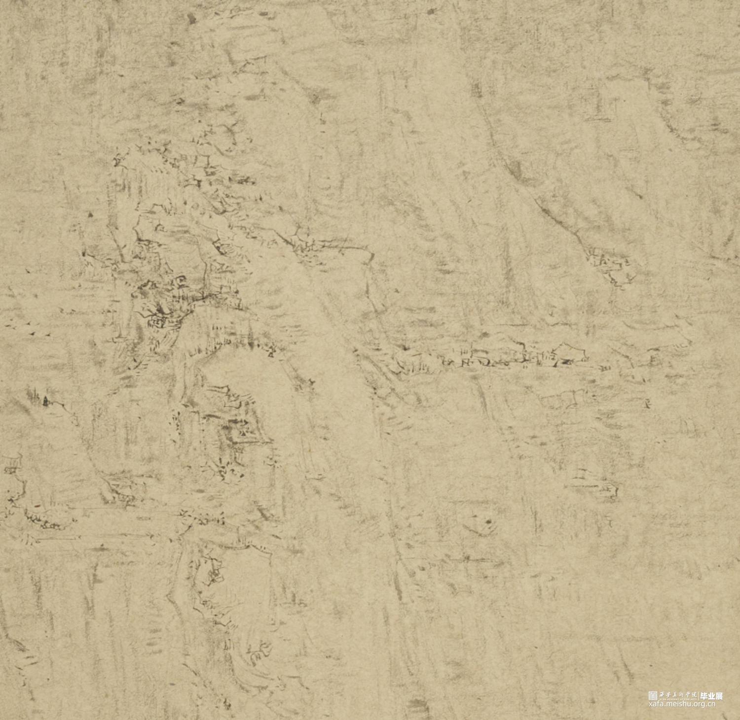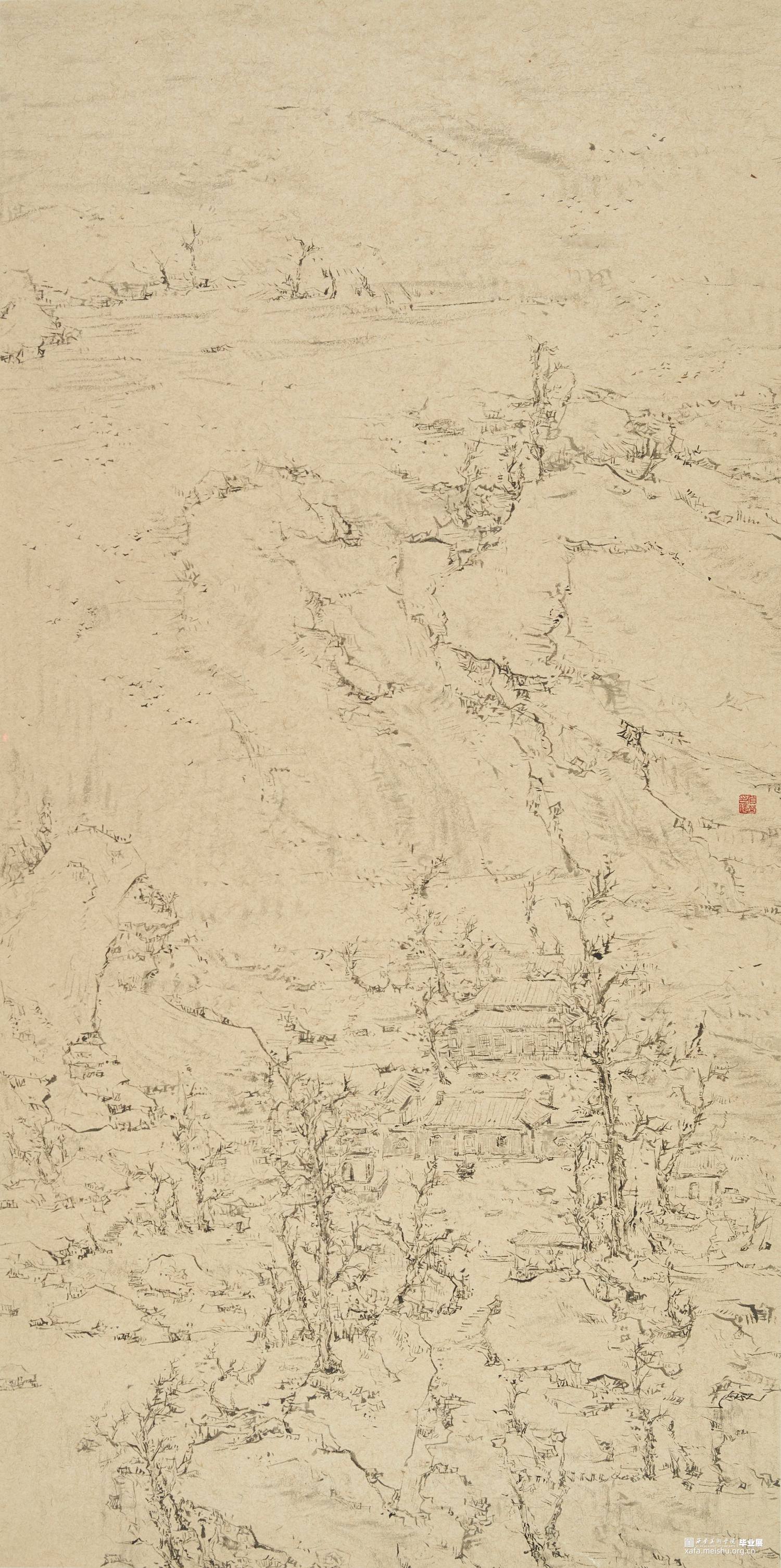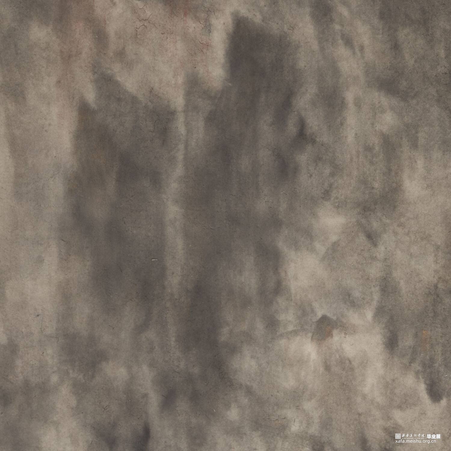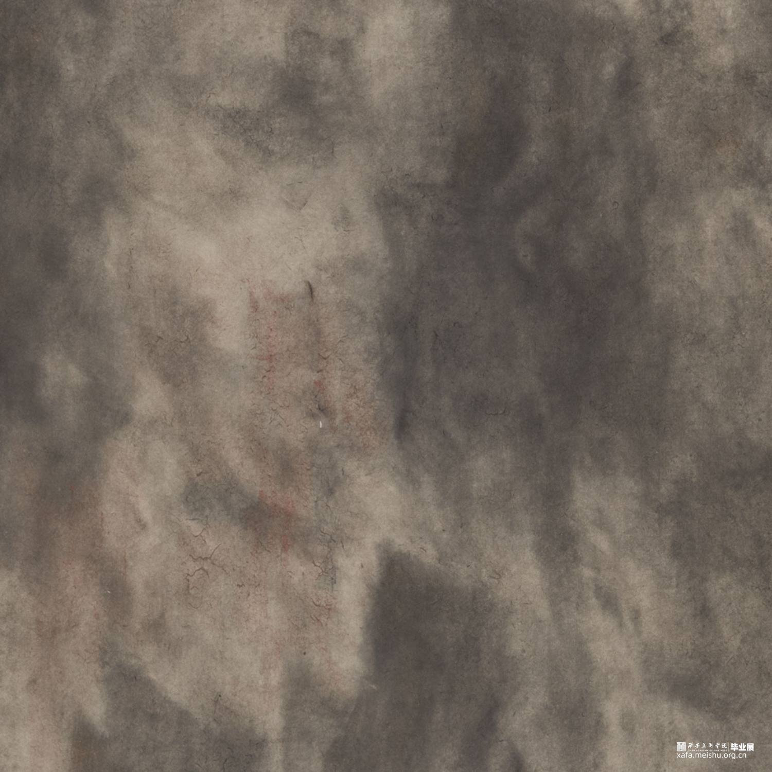 以径之奇怪论,画不如山水。以笔墨之精妙论,则山水绝不如画。在景与境的关系中找到画面的和谐之处,区别于景又高于景。《山外山》这一系列主要运用大块的山、墨块等等构成,运用淡墨的层层积染,削弱客观的细节,强调画面的经营。使画面产生一种朦胧、幻想之感,使观者能够凭借自己的主观意识折射出自然物象,达到相由心生、境随心转的画面效果。构图上通过大开合的方法明确画面主要的走势,细节方面主要体现在局部的墨色变化意趣,而不是具体的刻画物体。通过反复的用笔、点染产生森罗万象的画面效果。颜色上大体以墨色为主,画面整体上有着松烟自带的淡青色与纸本底色,显得平淡宁静。局部运用丙烯铜色、金色等,运笔盖过,为画面添加律动的效果。