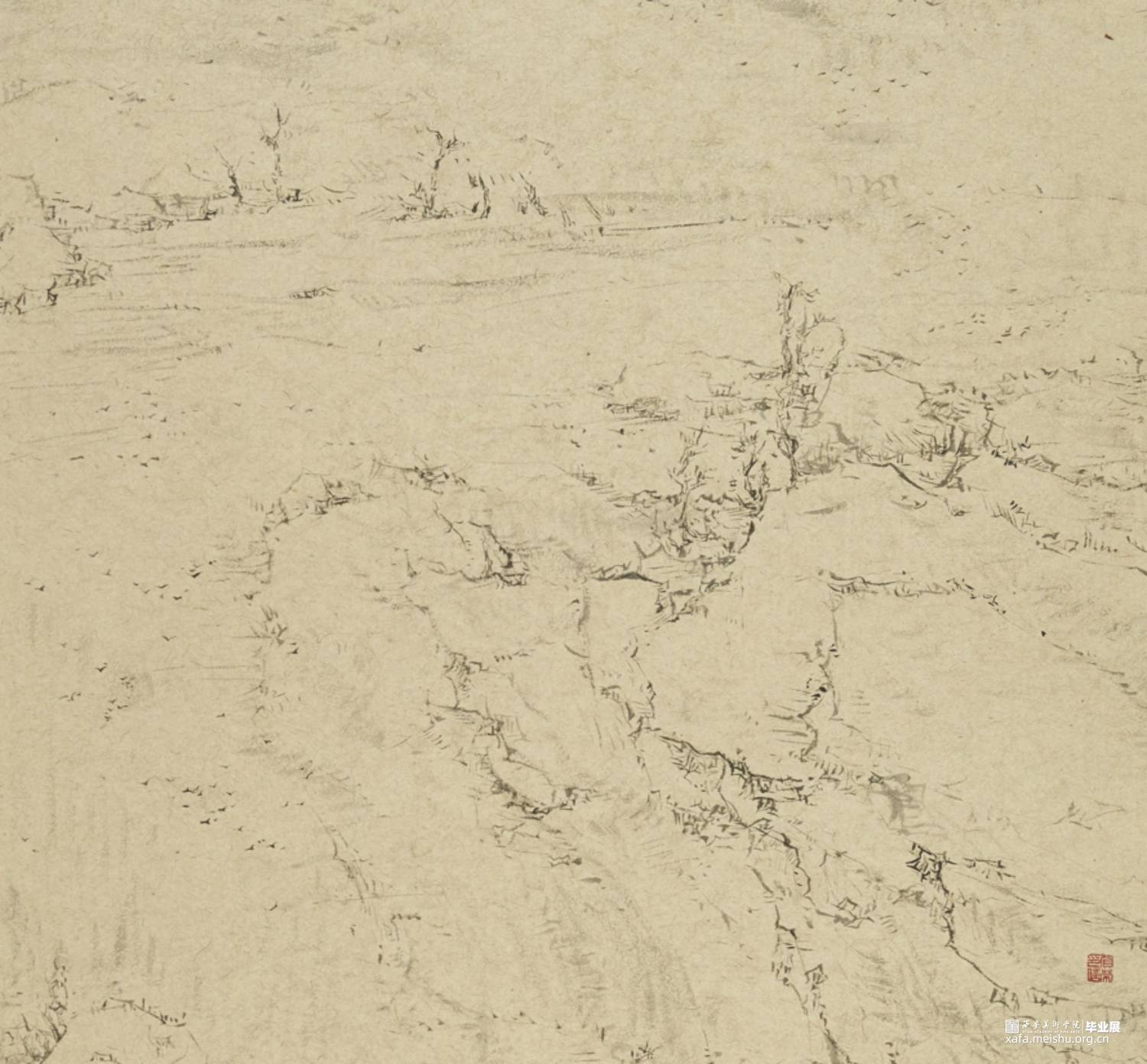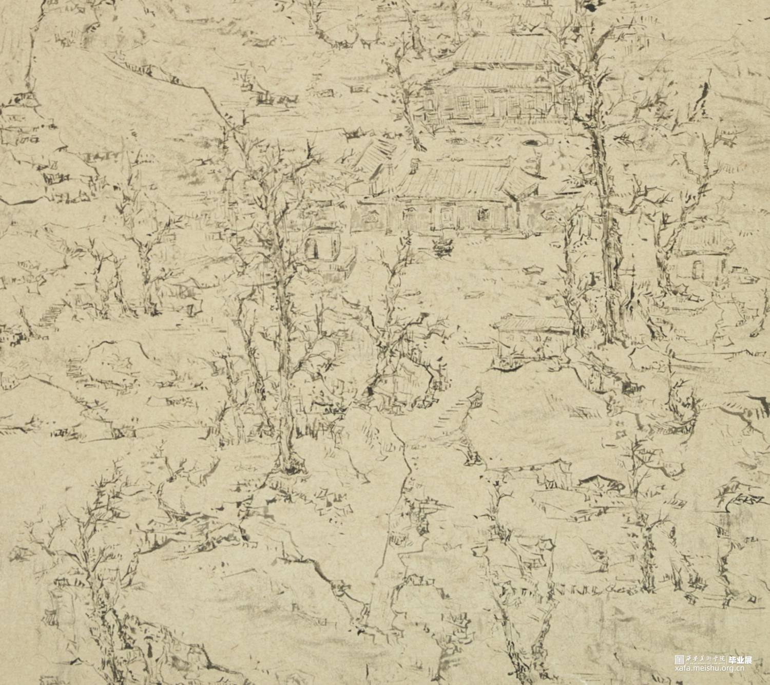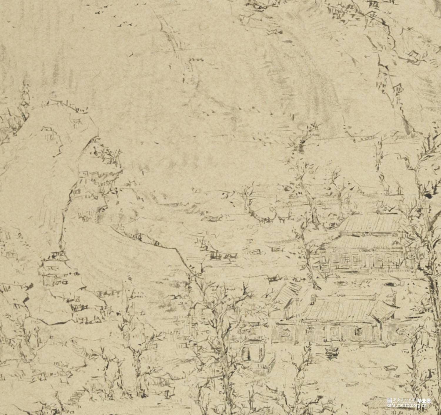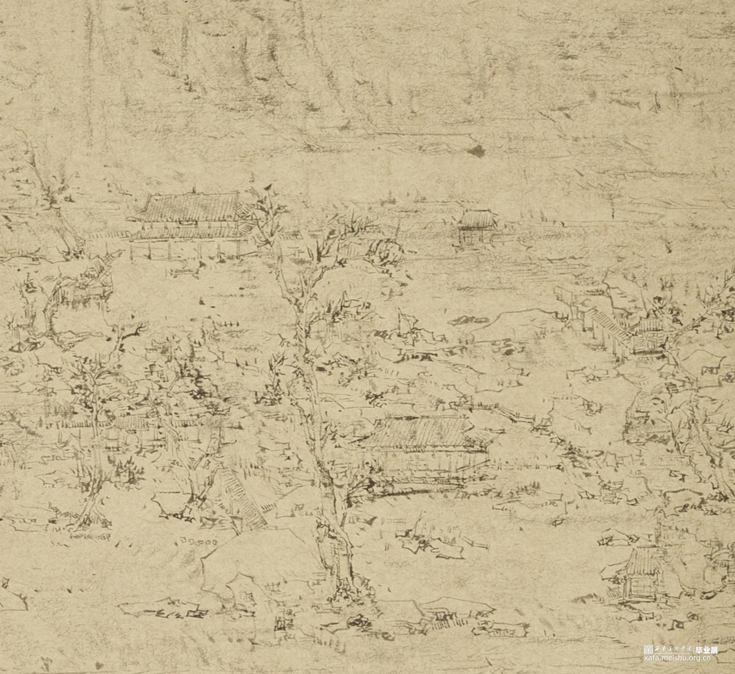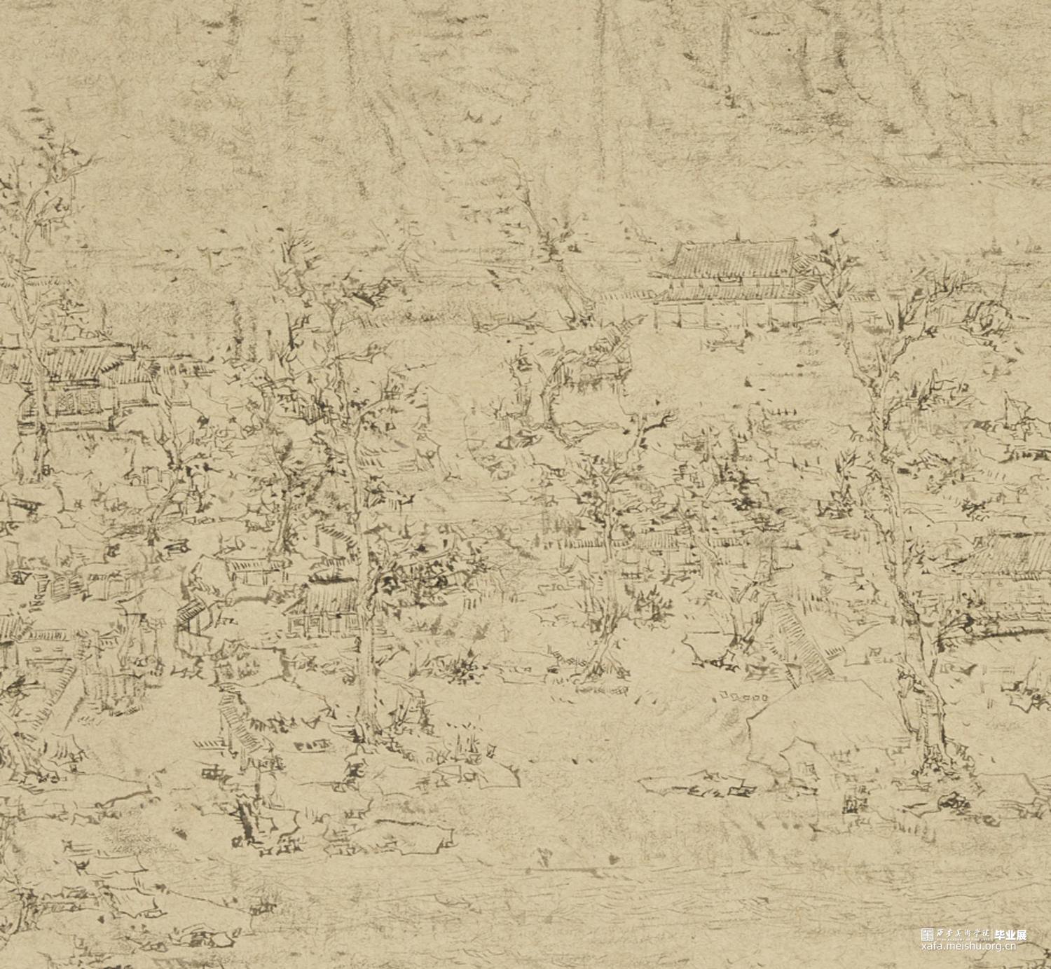 以径之奇怪论,画不如山水。以笔墨之精妙论,则山水绝不如画。在景与境的关系中找到画面的和谐之处,区别于景又高于景。《山外山》这一系列主要运用大块的山、墨块等等构成,运用淡墨的层层积染,削弱客观的细节,强调画面的经营。使画面产生一种朦胧、幻想之感,使观者能够凭借自己的主观意识折射出自然物象,达到相由心生、境随心转的画面效果。构图上通过大开合的方法明确画面主要的走势,细节方面主要体现在局部的墨色变化意趣,而不是具体的刻画物体。通过反复的用笔、点染产生森罗万象的画面效果。颜色上大体以墨色为主,画面整体上有着松烟自带的淡青色与纸本底色,显得平淡宁静。局部运用丙烯铜色、金色等,运笔盖过,为画面添加律动的效果。