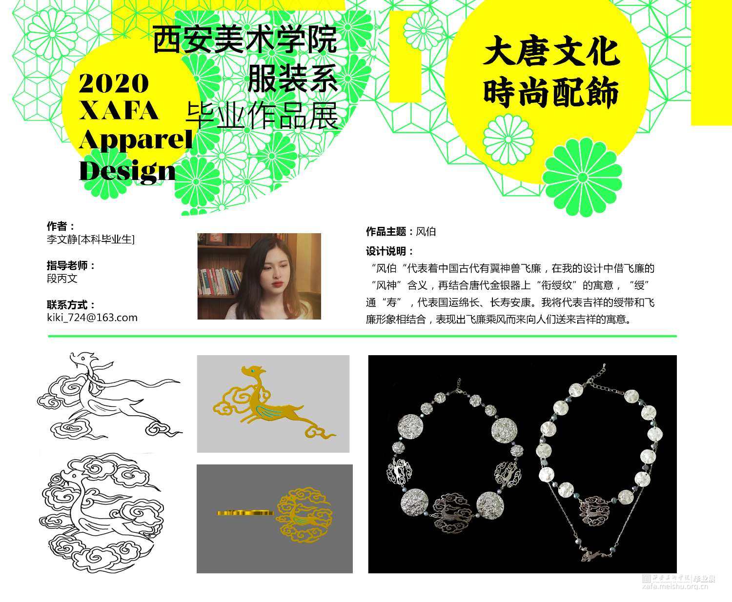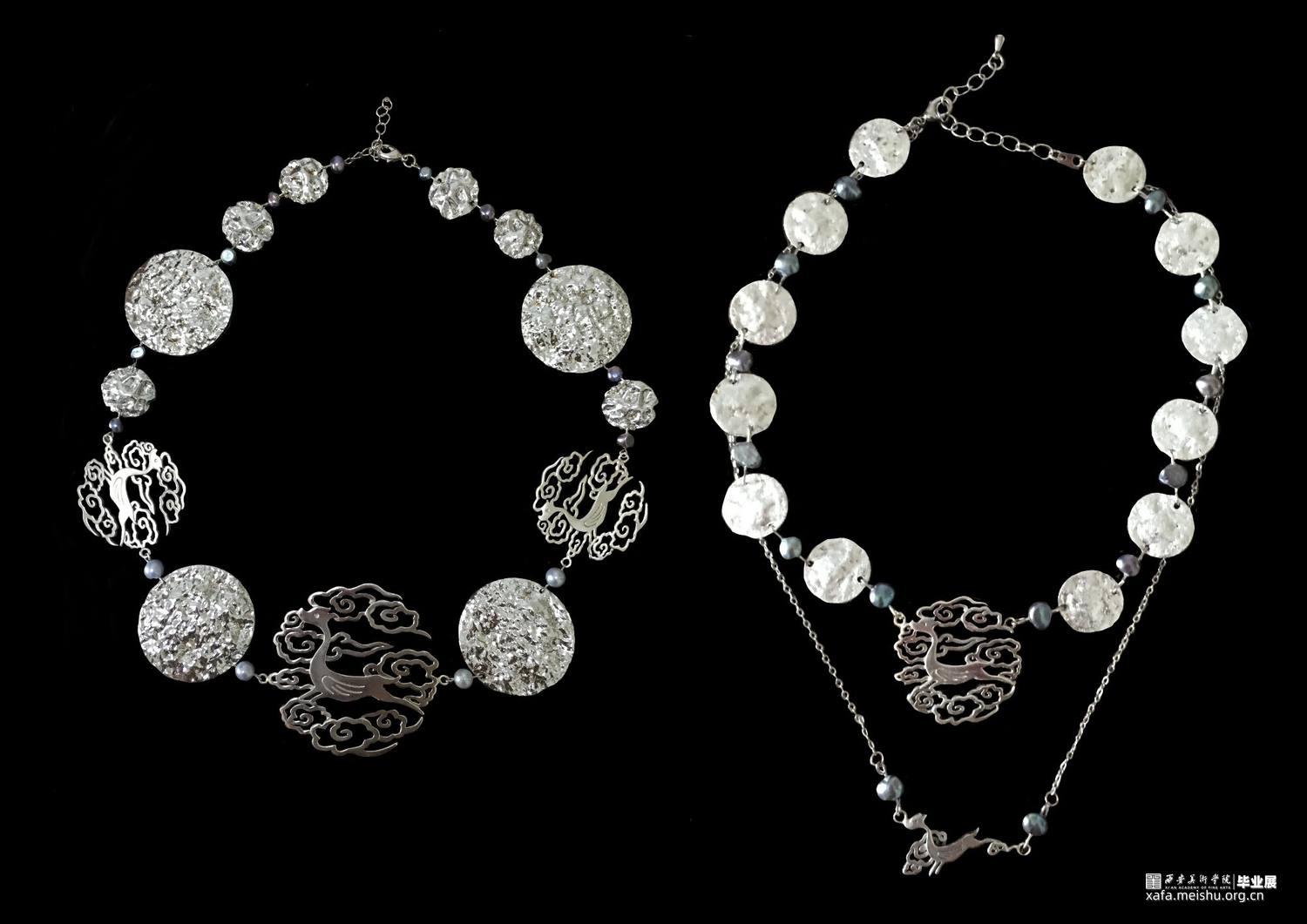 中国古代有翼神兽中的飞廉是一个巨大的美学宝库,飞廉的形象变化蕴含着前人丰富的想象力。借飞廉形象为灵感创作结合唐代“衔绶纹”的吉祥寓意,设计了“风伯”系列首饰。该系列首饰共有八件,分别为耳钉、项链、发卡和胸针。