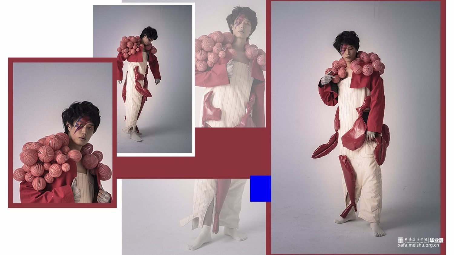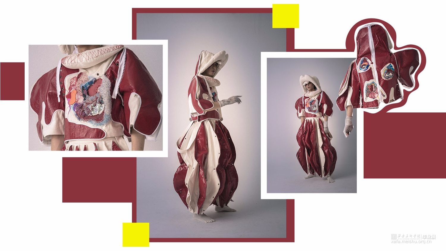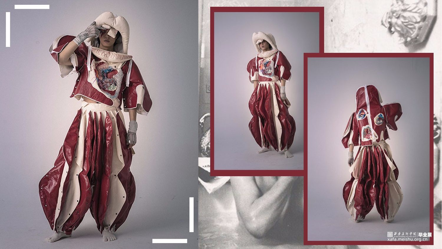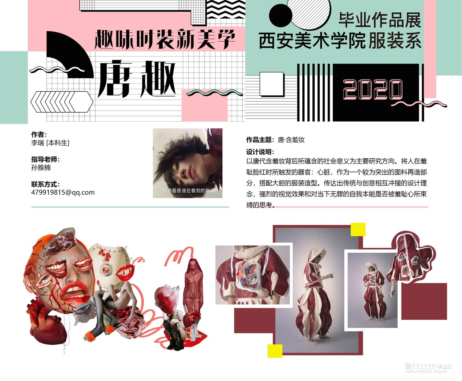 以唐代含羞妆背后所蕴含的社会意义为主要研究方向,将人在羞耻时所出发的器官:心脏,作为一个较为突出的面料再造部分,搭配大胆的服装造型。传达出传统与创意相互冲撞的设计理念,强烈的视觉效果和对当下无罪的自我本能是否被羞耻心所束缚的思考。。
