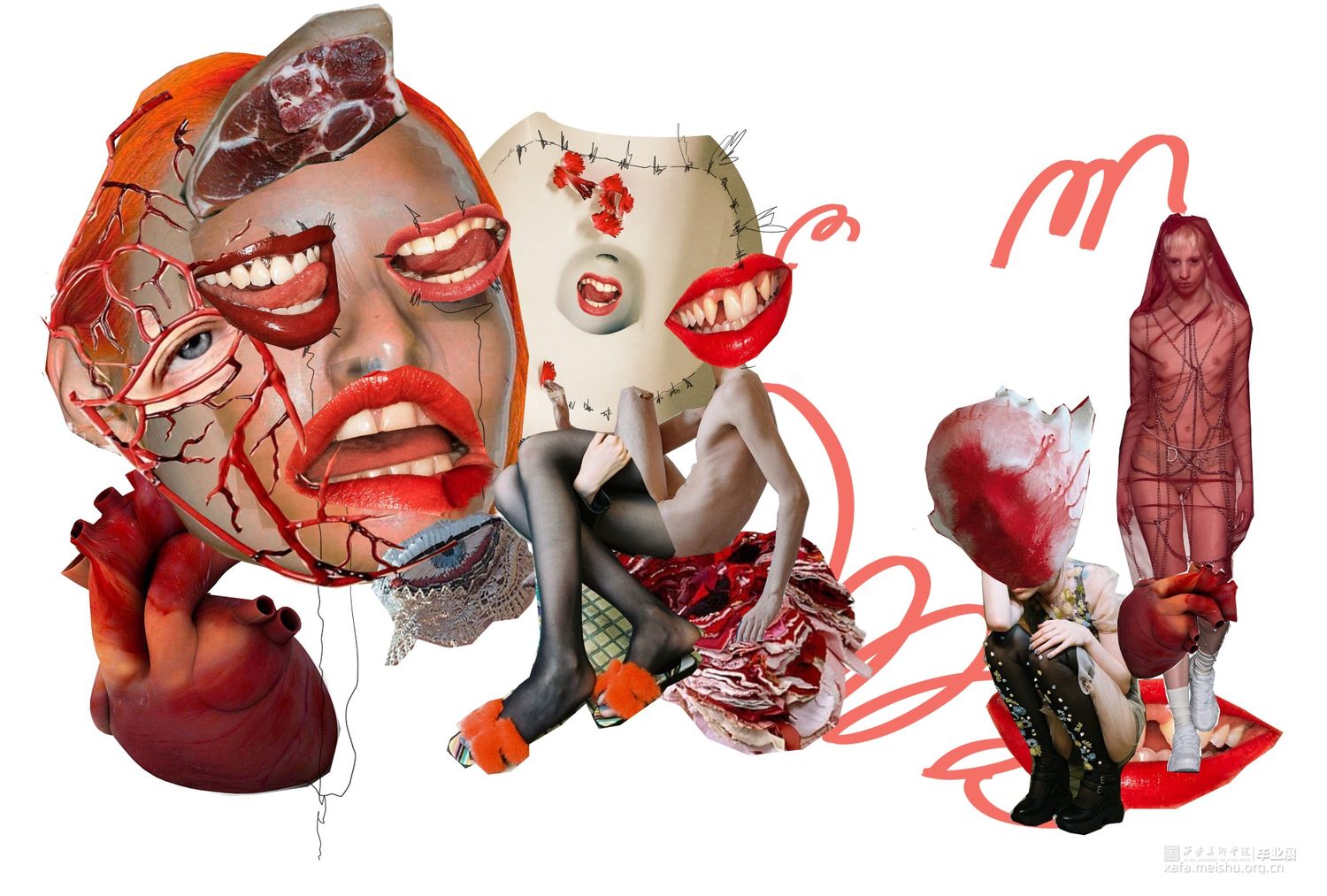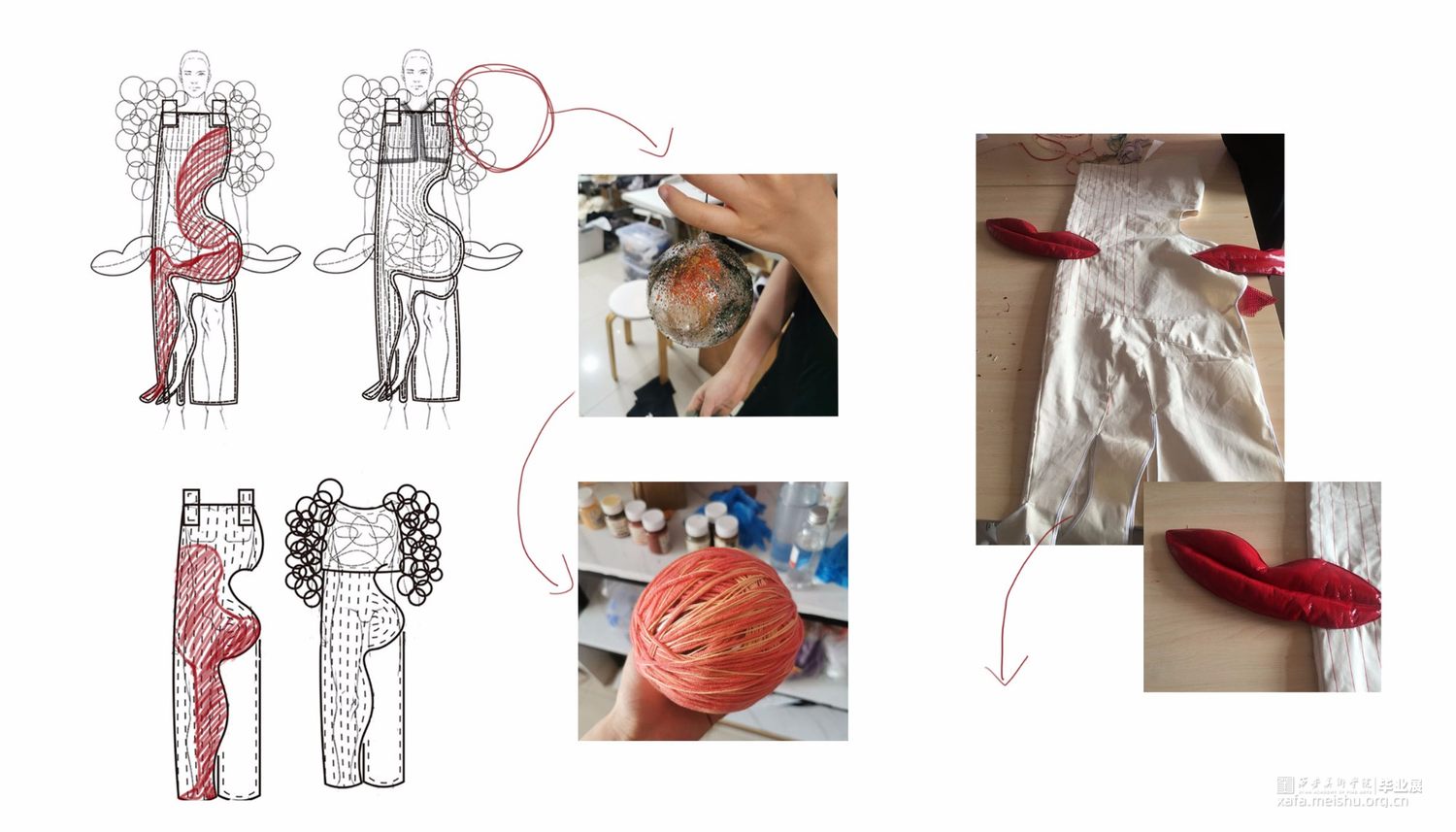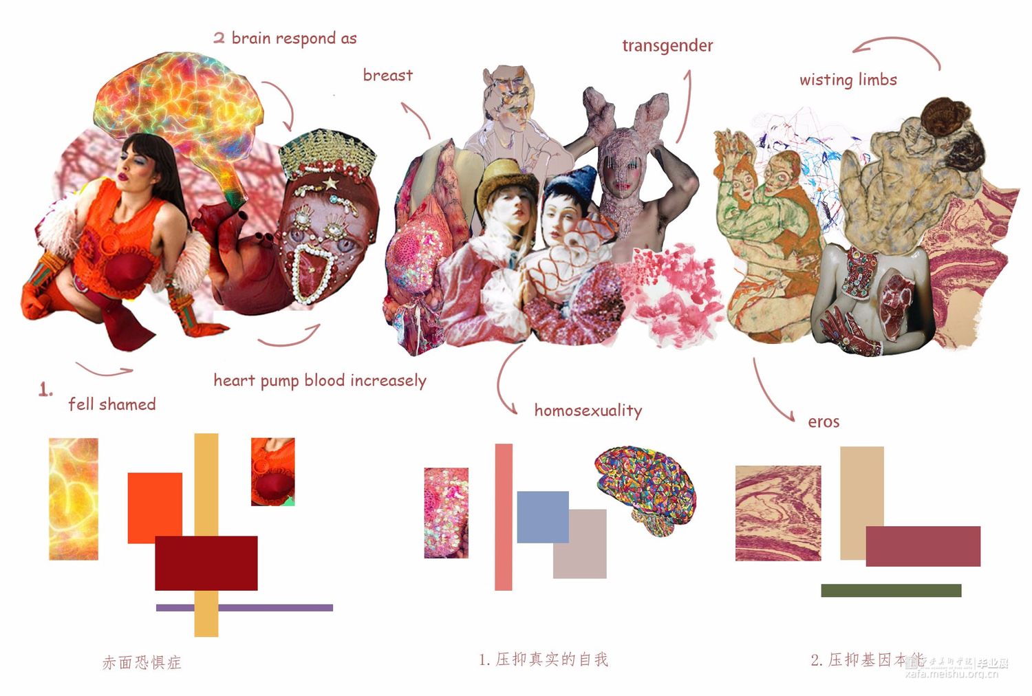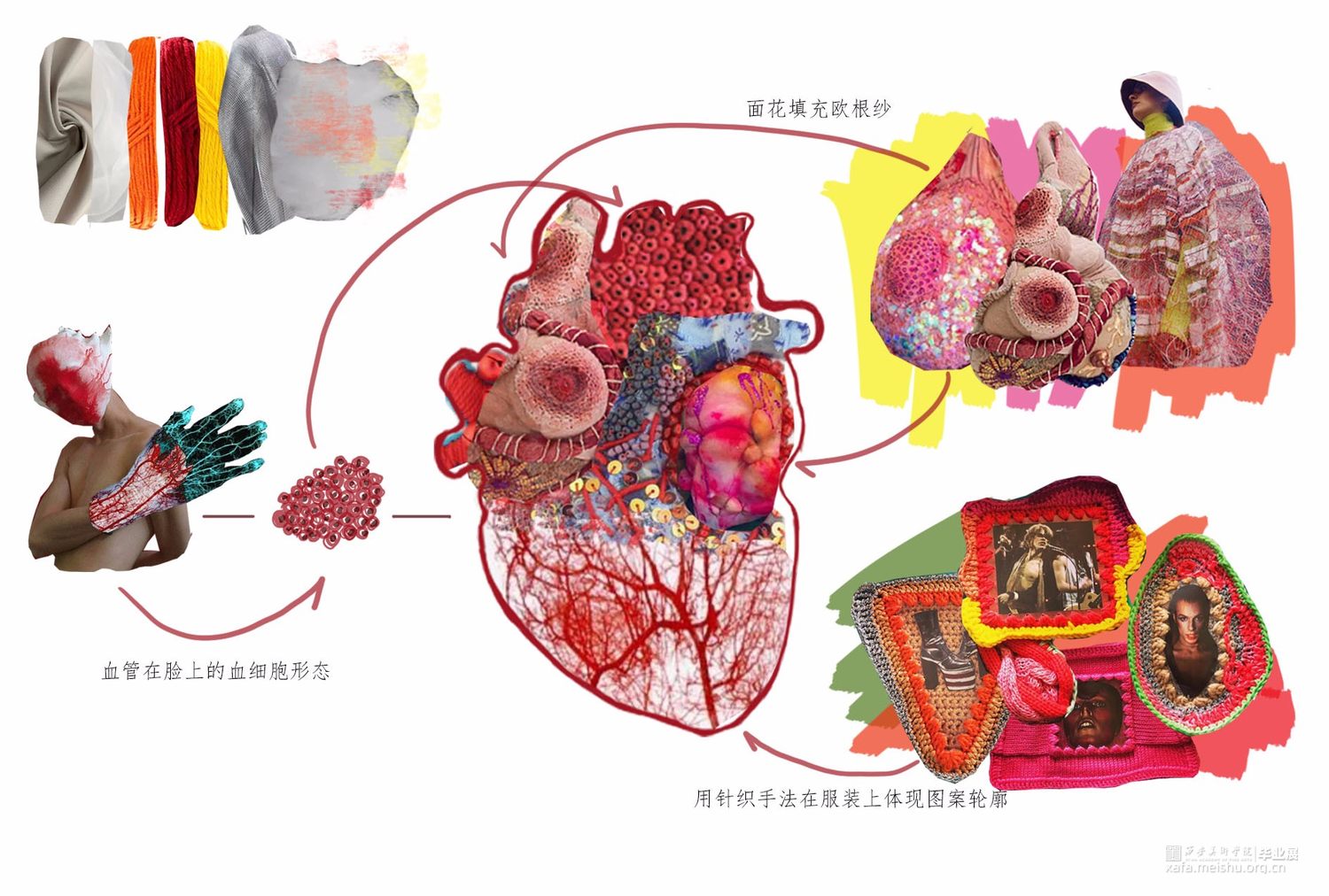 以唐代含羞妆背后所蕴含的社会意义为主要研究方向,将人在羞耻时所出发的器官:心脏,作为一个较为突出的面料再造部分,搭配大胆的服装造型。传达出传统与创意相互冲撞的设计理念,强烈的视觉效果和对当下无罪的自我本能是否被羞耻心所束缚的思考。。