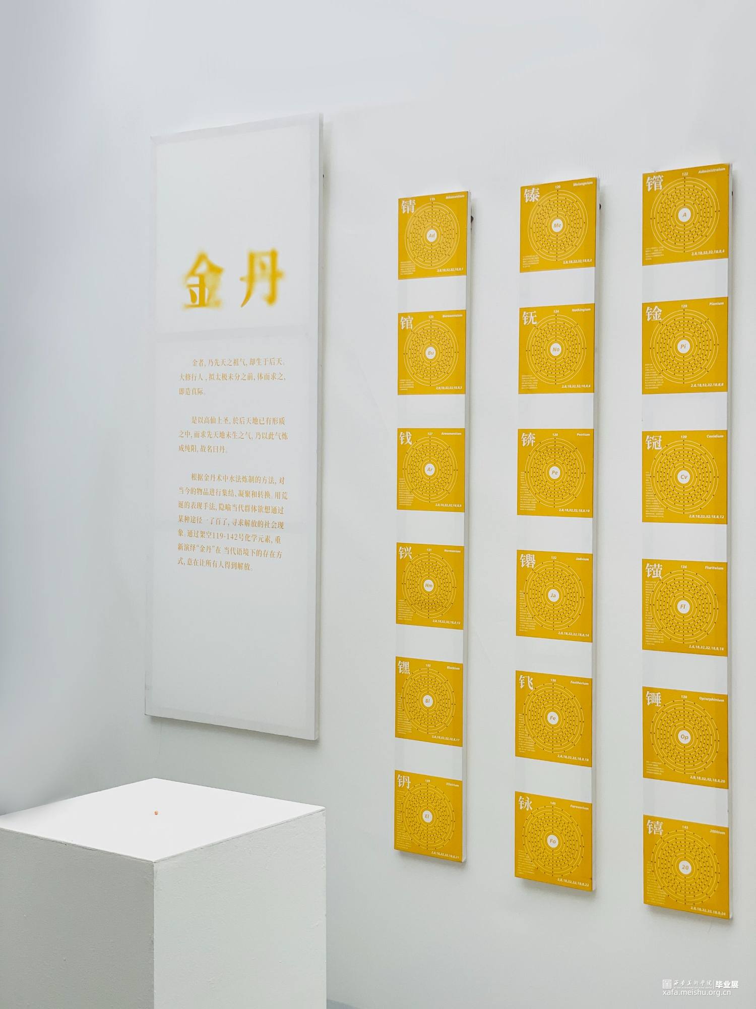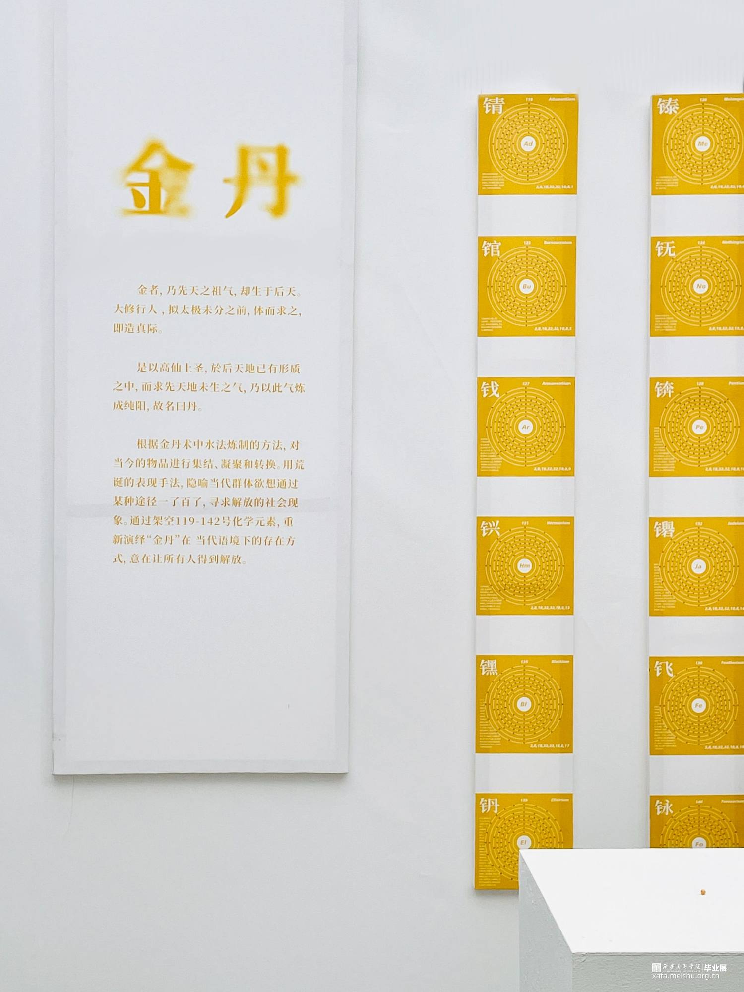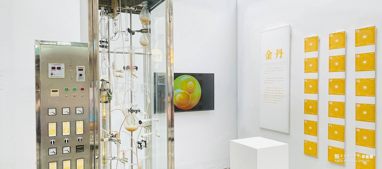 装置根据金丹术中水法炼丹的方法,对当今世界万物进行集结、凝聚和转换。用荒诞的表现手法,通过现代化学仪器重现了炼丹炉。隐喻当代群体欲想通过某种途径一了百了,寻求解放的社会现象。架空119-142号化学元素 ,重新演绎 “金丹”在当代语境下的存在方式,意在让所有人得到解放。