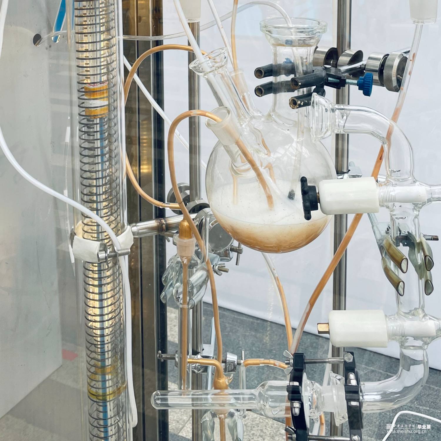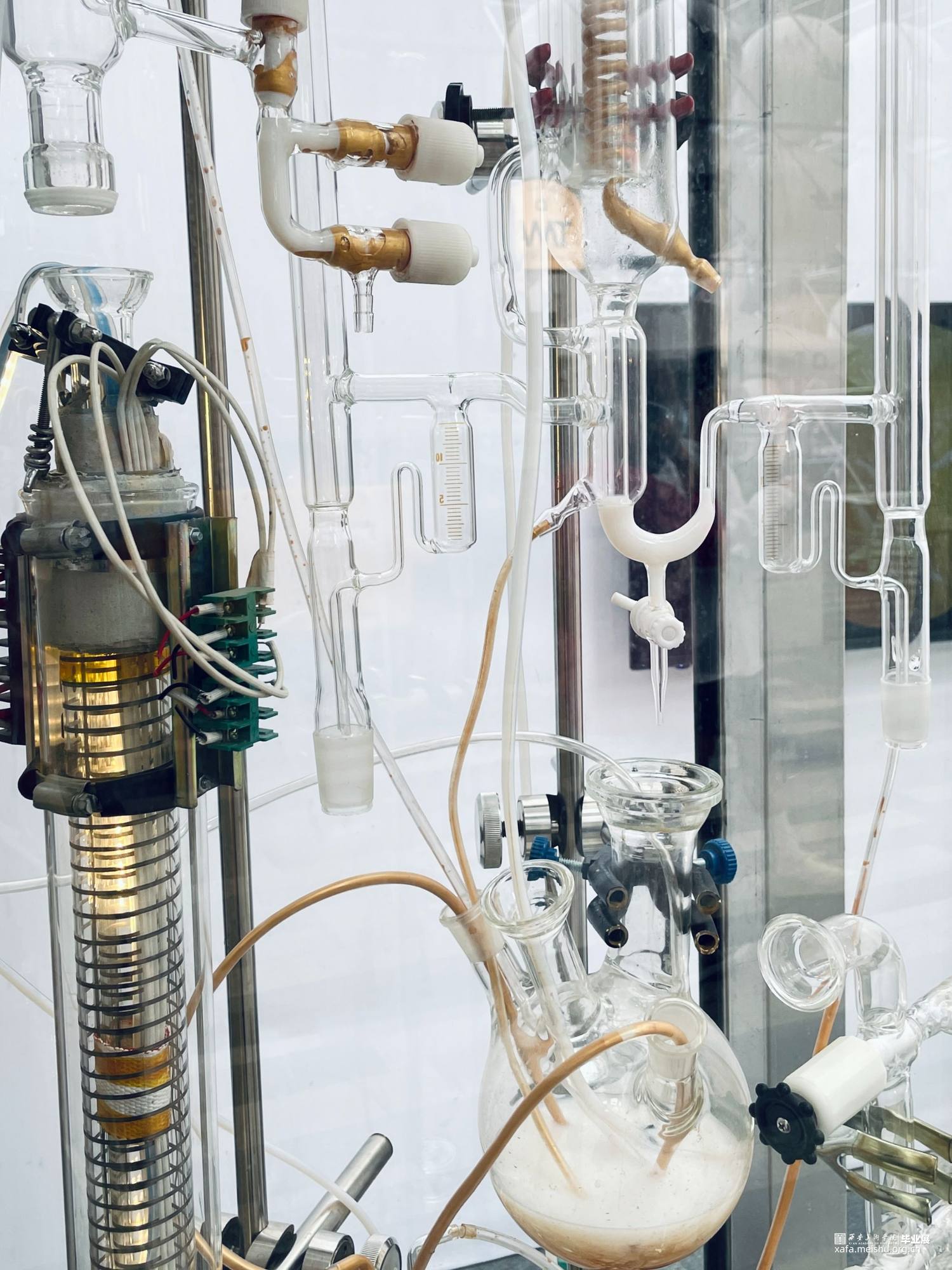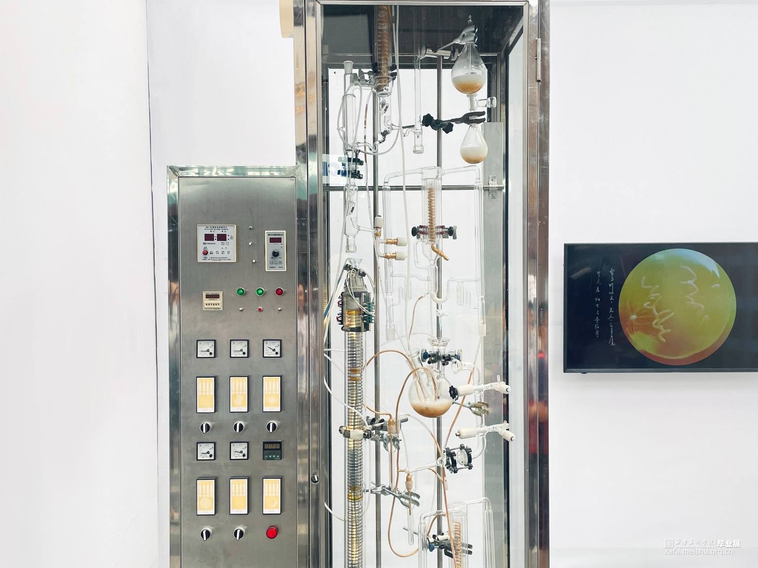 装置根据金丹术中水法炼丹的方法,对当今世界万物进行集结、凝聚和转换。用荒诞的表现手法,通过现代化学仪器重现了炼丹炉。隐喻当代群体欲想通过某种途径一了百了,寻求解放的社会现象。架空119-142号化学元素 ,重新演绎 “金丹”在当代语境下的存在方式,意在让所有人得到解放。