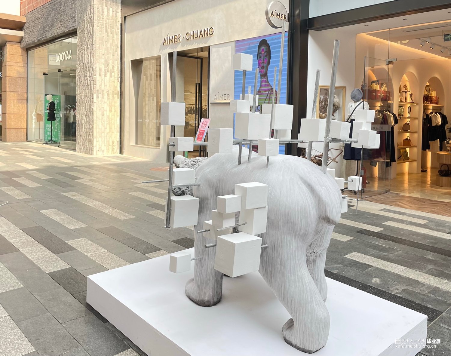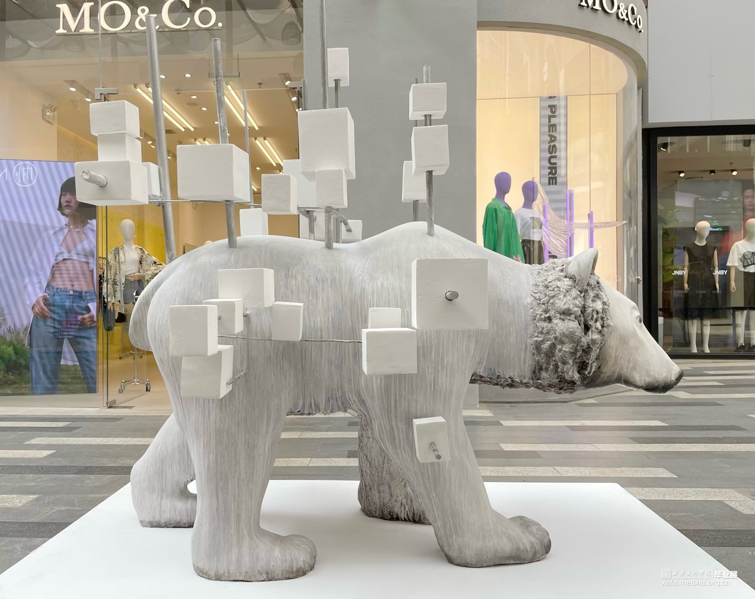 我对其做出一种材料反差,利用脚手架钢管、钢筋、水泥块,建立在人类的行为上,给它做了一个固化的新的形态的可能性以及串联,穿插在熊的体内,构成材料并致,重构一种文化价值导向的审视,对生命本质的审视,隐喻我们干预后所呈现的一个形态悖论。这也是对于人类个体、认知功能、自然属性的并致。