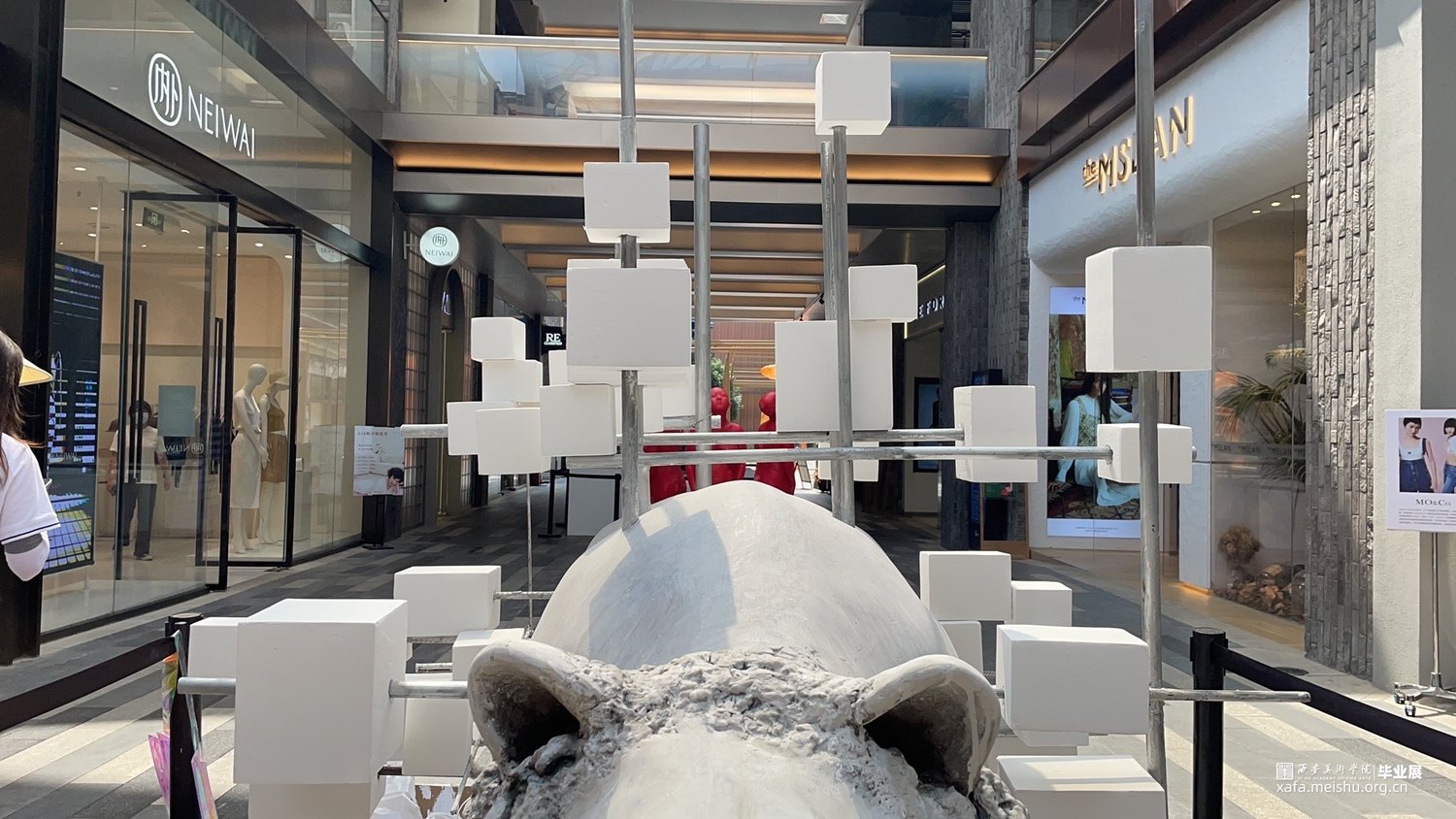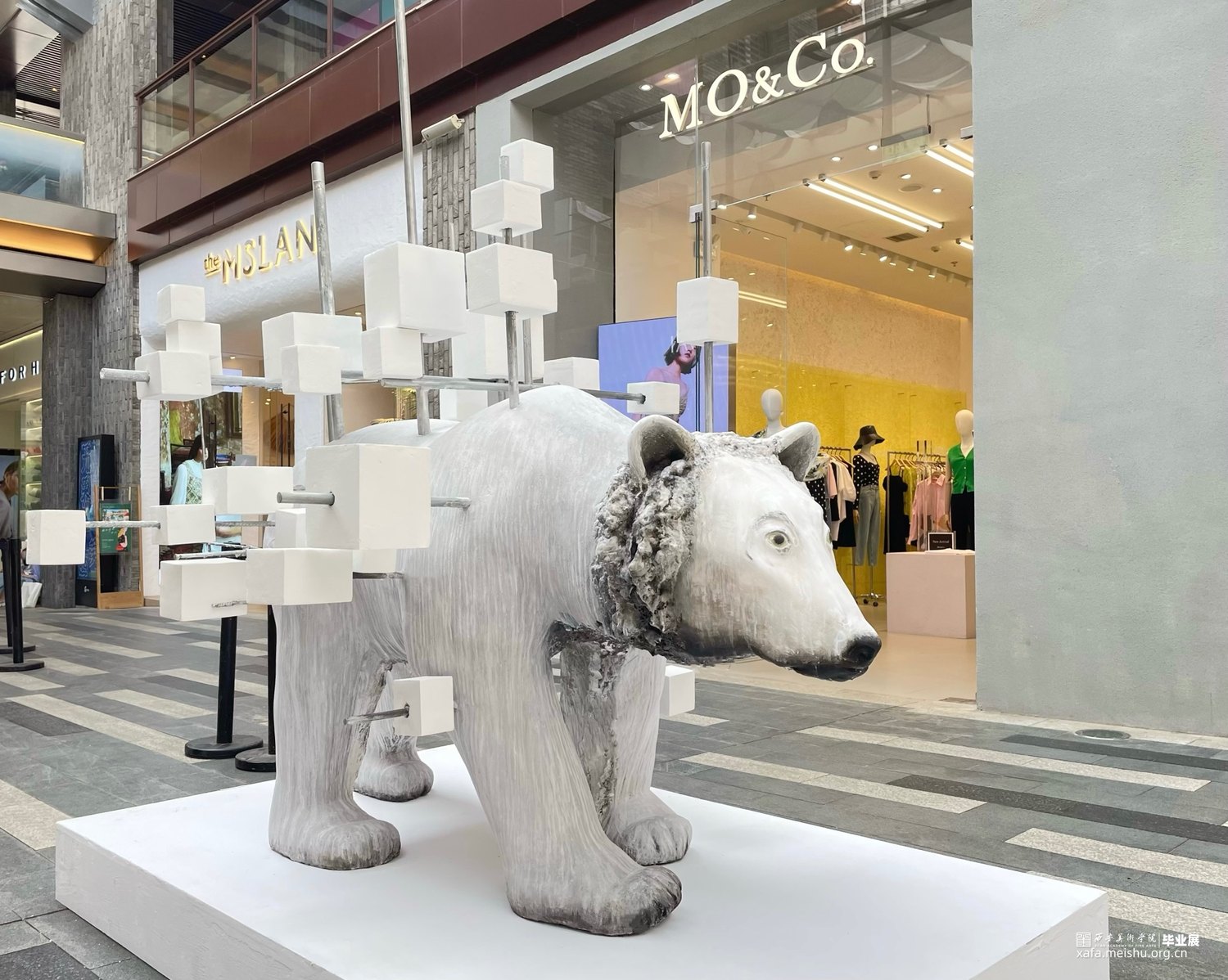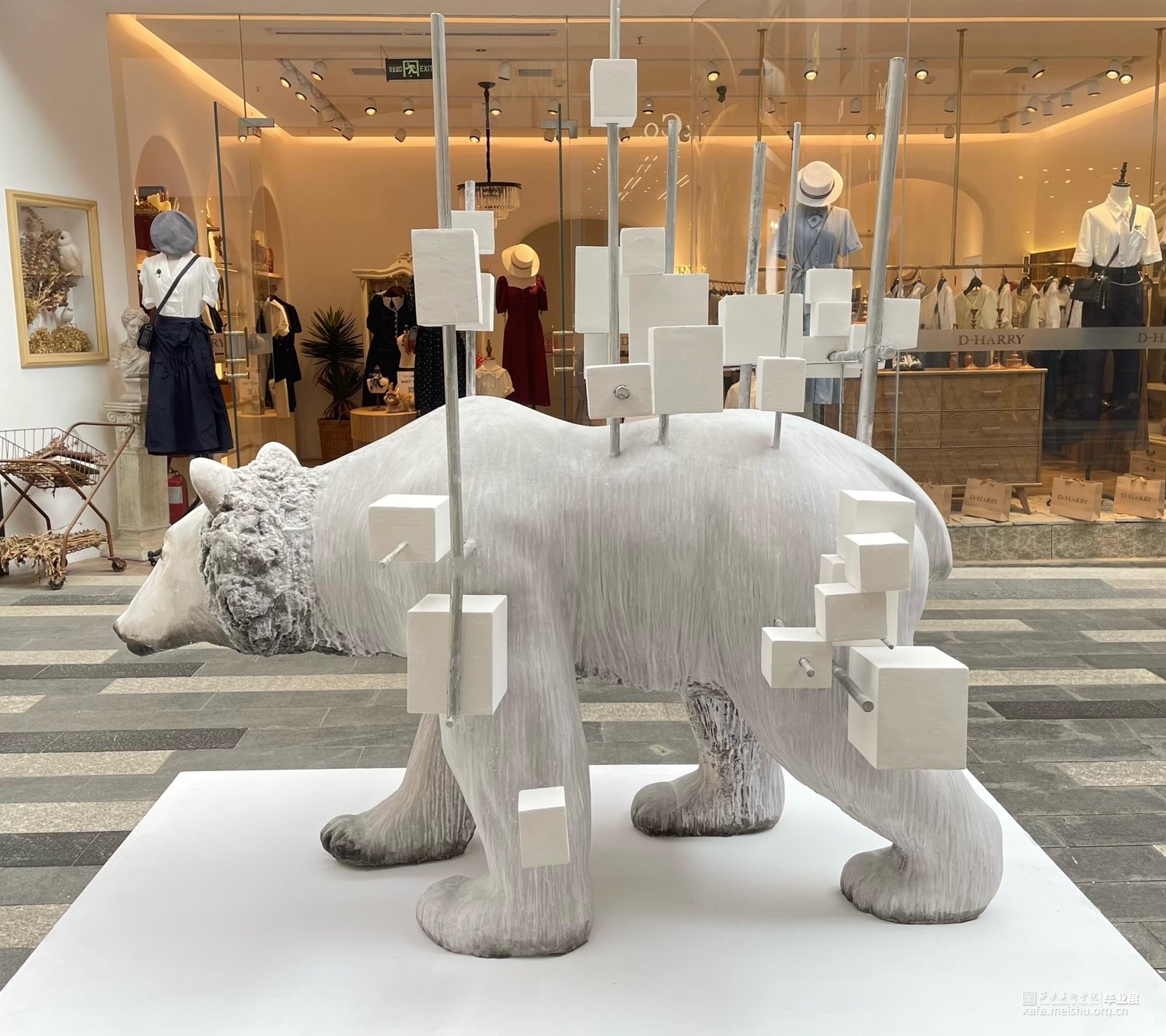 我对其做出一种材料反差,利用脚手架钢管、钢筋、水泥块,建立在人类的行为上,给它做了一个固化的新的形态的可能性以及串联,穿插在熊的体内,构成材料并致,重构一种文化价值导向的审视,对生命本质的审