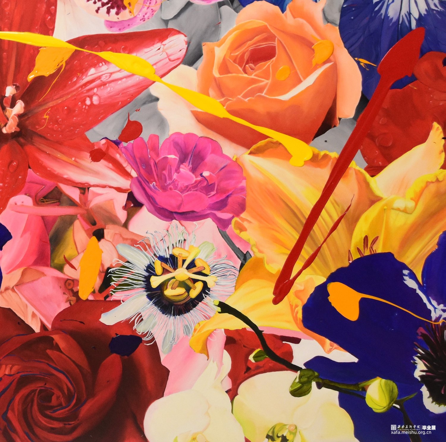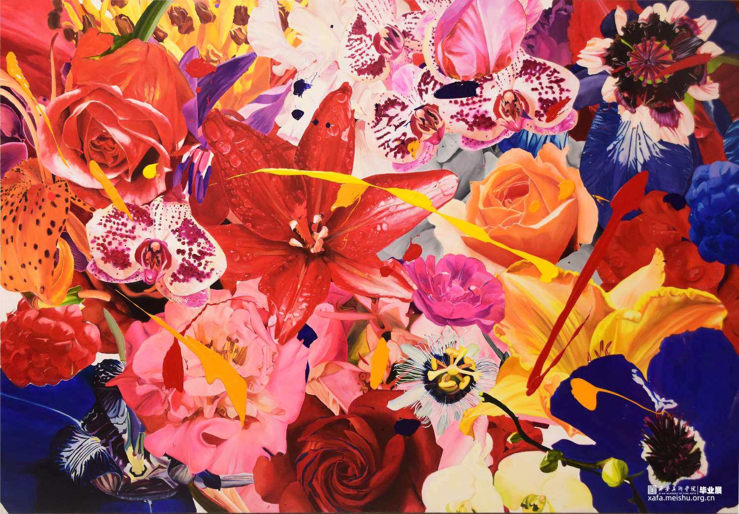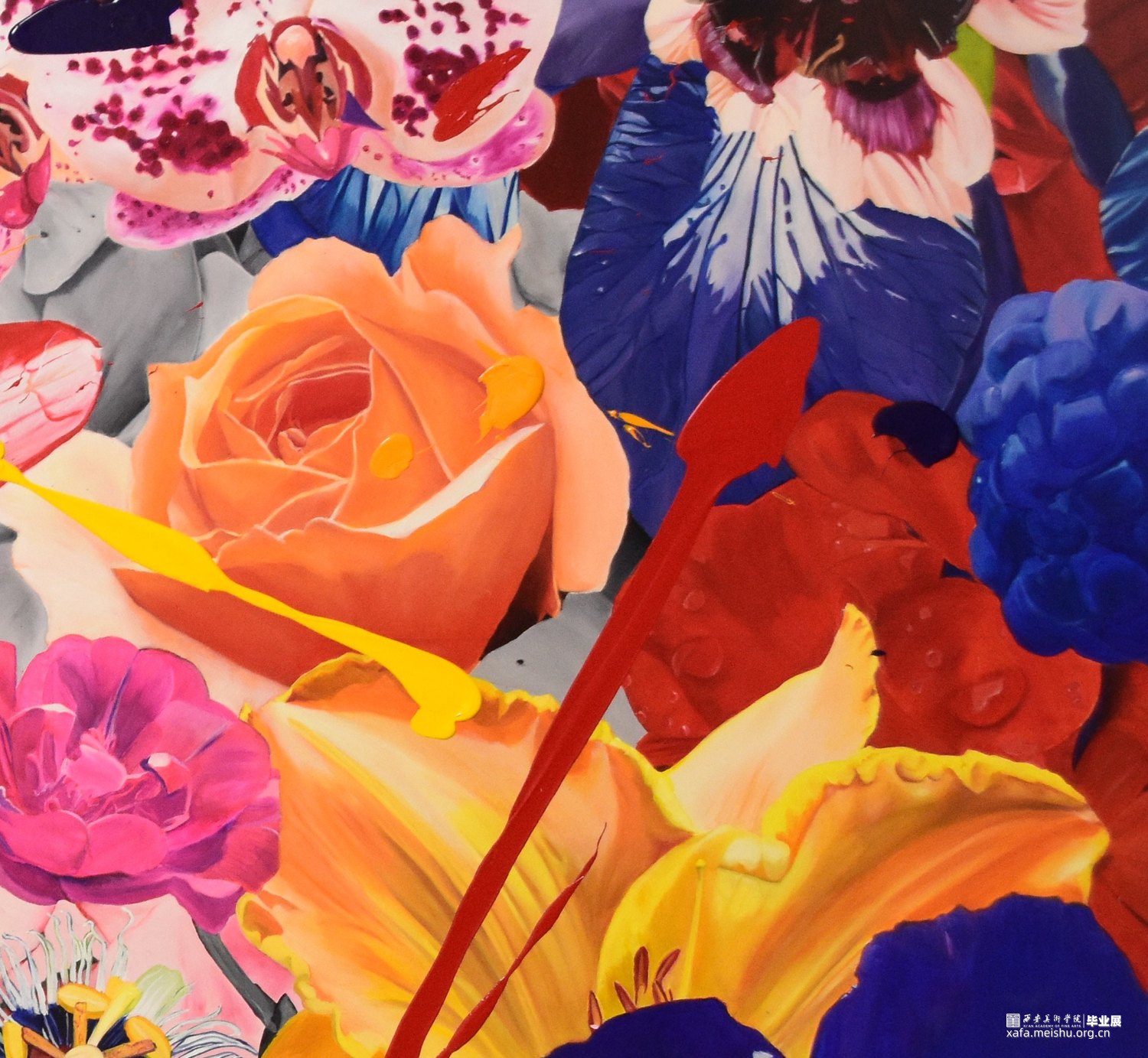 作品《繁》选择了色谱中最为强烈的颜色为主体,用写实的手法绘制一组盛开的花朵,“花”有着极尽绚烂与脆弱双重矛盾语义,恰好贴合了我对于生命的理解与思考。生命从诞生到寂灭,正如这些夺目的颜料随着时间的推移,回归泥土一样,在这个过程中,作为我们,无能为力。
