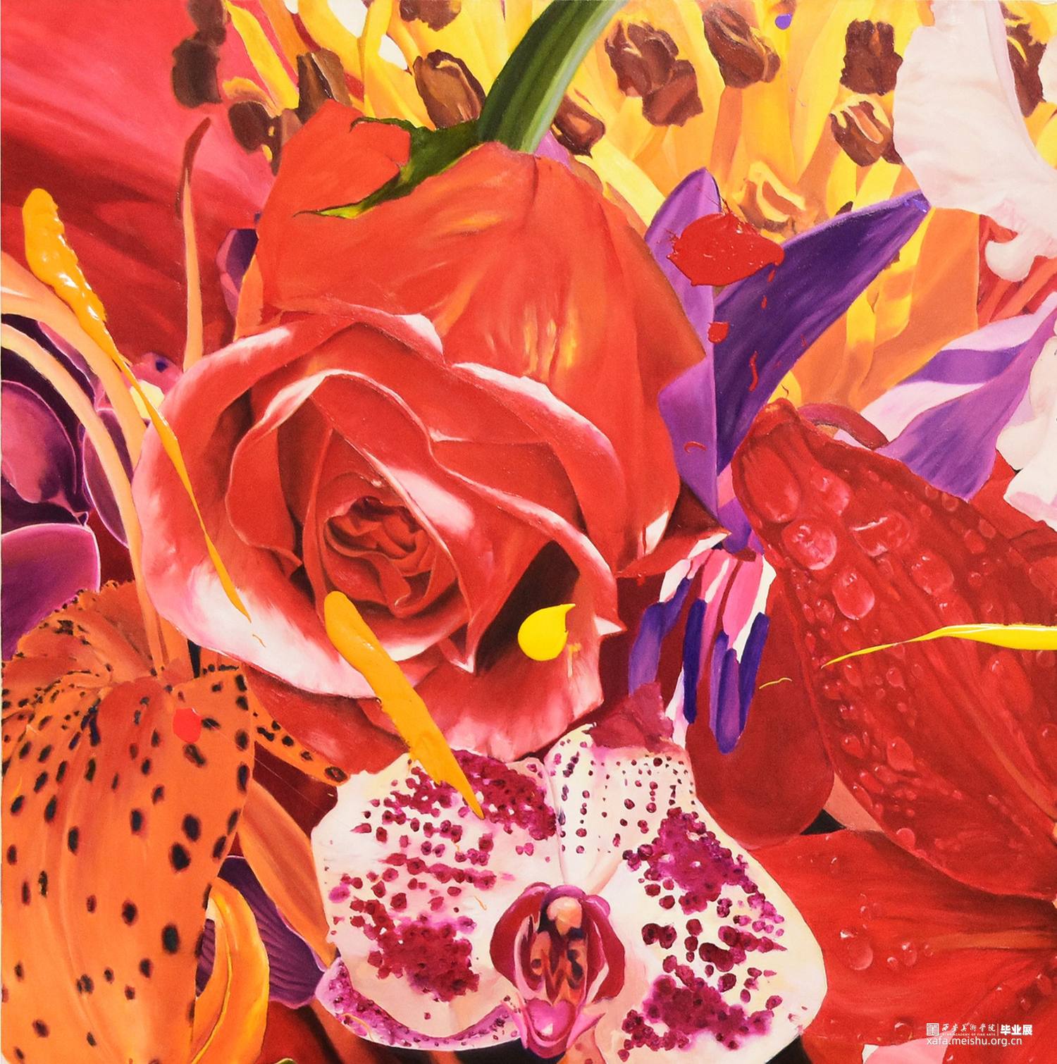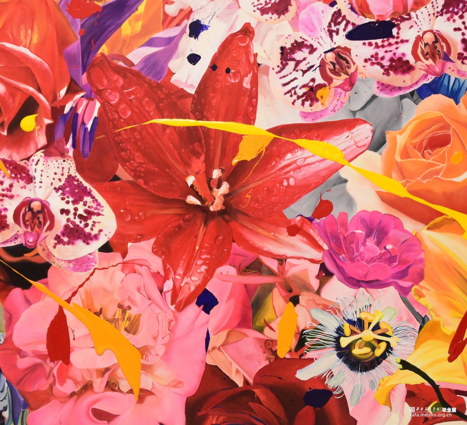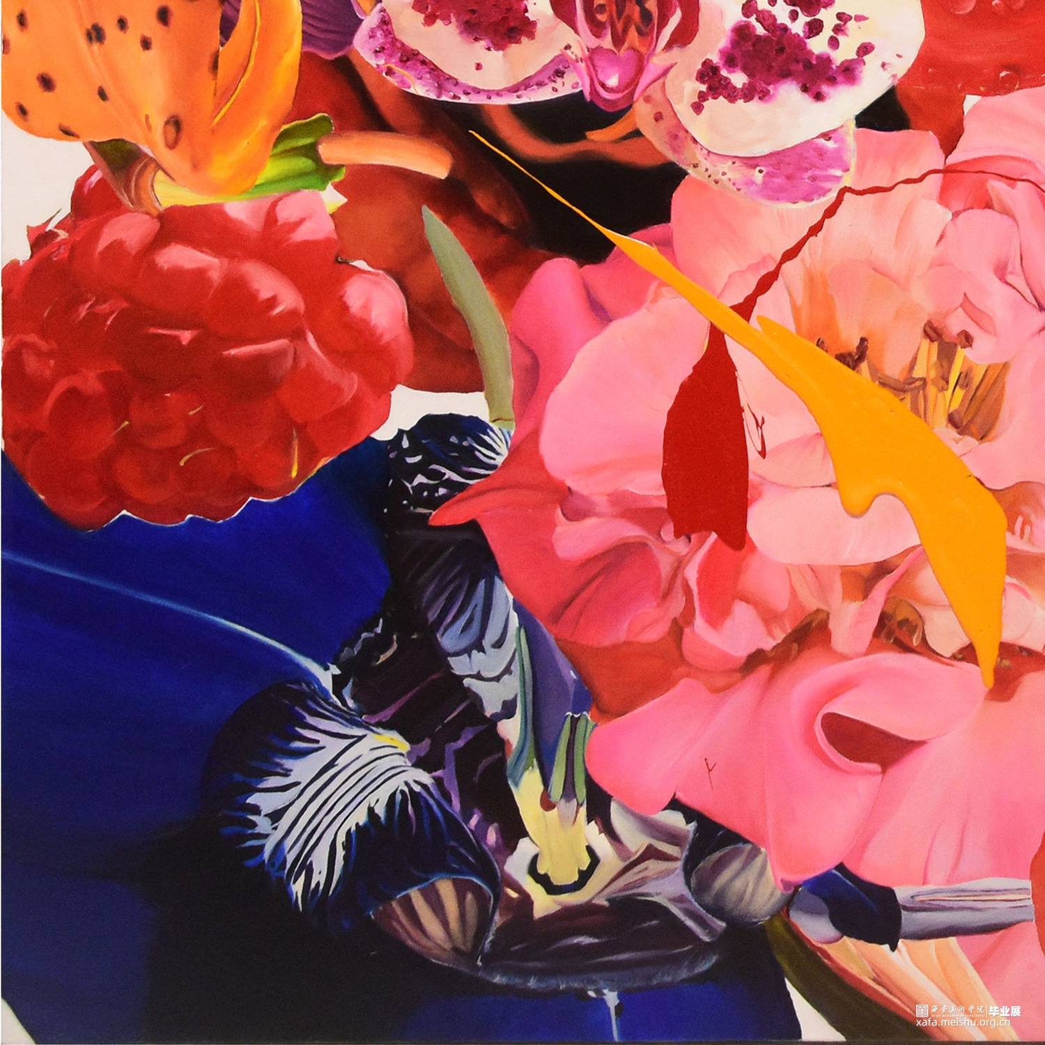 作品《繁》选择了色谱中最为强烈的颜色为主体,用写实的手法绘制一组盛开的花朵,“花”有着极尽绚烂与脆弱双重矛盾语义,恰好贴合了我对于生命的理解与思考。生命从诞生到寂灭,正如这些夺目的颜料随着时间的推移,回归泥土一样,在这个过程中,作为我们,无能为力。
