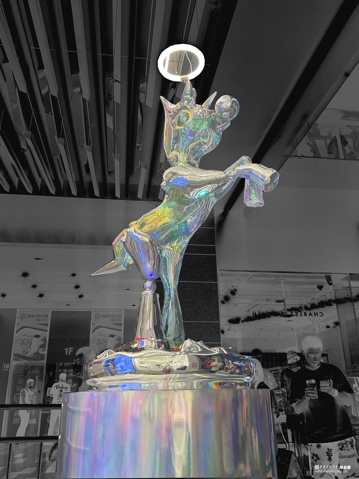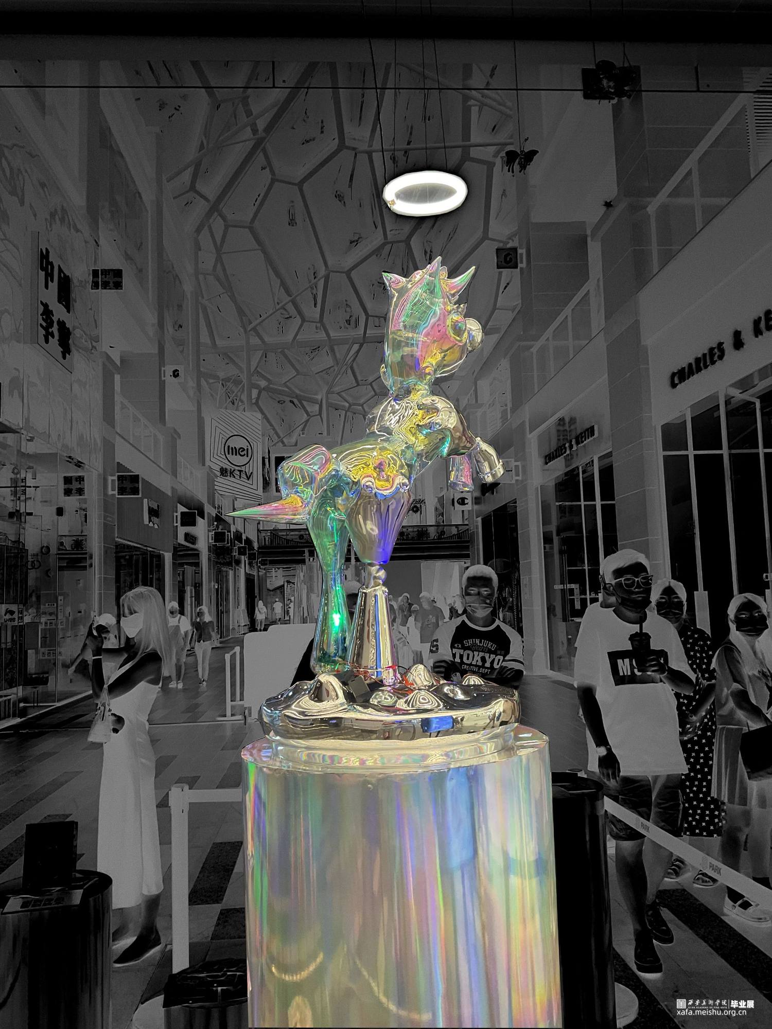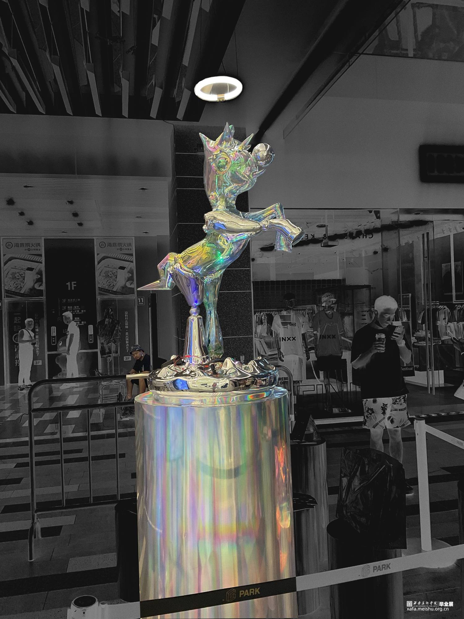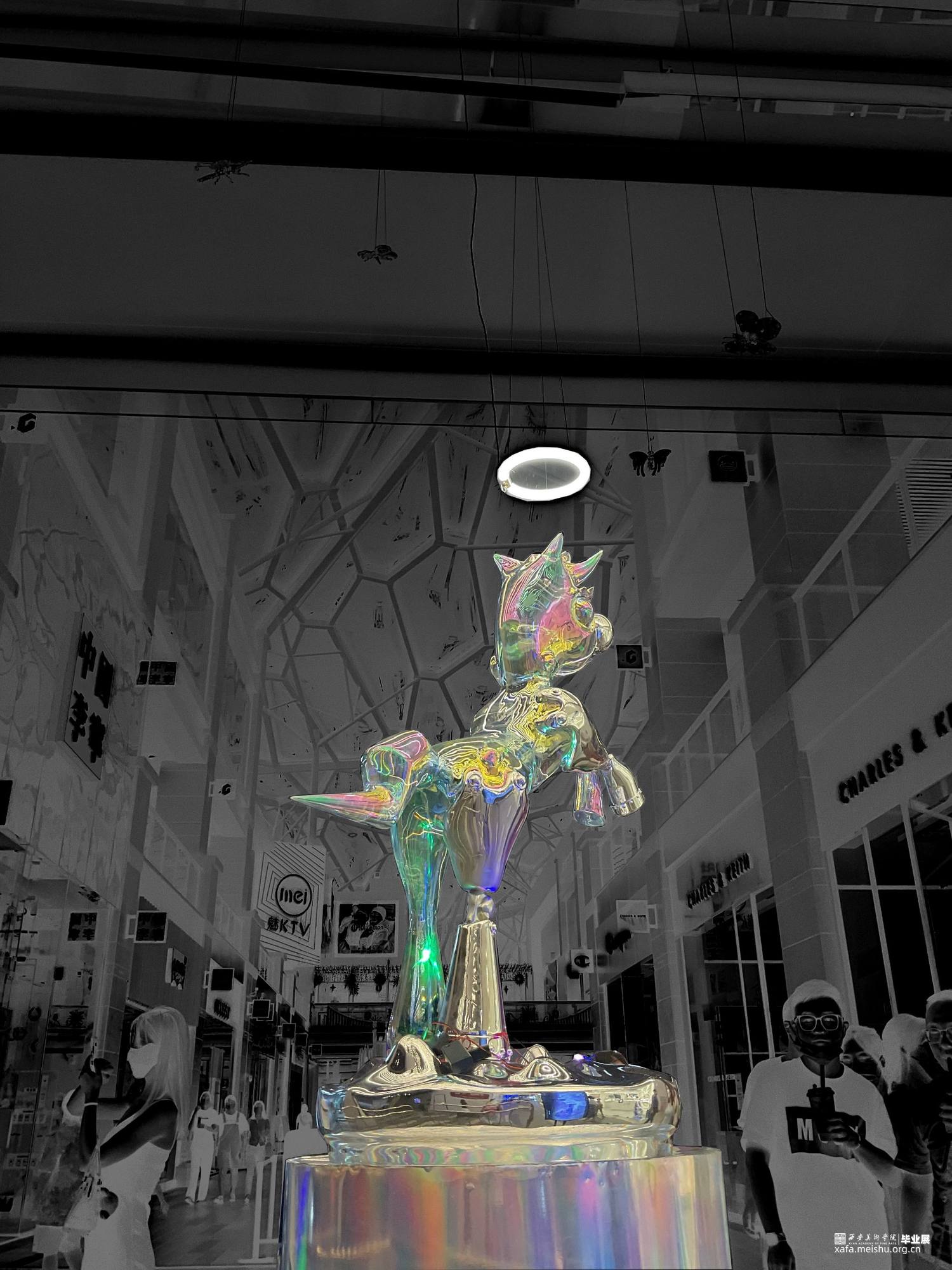 疫情下,人们处于封闭忧郁的情绪中,溺水小马就像梦幻药剂,在虚幻空间中塑造一个自由小马欢脱的情景,给人们以疗愈。彩色的小马在无序的环境中产生有序的游走,在虚幻与现实的梦境穿梭,创造出一个没有绿码、没有疫情与灾难的乌托邦的理想世界.