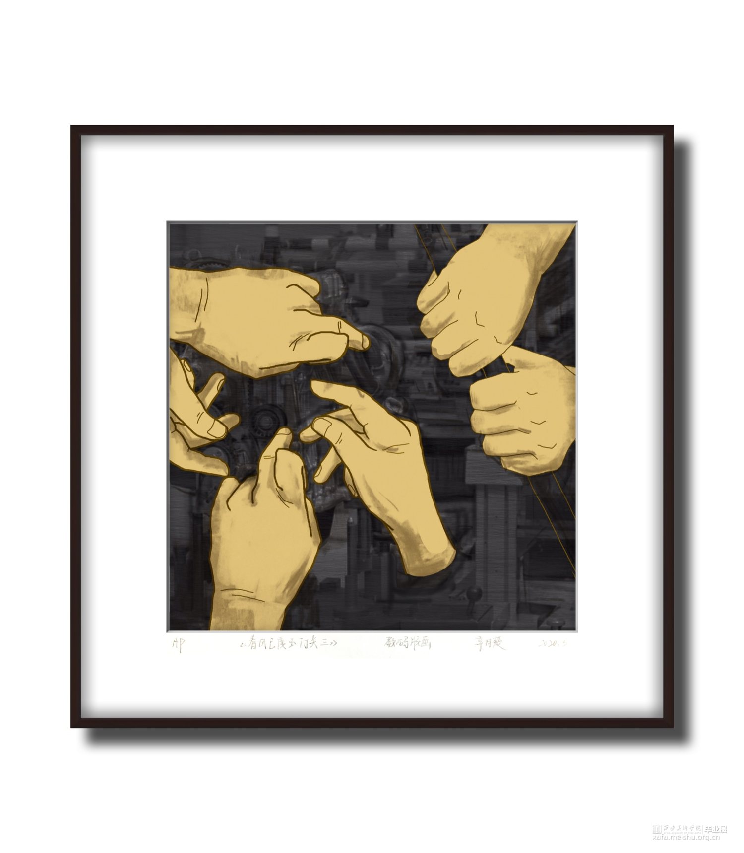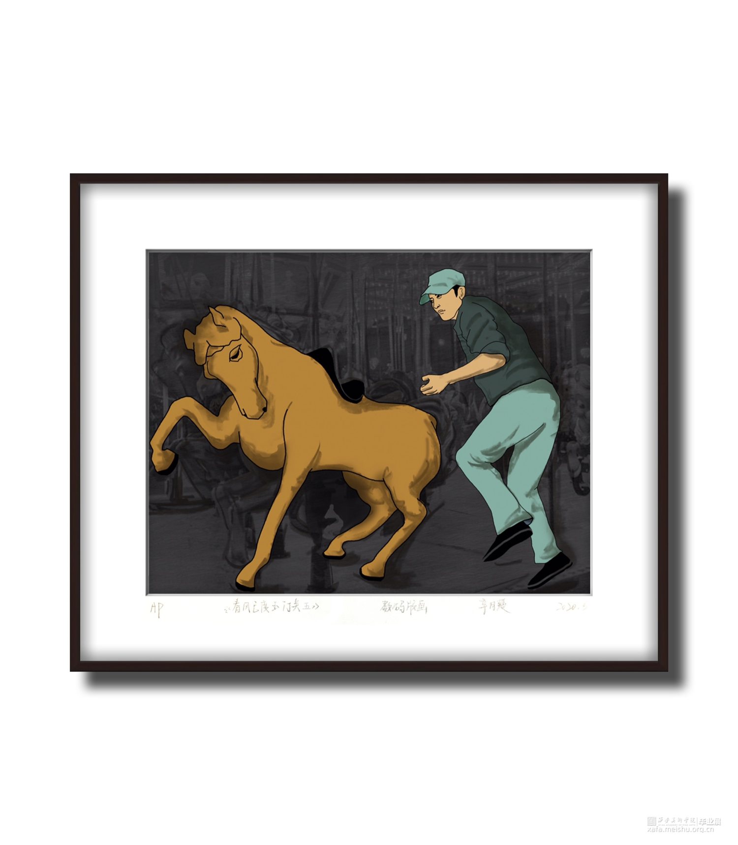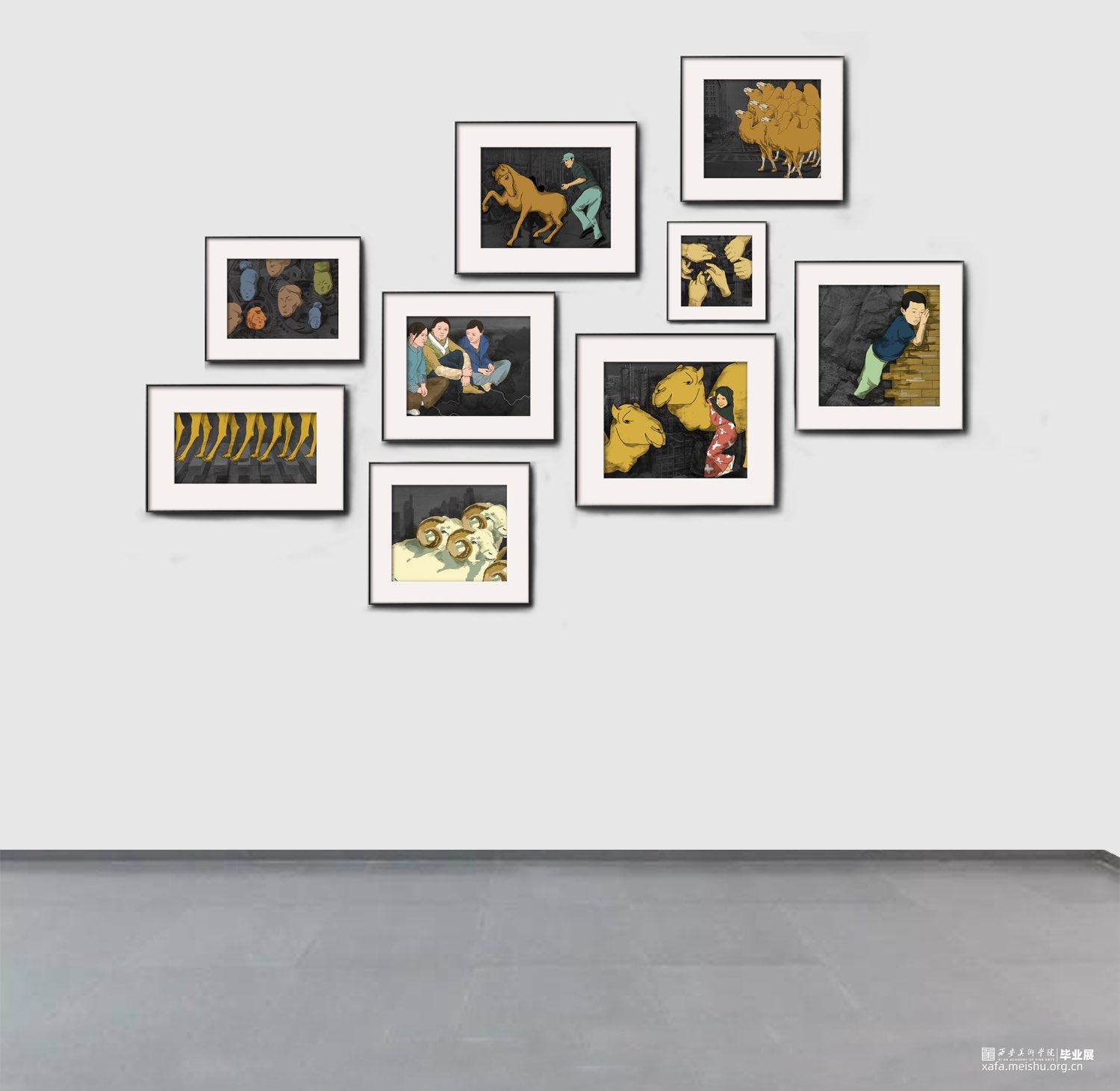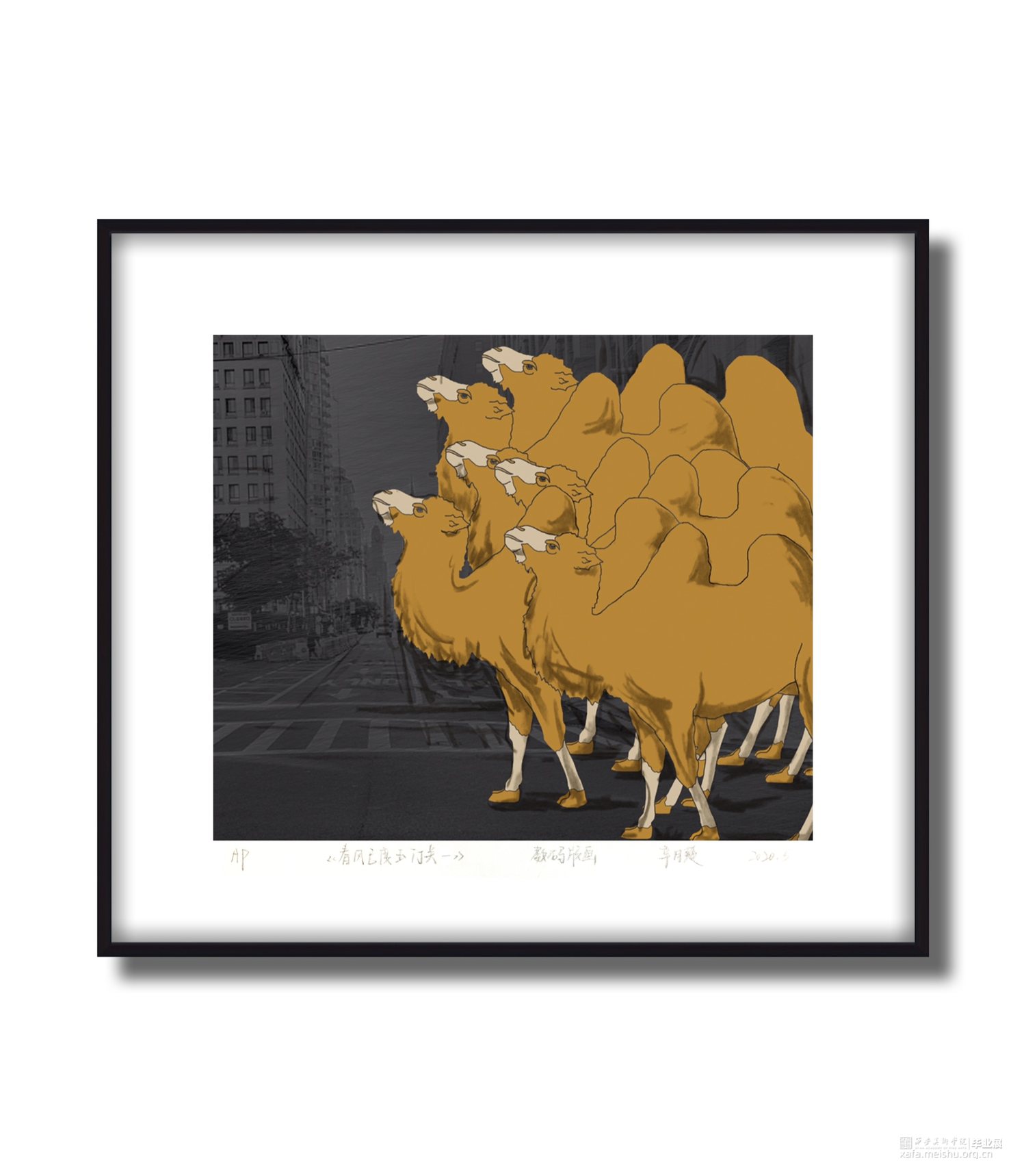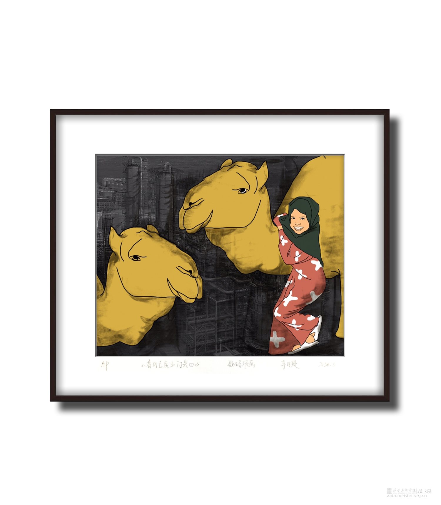 此次创作以我的视角从西部出发,在我的亲身体验游览中发现,西部受到现在文明的影响正在以飞快的速度发展,已不是人们刻板印象中的贫瘠地区,西部也有大都市。并且人们的生活也已不是为了温饱而作,饱含浓郁文化地区的人民也同样在享受生活,仿佛一阵春风为甘肃地区焕发了蓬勃生机。作品《春风已度玉门关》系列以平面图像与黑白影像背景相结合的方式,在内容与色彩的双重对比上,突出甘肃地区的民风特色。作品采用暖黄色系,来表达当地独特的景色风貌与自然环境,使观者在画面中就能体会到浓烈的生活气息,在多元开放的当代的艺术领域表达思维观念的自由。